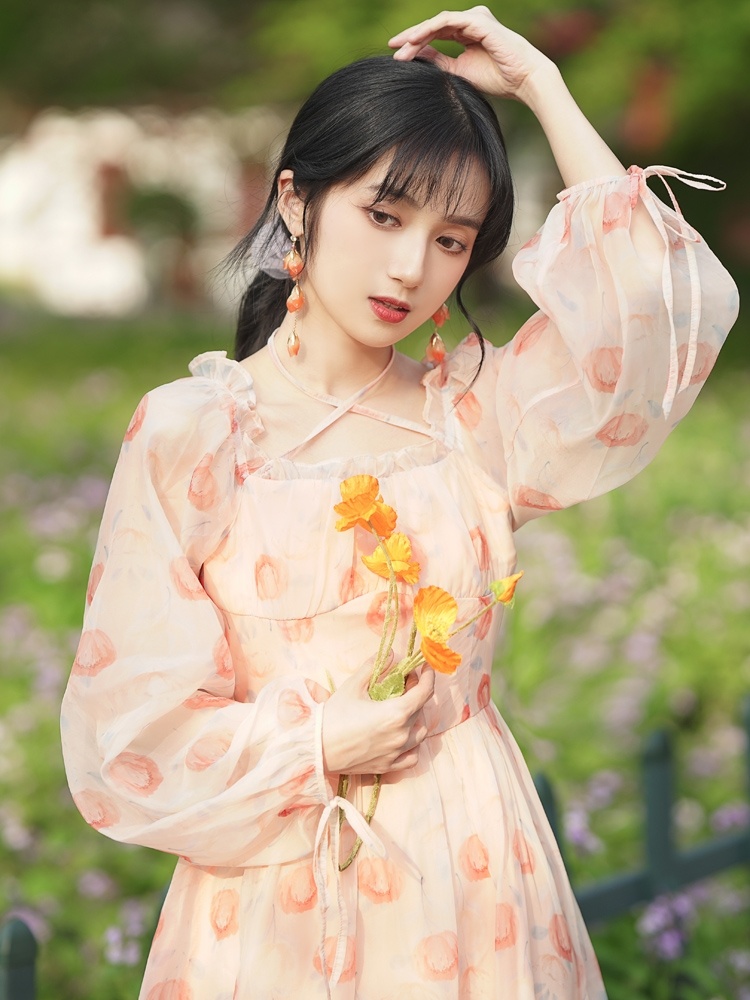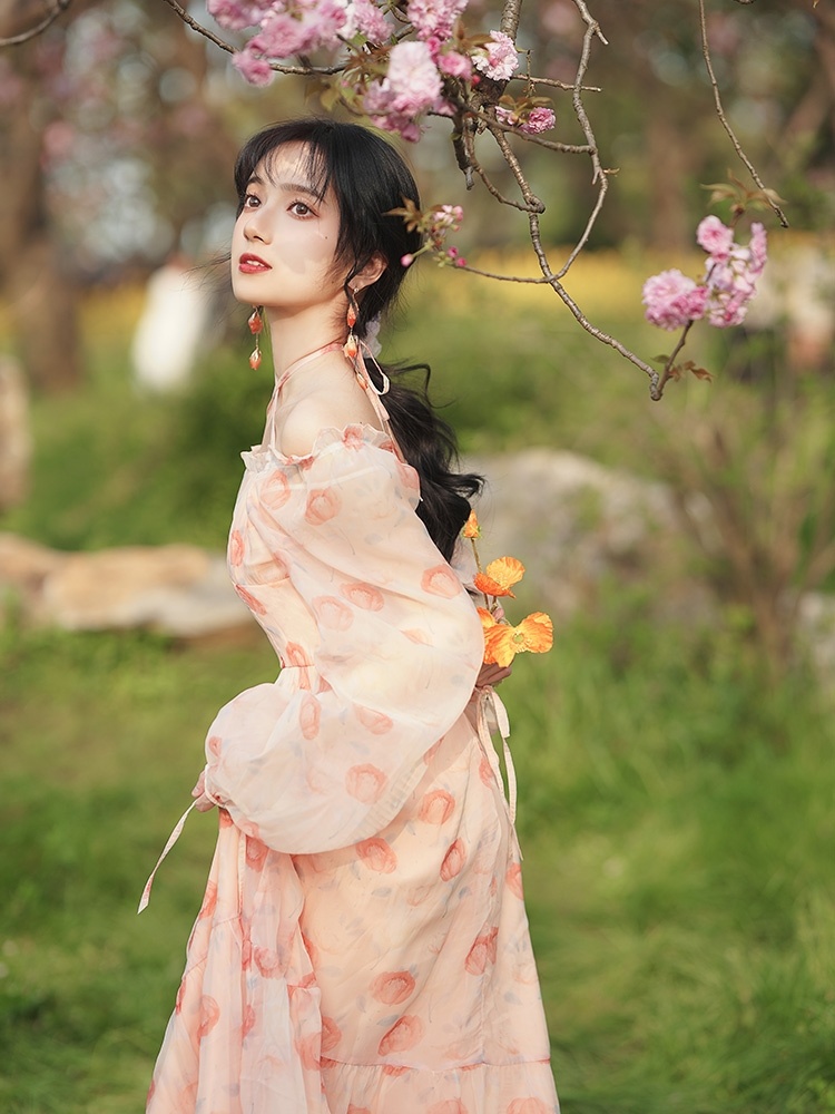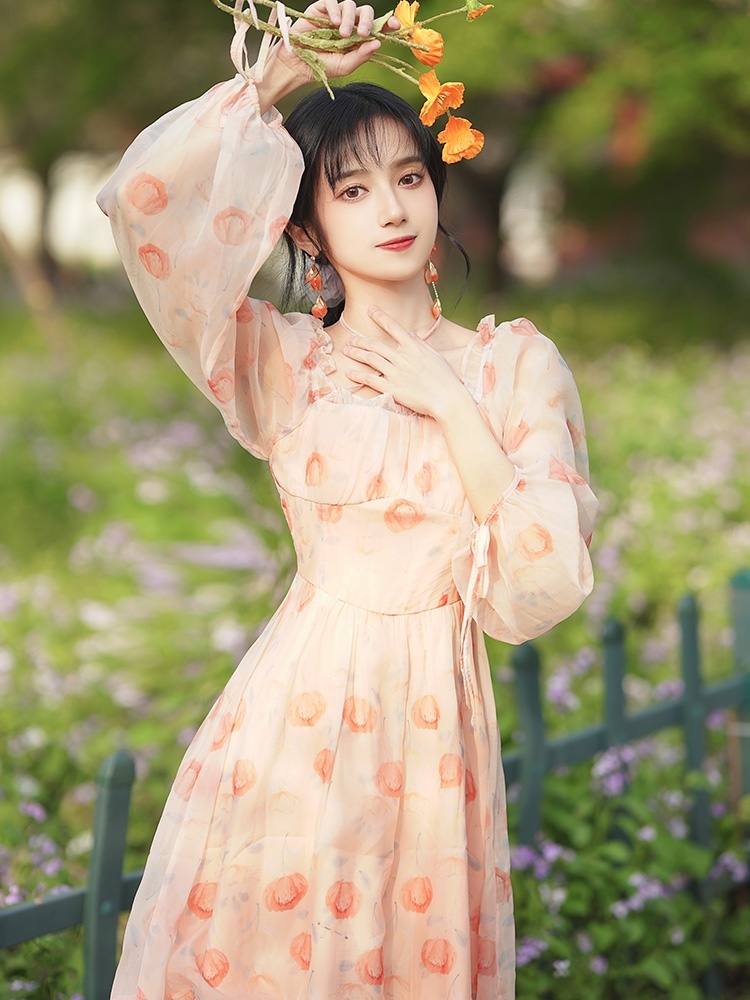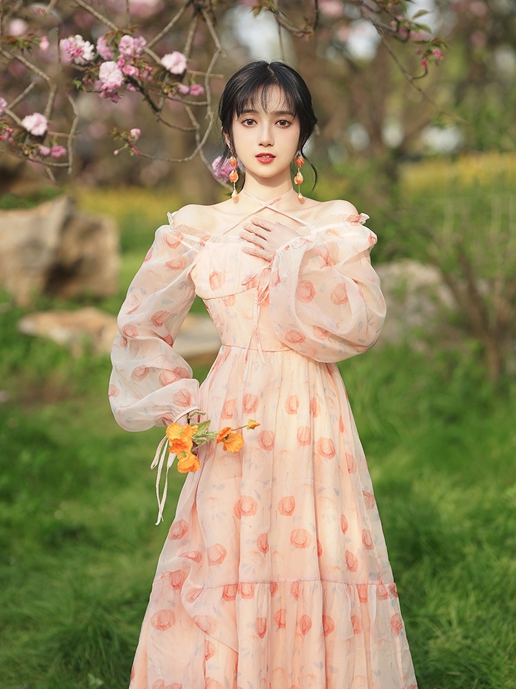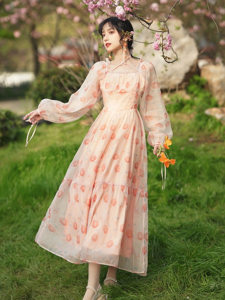 复古法式浪漫仙女粉色碎花裙a字连衣裙温柔长袖荷叶边裙