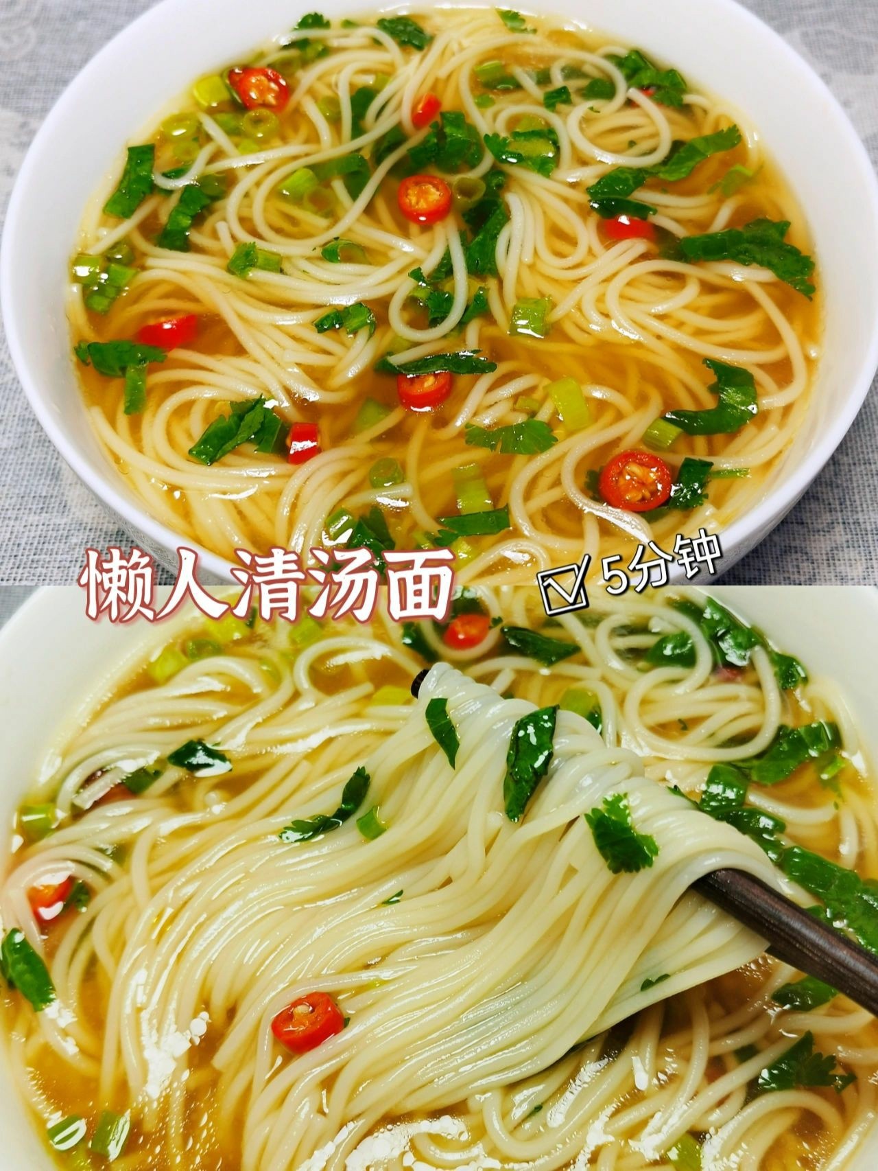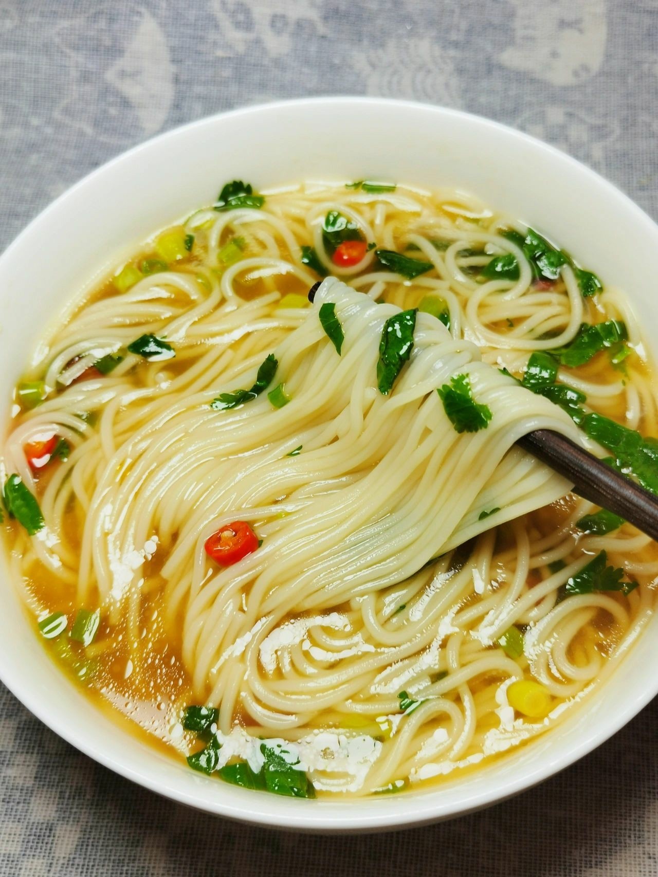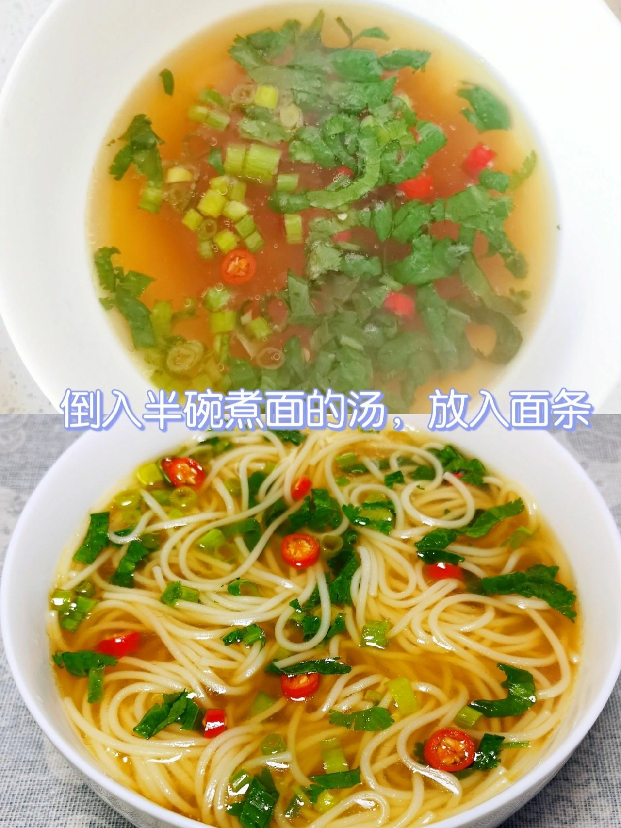 2⃣ 挂面煮熟,面汤倒入料汁里面,再放入面条就可以啦