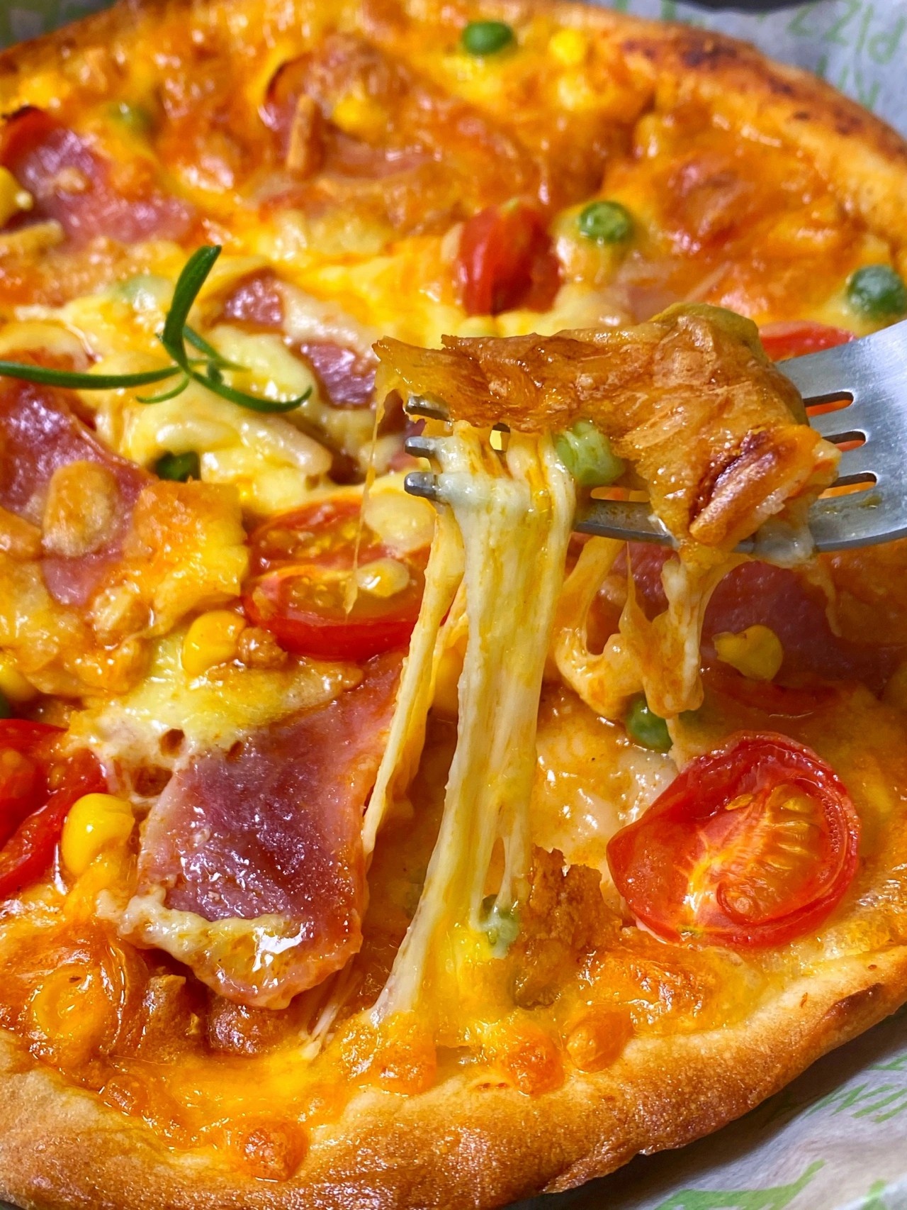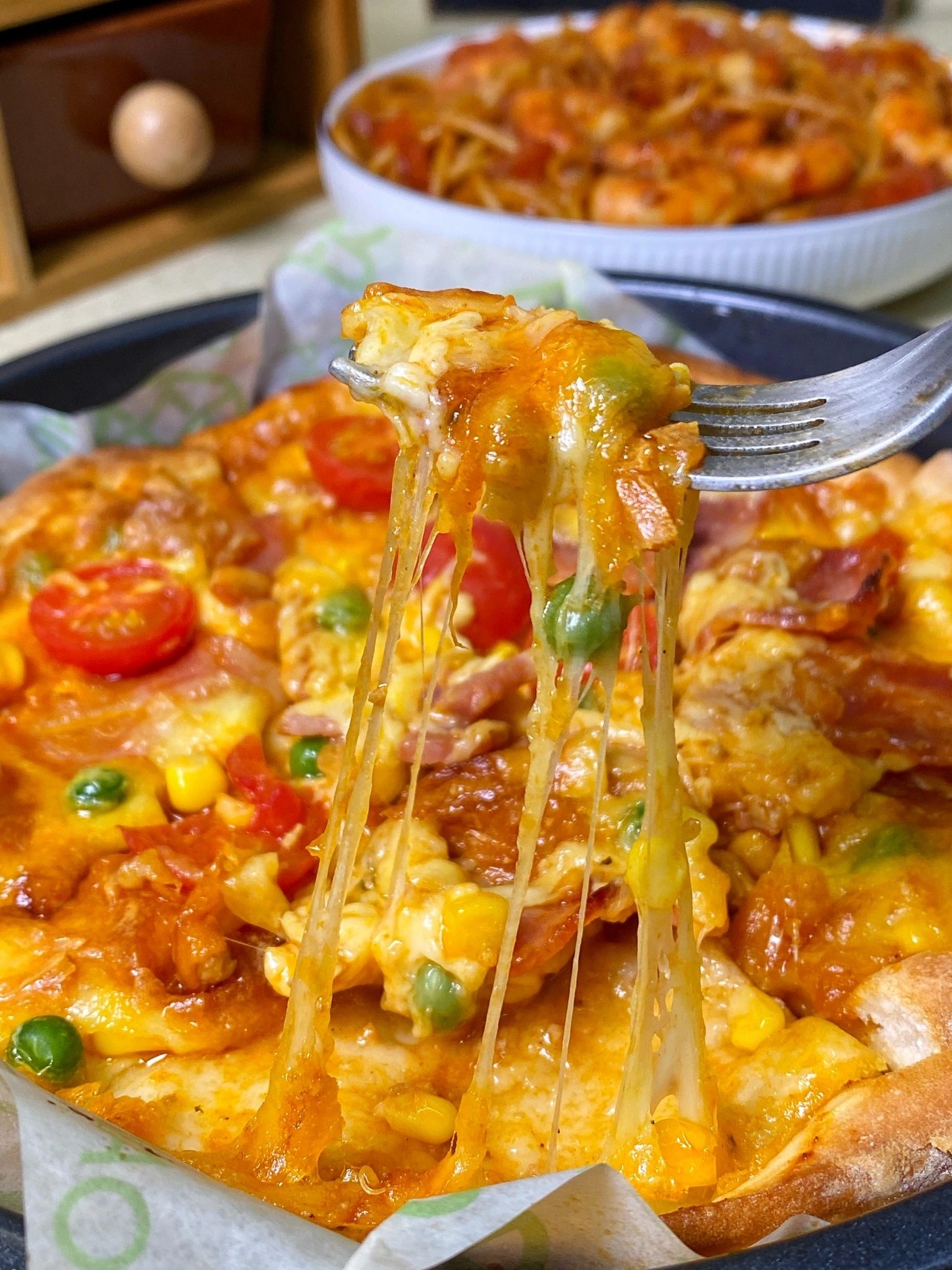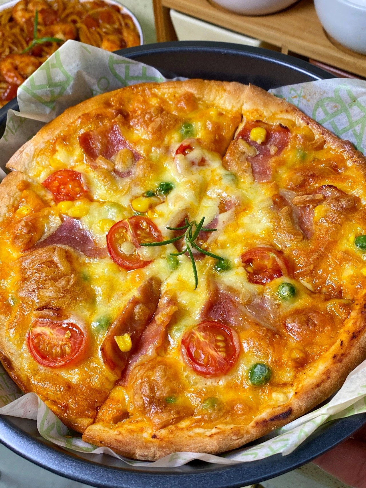 披萨饼坯、培根、披萨酱、芝士、豌豆玉米粒、圣女果
