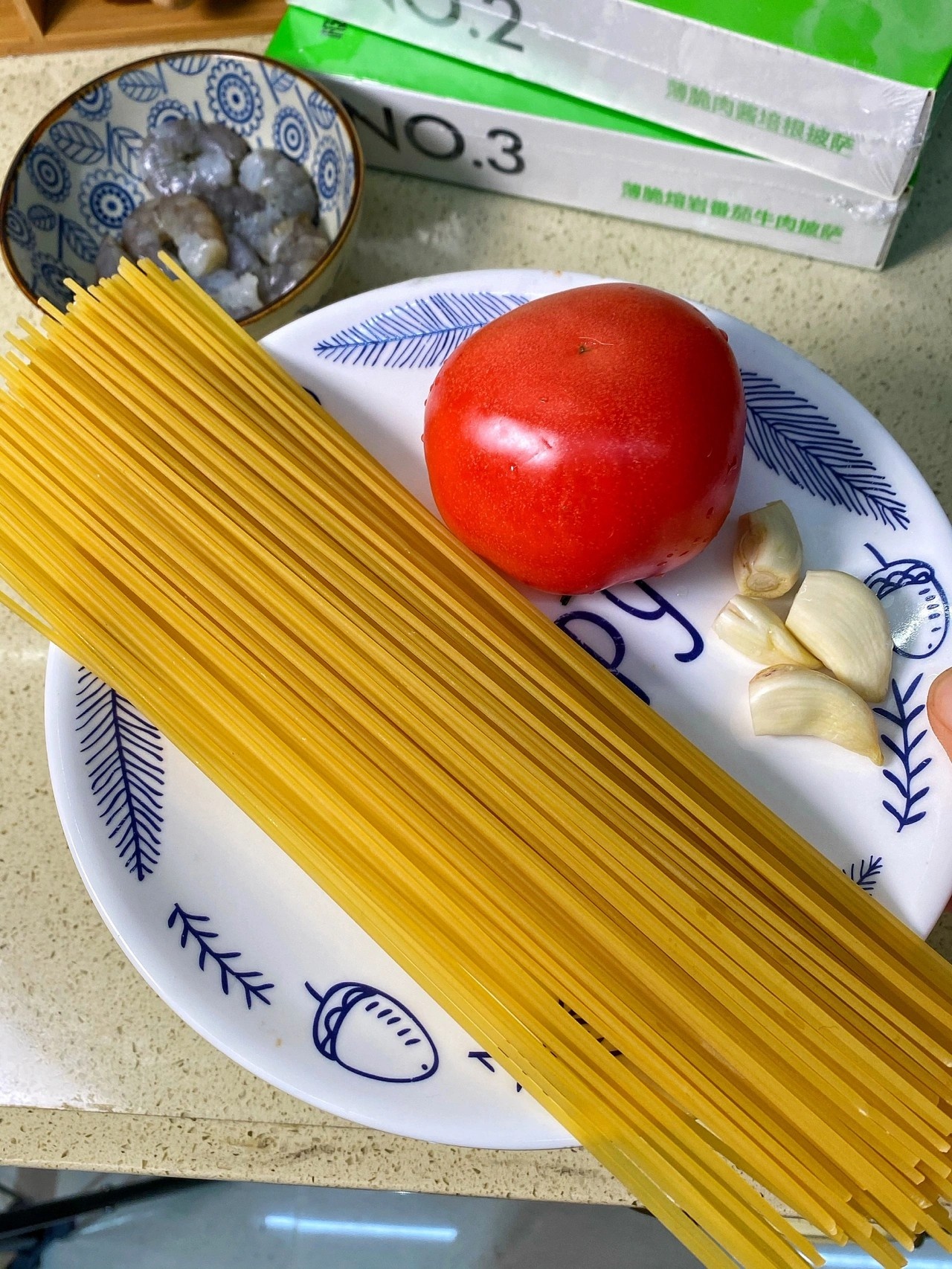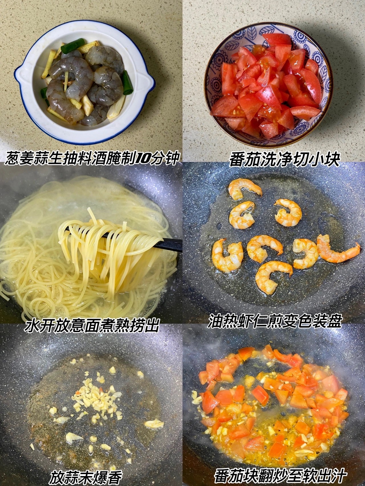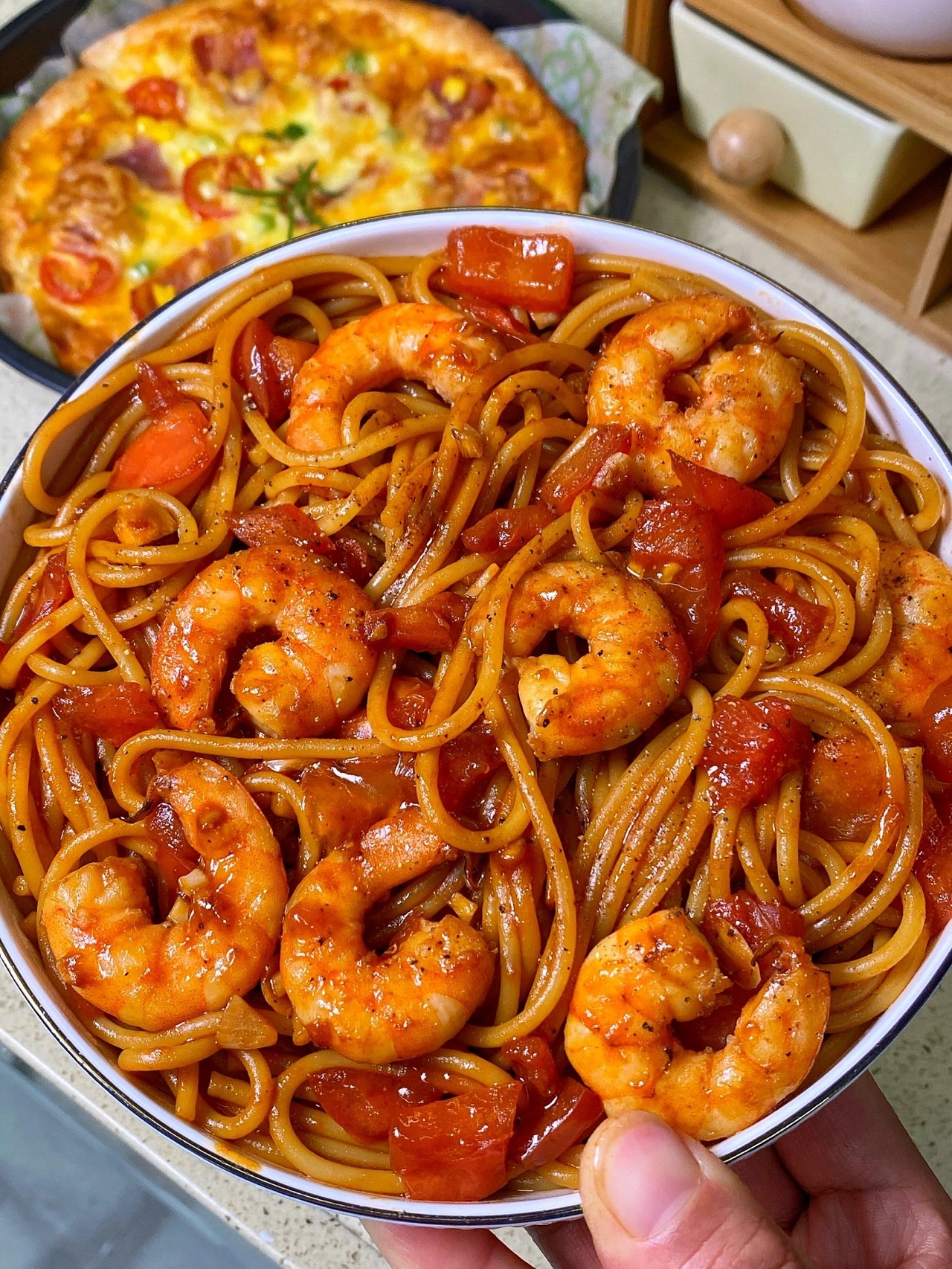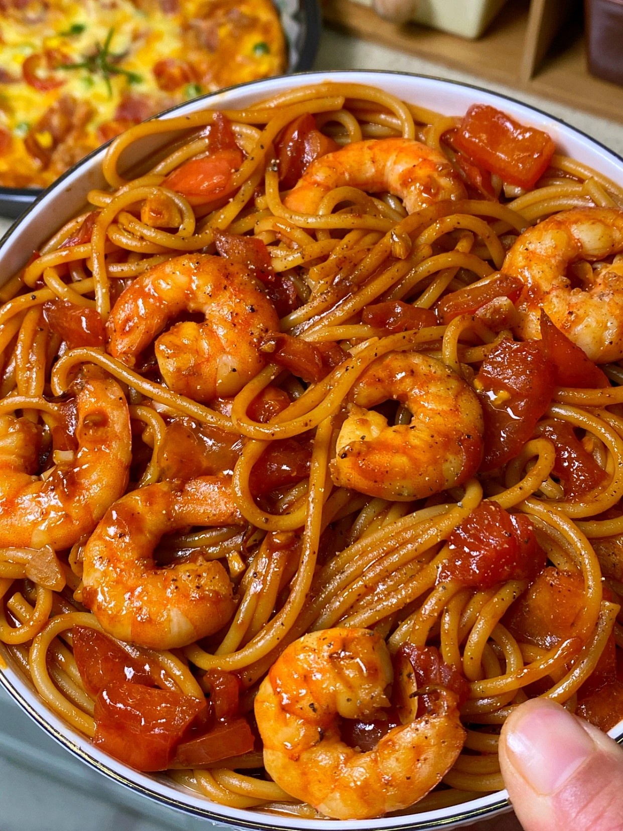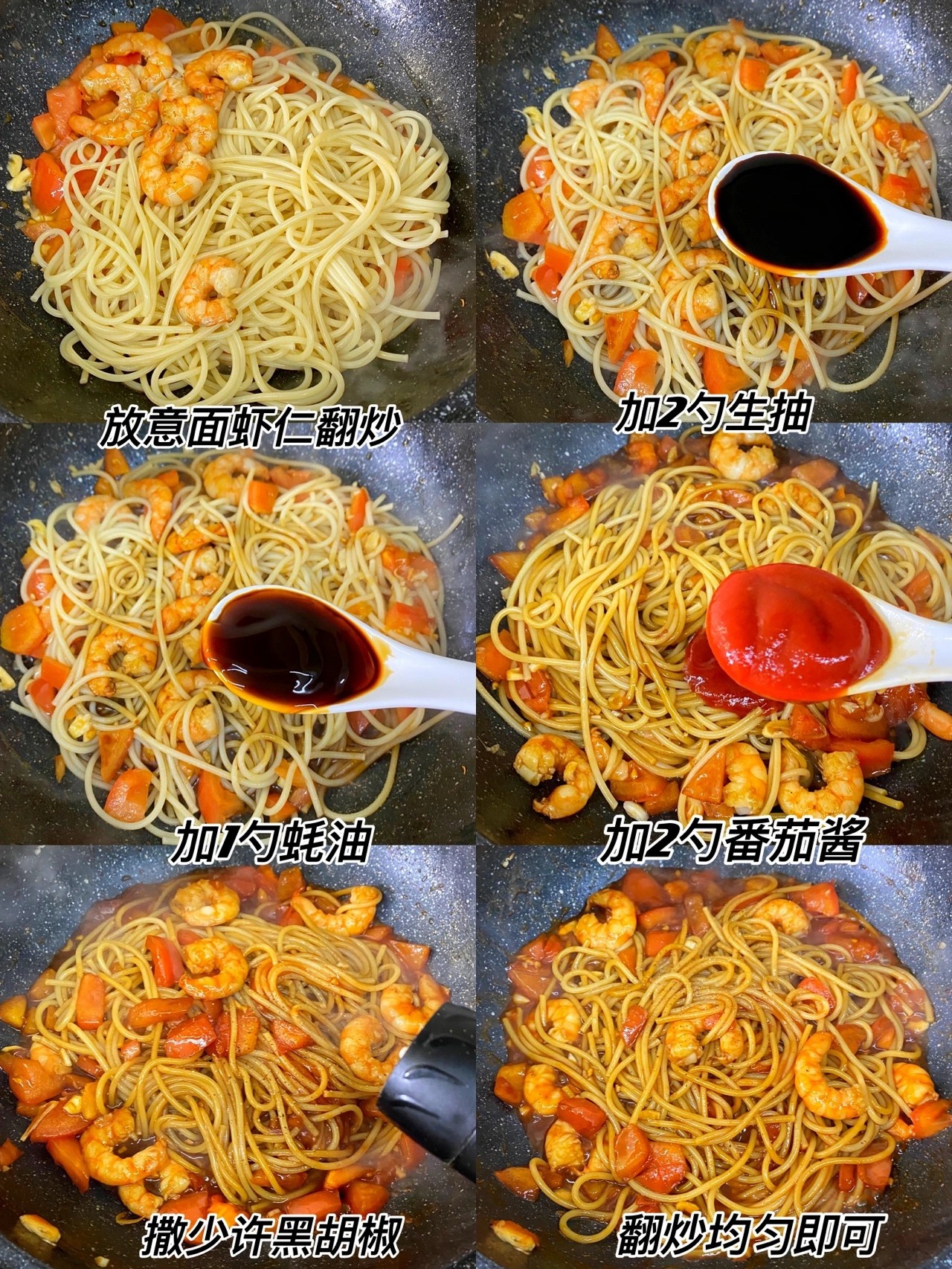 3⃣️油热放虾仁翻炒变色装盘,留底油蒜末爆香,放番茄块翻炒至软出汁;放意面虾仁翻炒➕2勺生抽➕2勺番茄酱翻炒均匀,撒黑胡椒出锅啦