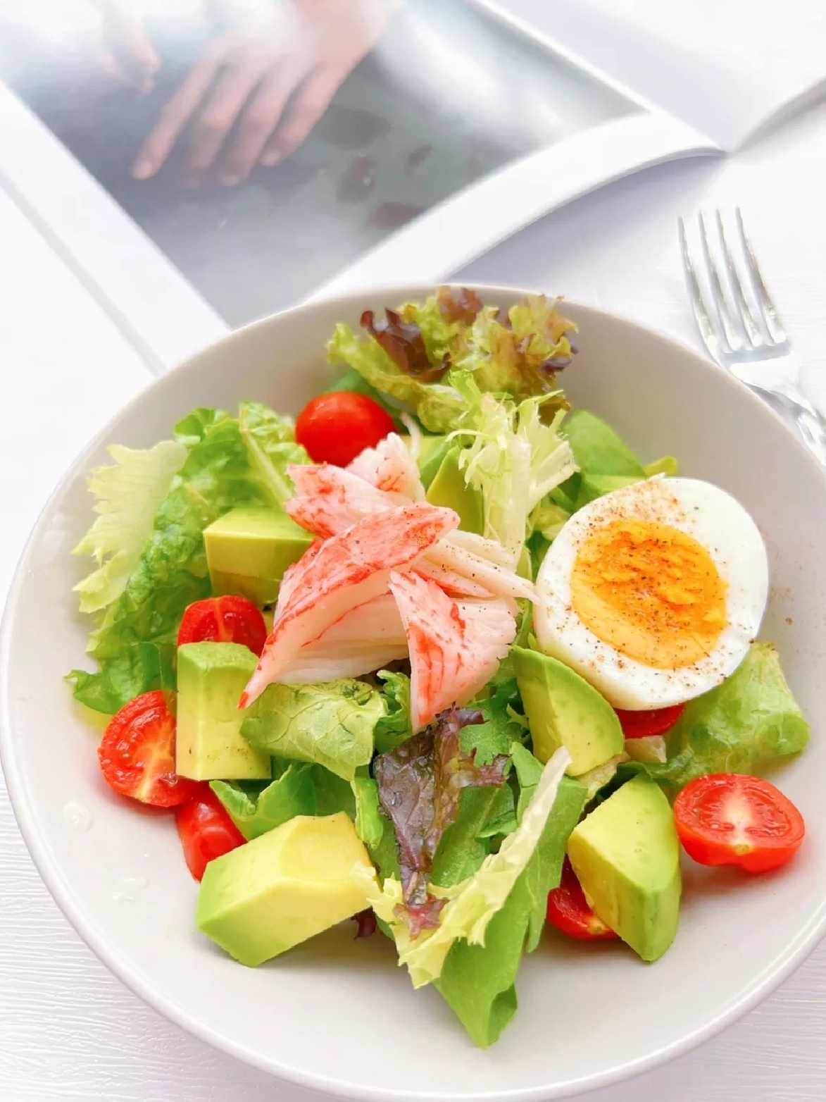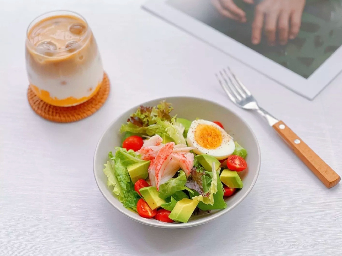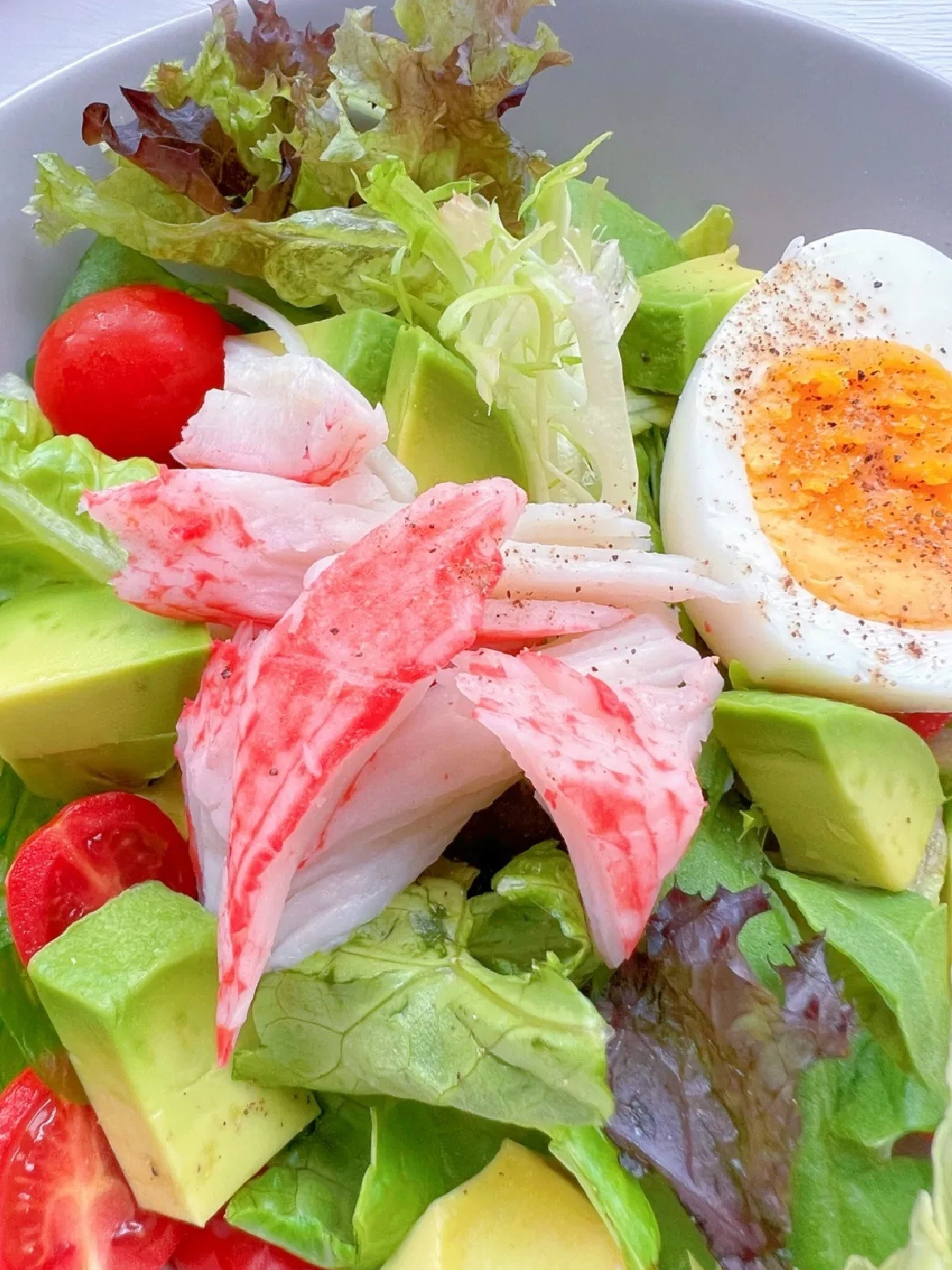 ◆蟹柳2根、无菌蛋1个、牛油果半个、樱桃小蕃茄5个、即食混合沙拉蔬菜适量