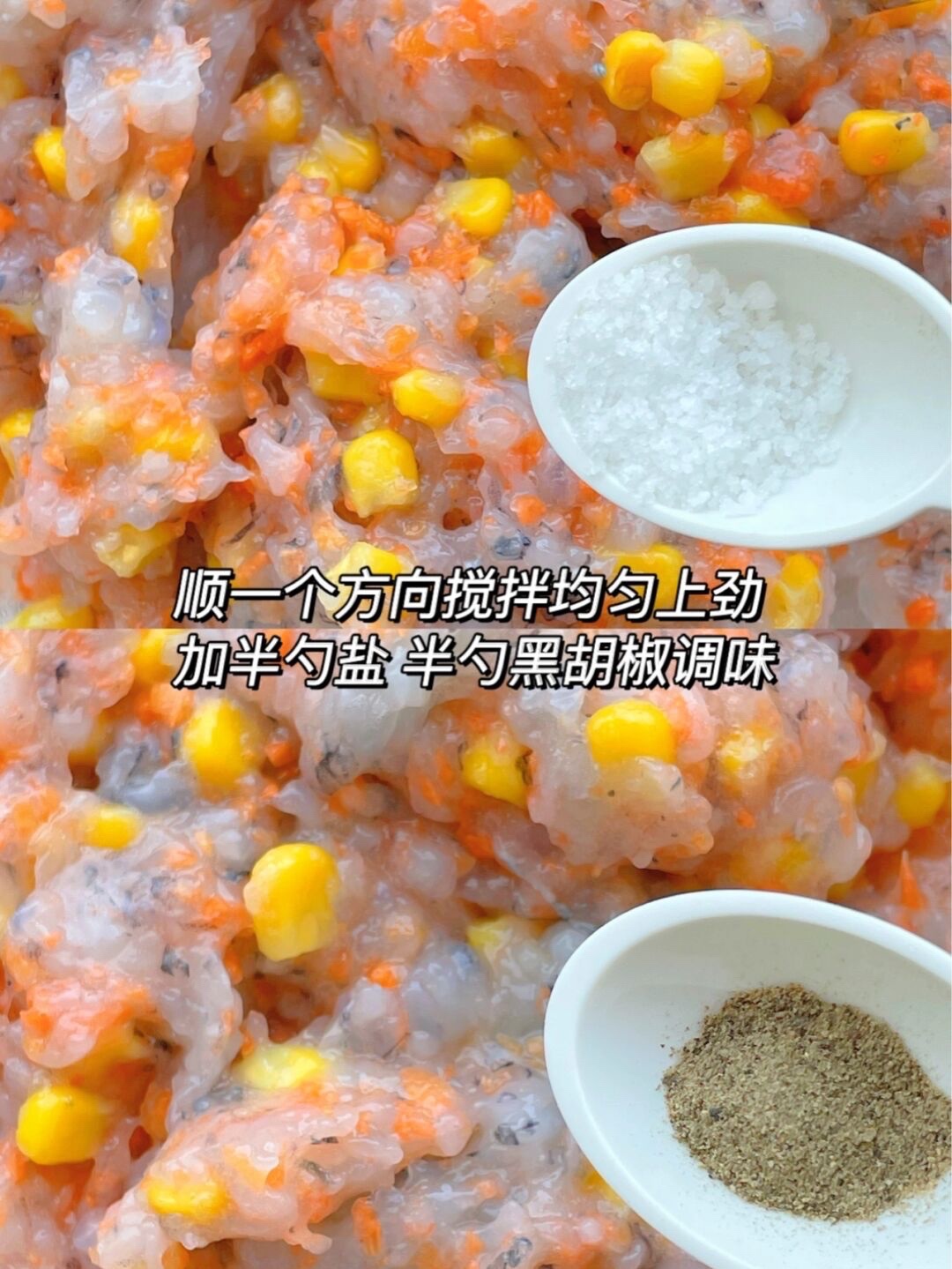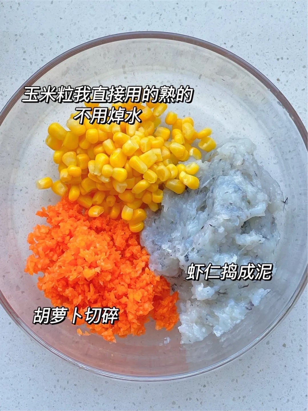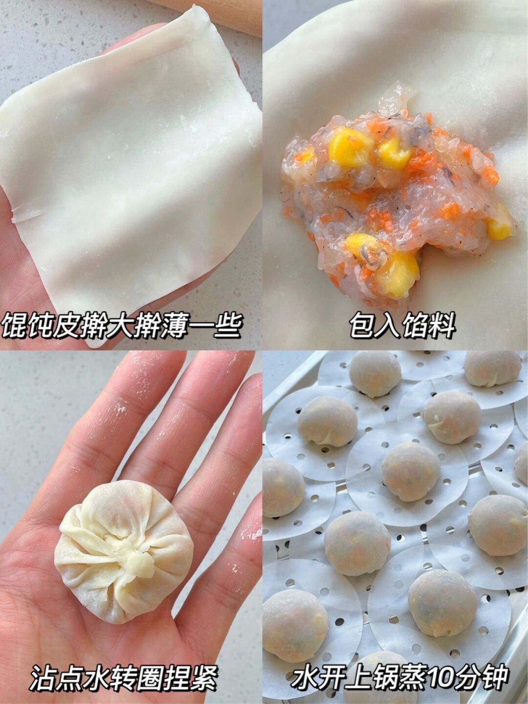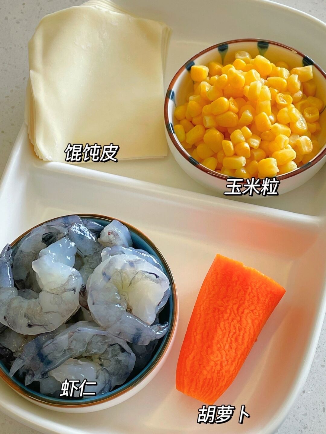 准备馄饨皮,虾仁,胡萝卜和玉米粒,