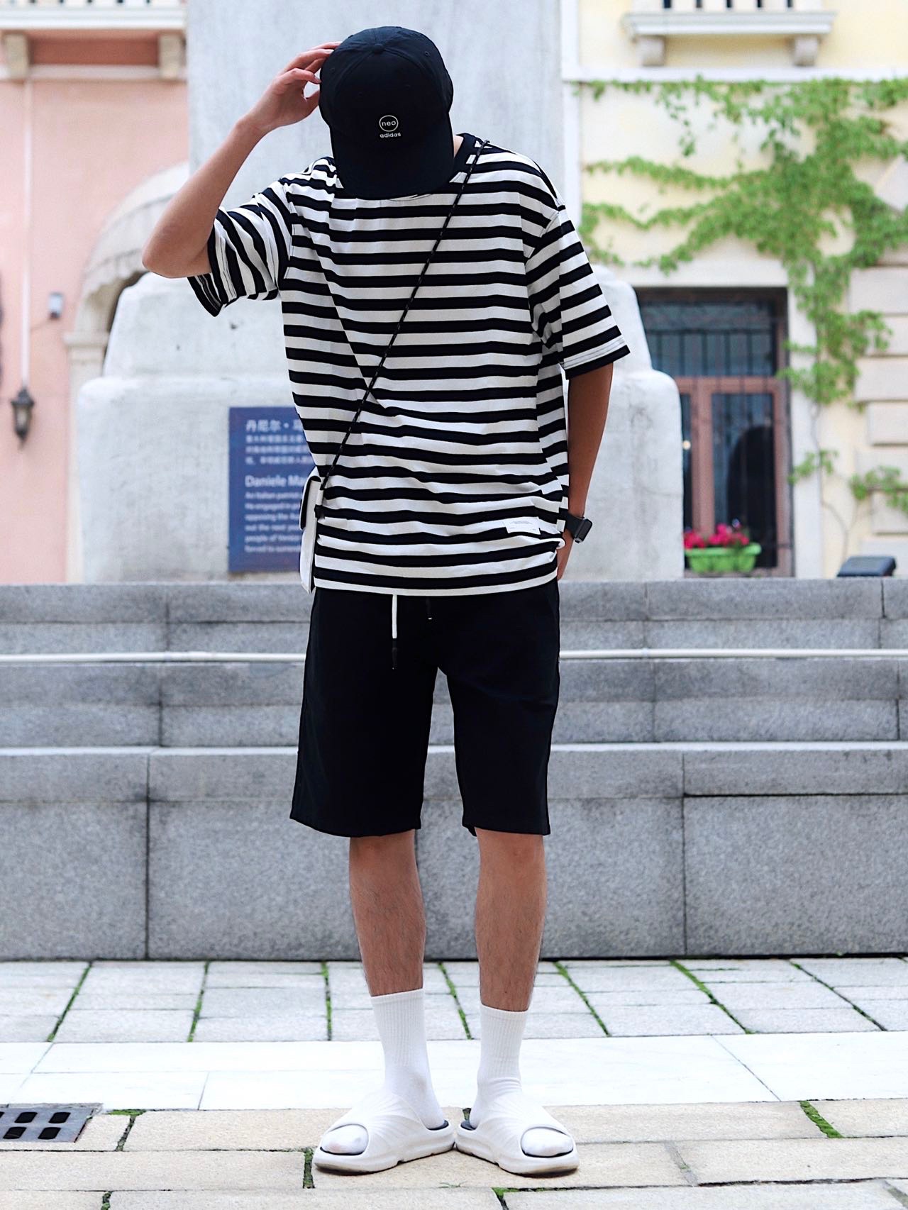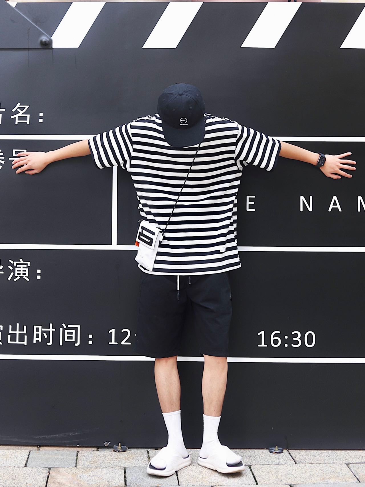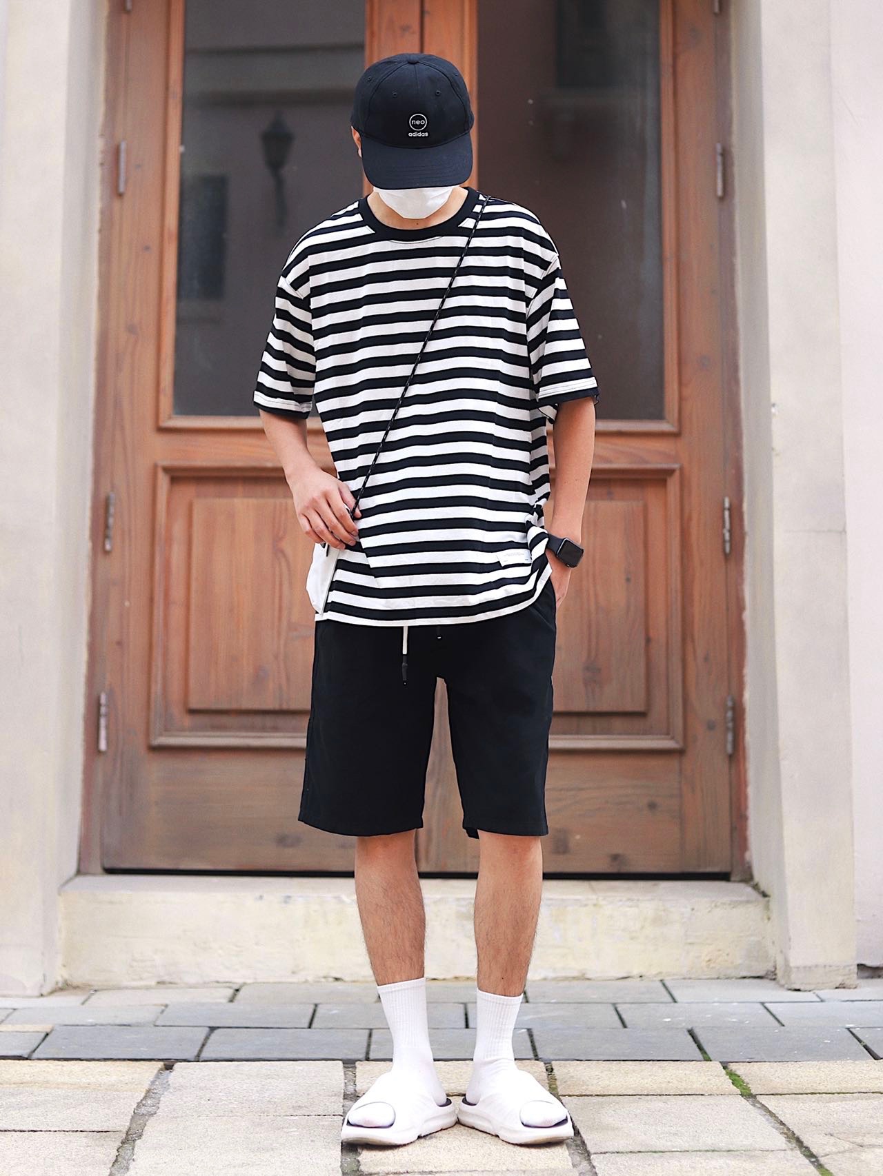 look:棒球帽➕条纹短袖➕黑色短裤