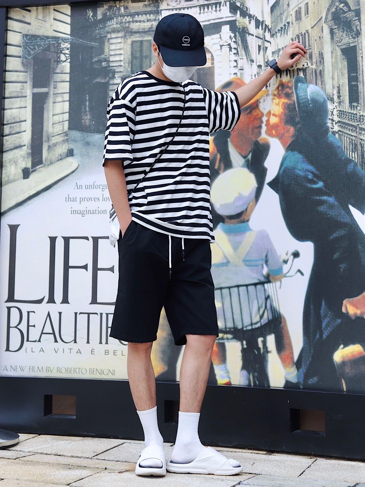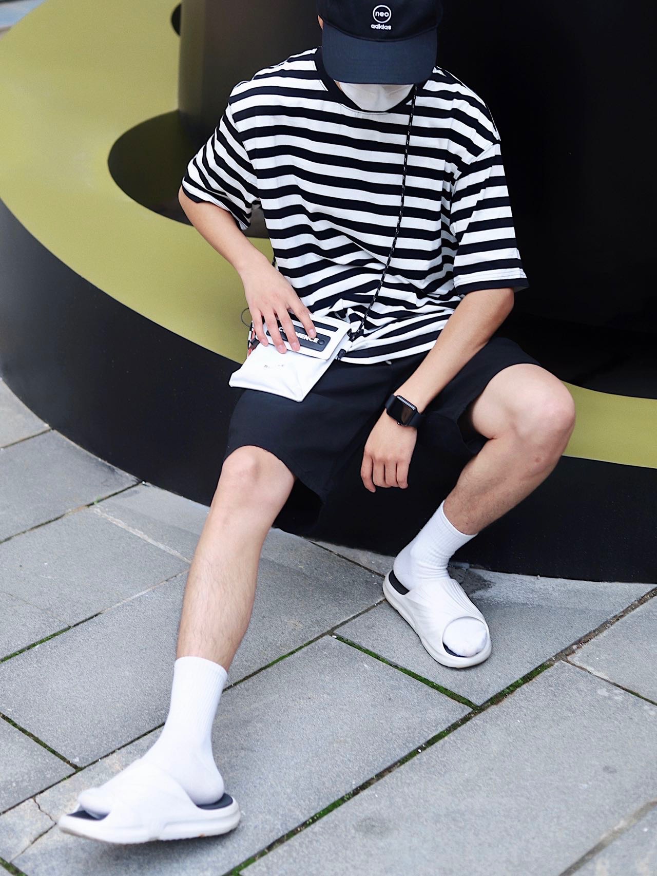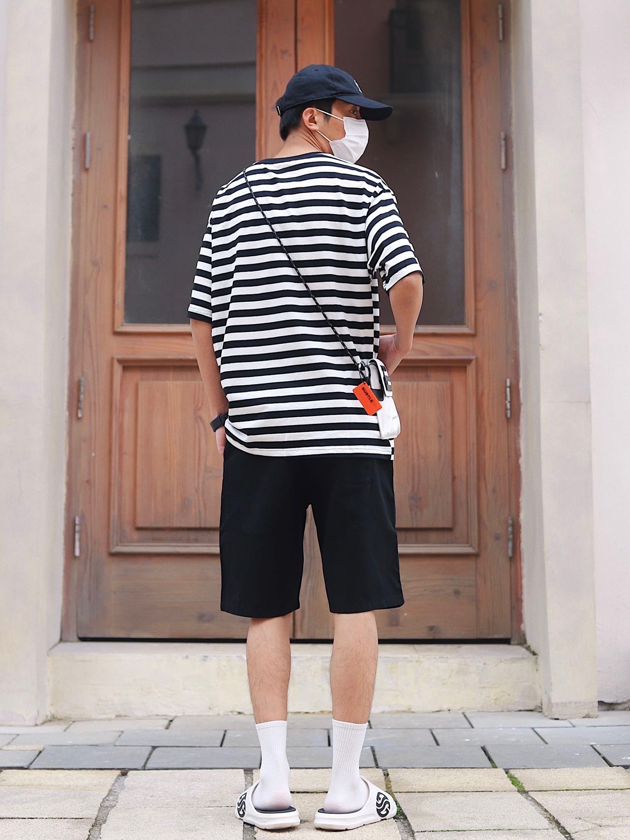 look:棒球帽➕条纹短袖➕黑色短裤