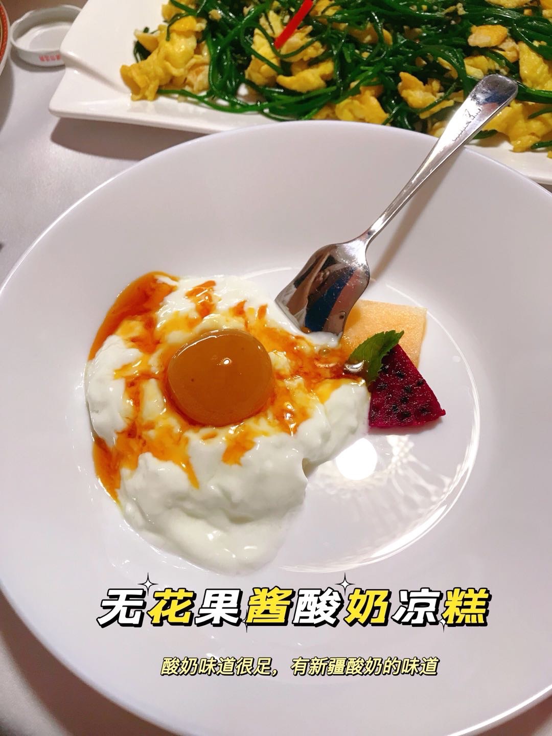 饭后甜点,酸奶味道很足,有新疆味哈,口感清凉,酸奶配上甜甜的酱,好吃,而且配上凉糕,绝绝子,很有嚼劲,也很解腻!