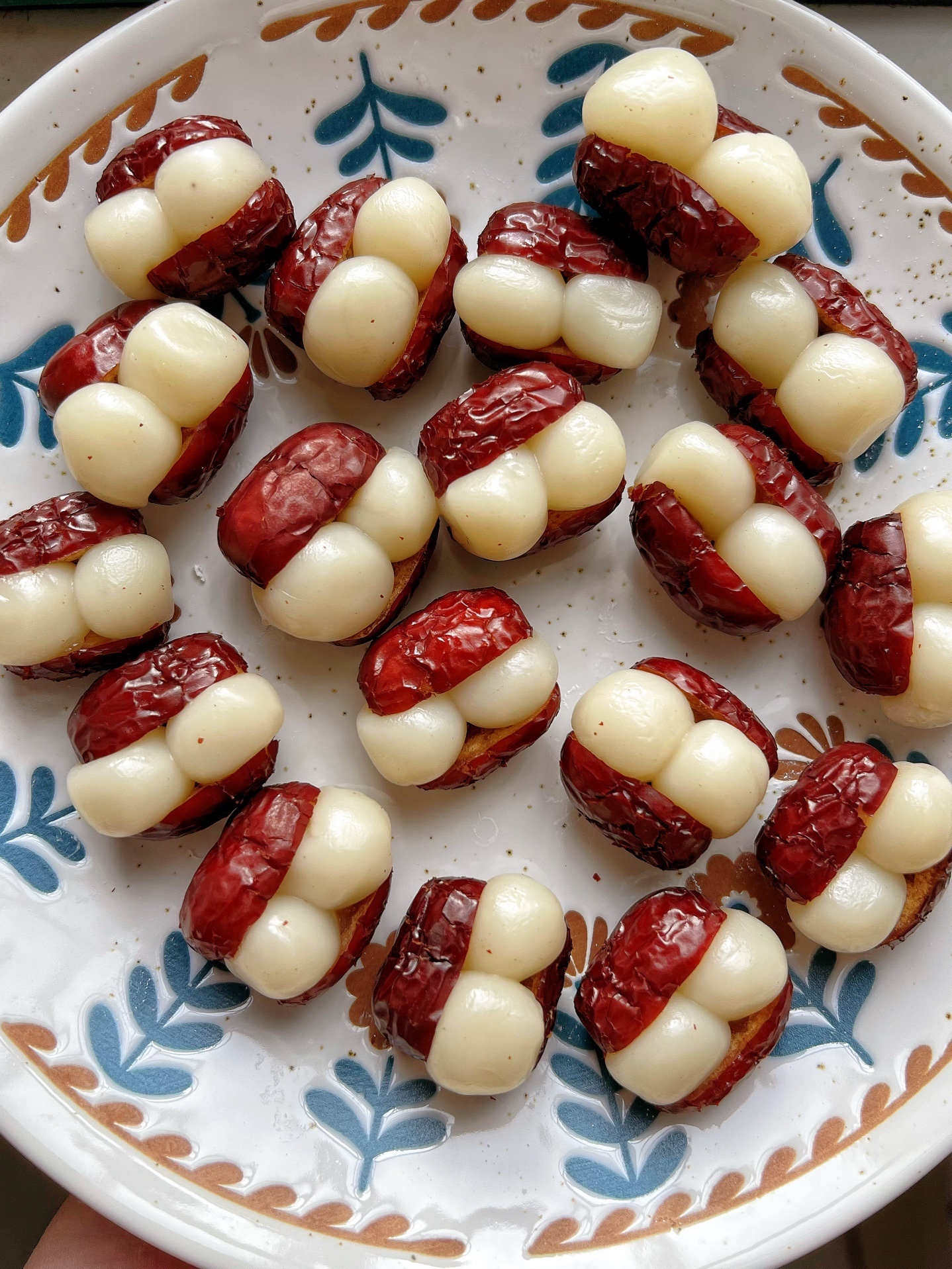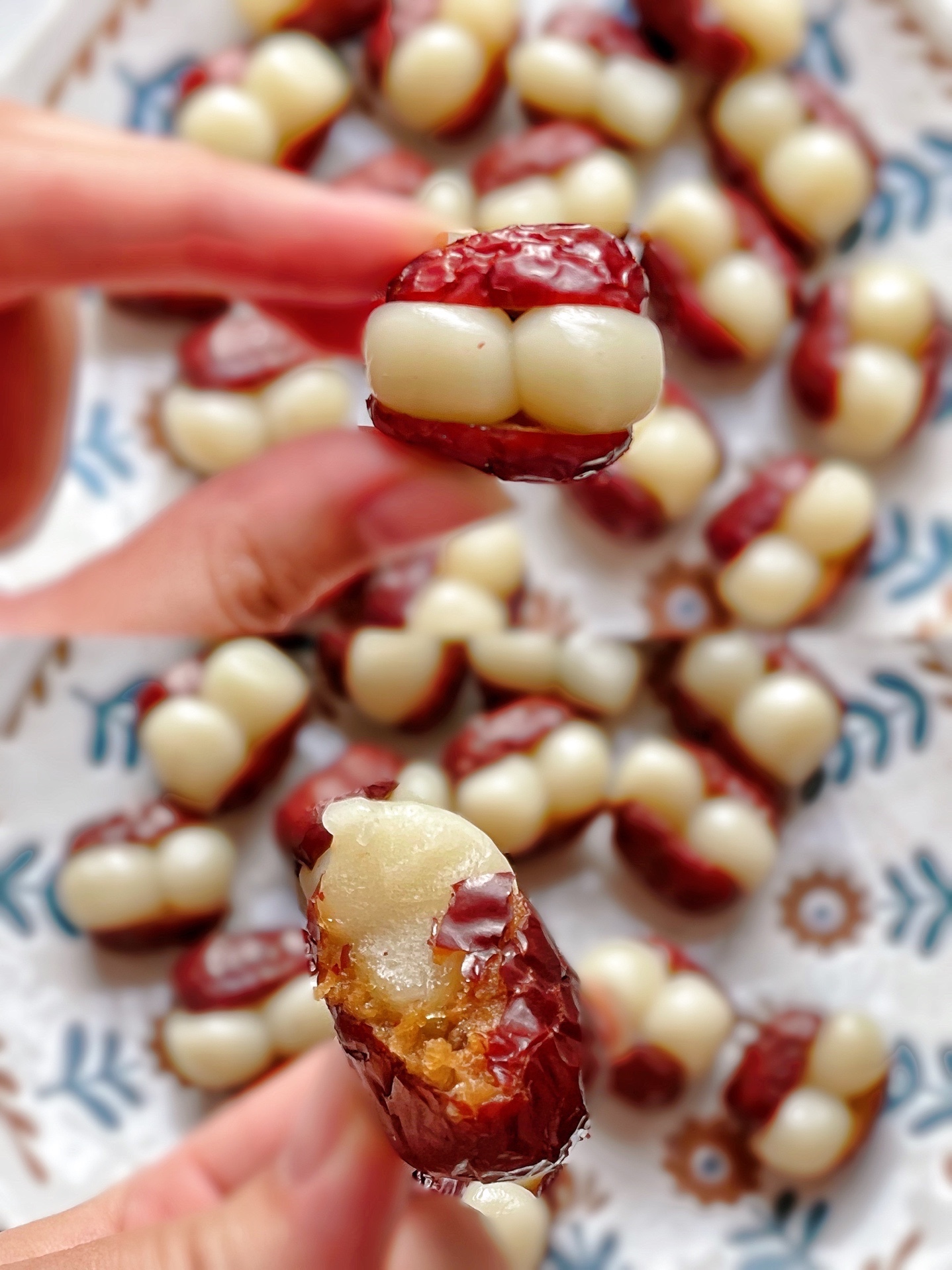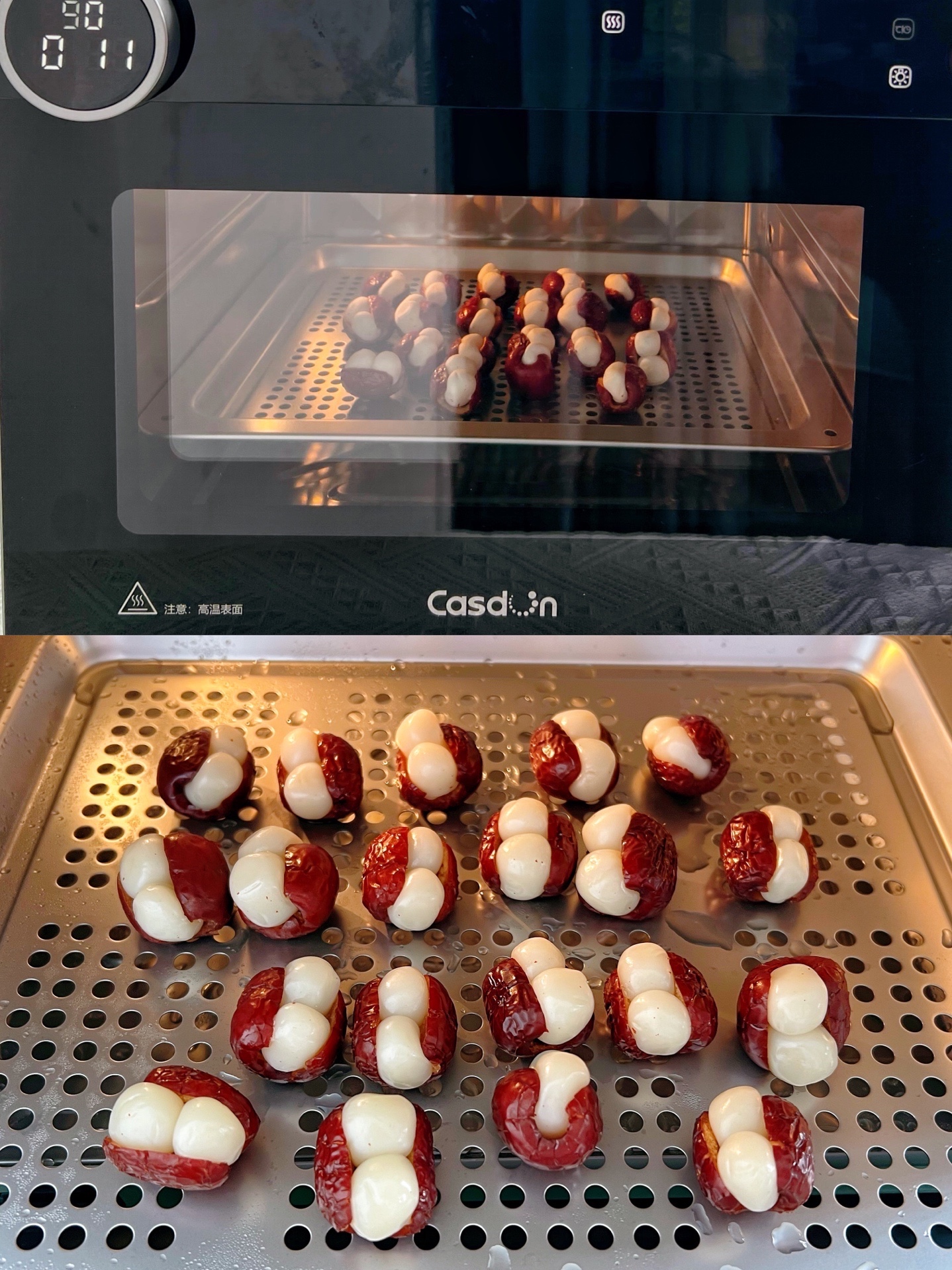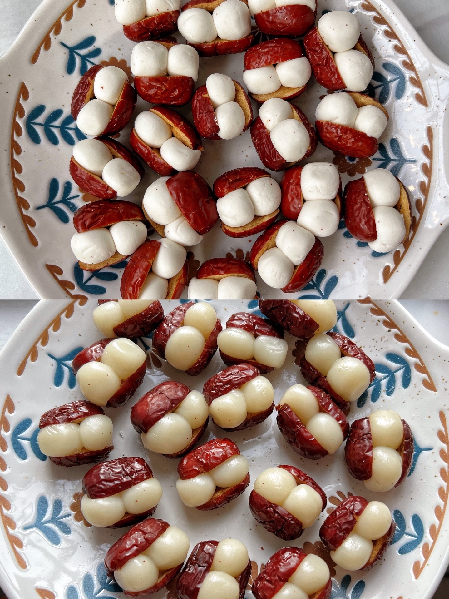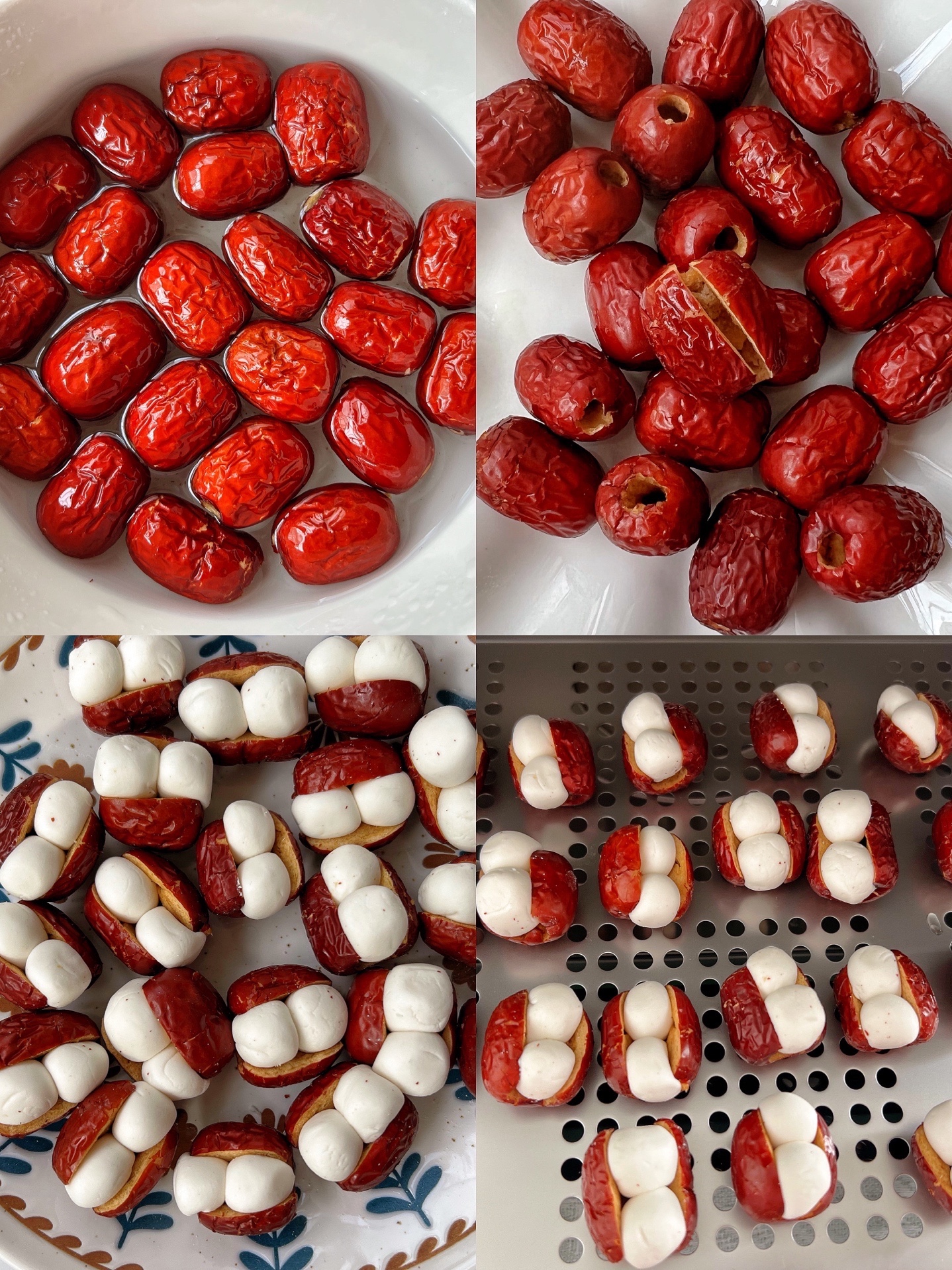 2️⃣ 红枣洗净,去核不切断,塞入两个小圆子