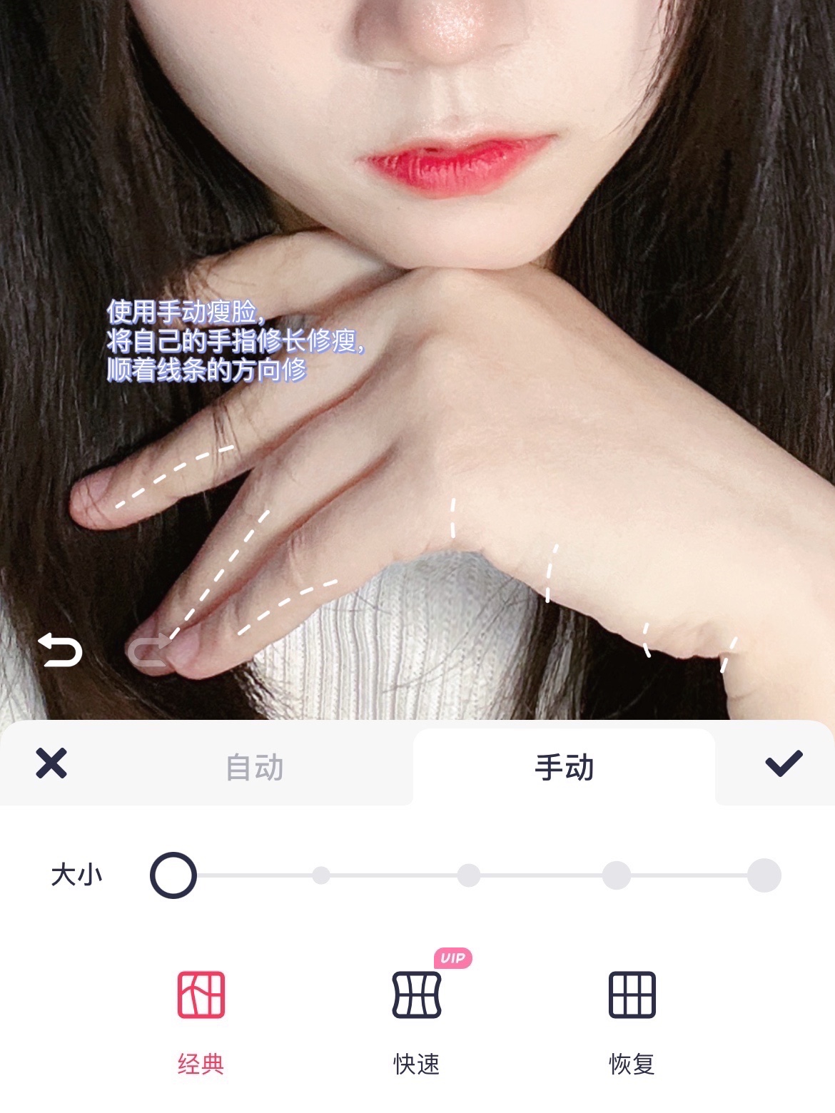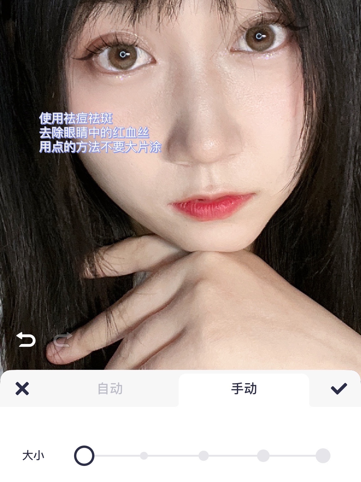 🌷用祛痘祛斑将眼睛里的红血丝点涂去掉,一定要点涂不要大面积涂抹,去红血丝真的很好用👍🏻,使用手动瘦脸将手修细修长,按照线条的方向修更加自然。