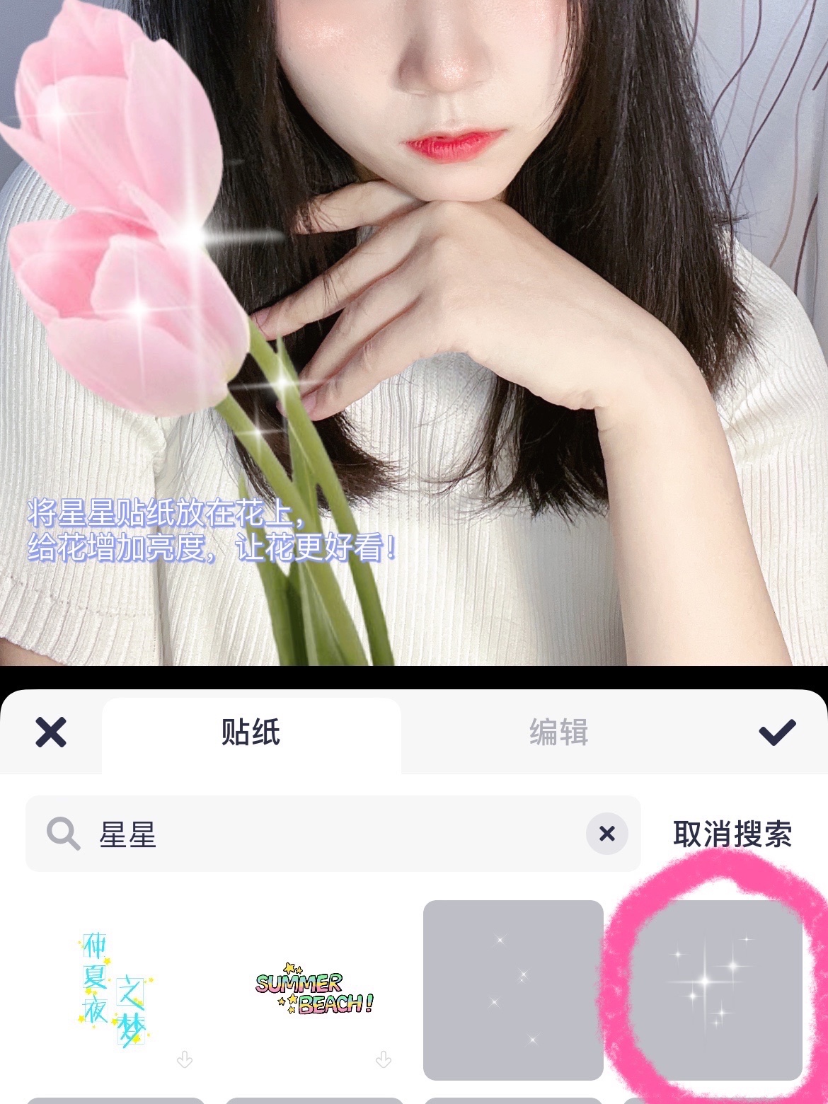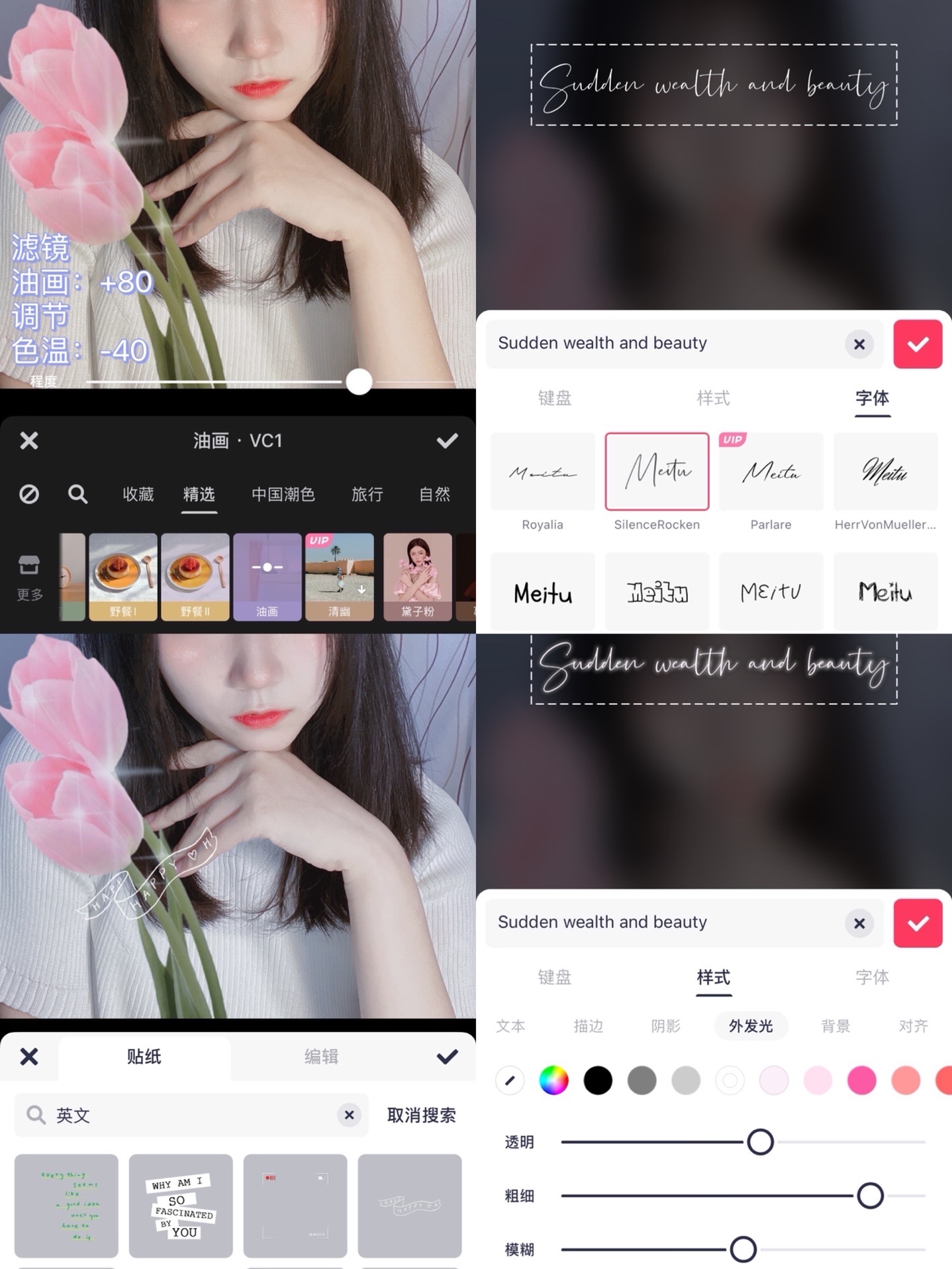 添加如图所示的郁金香和星星,再添加滤镜油画+80,调节色温-40,再添加英文贴纸和自己喜欢的英文。