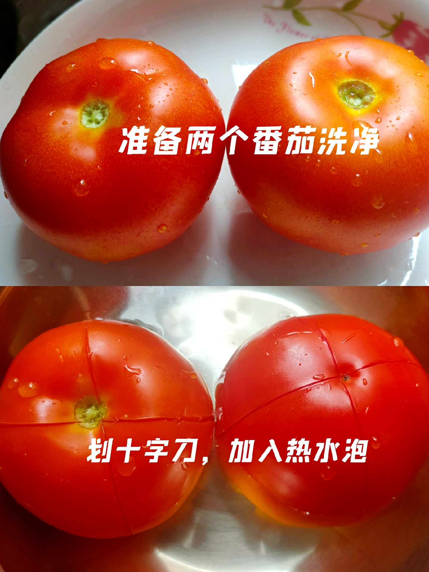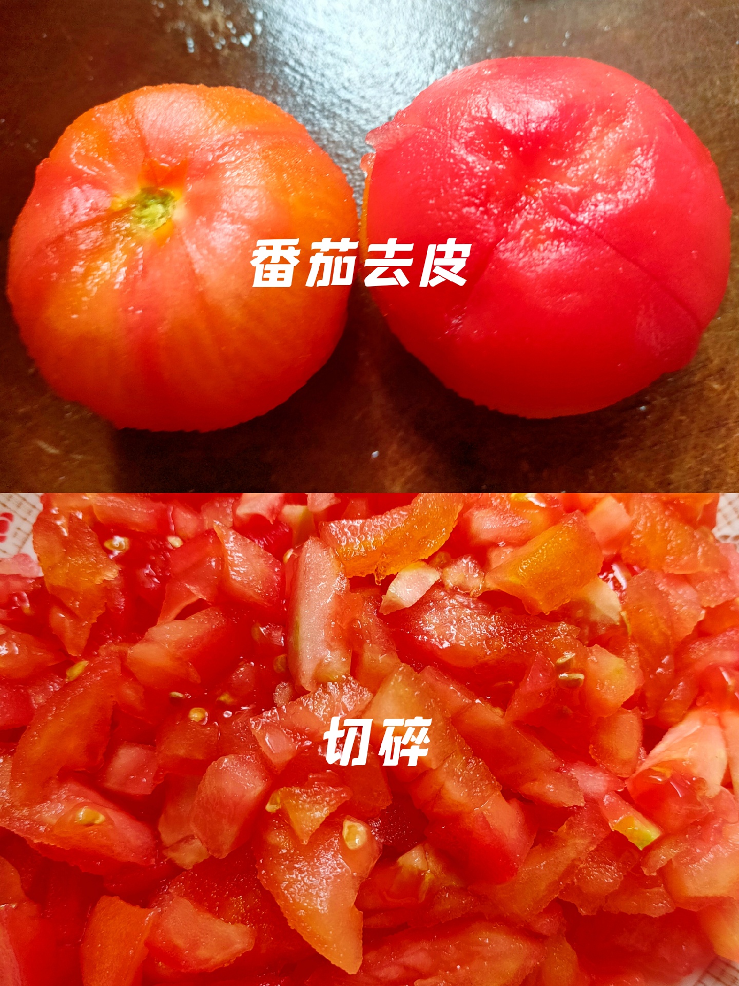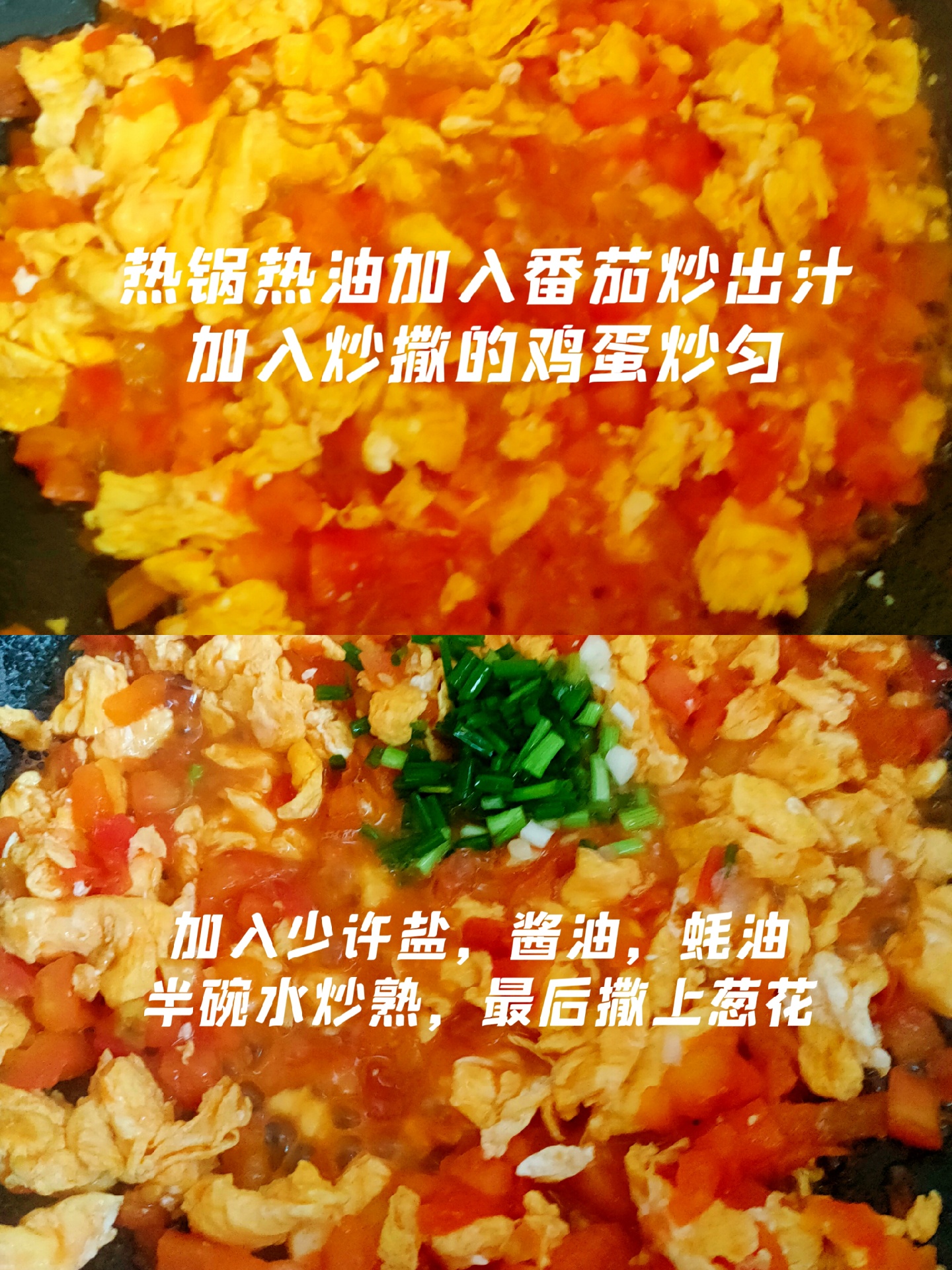 ★步骤:①准备两个番茄,洗净划十字刀,加入热水泡一会 ②番茄泡起皮了直接去皮切碎 ③准备四个鸡蛋,加入少许盐搅匀 ④热锅热油加入鸡蛋炒撒备用 ⑤热锅热油加入番茄炒出汁,加入鸡蛋炒匀 ⑥加入少许盐,酱油,蚝油,半碗水炒熟,最后撒上葱花出锅。