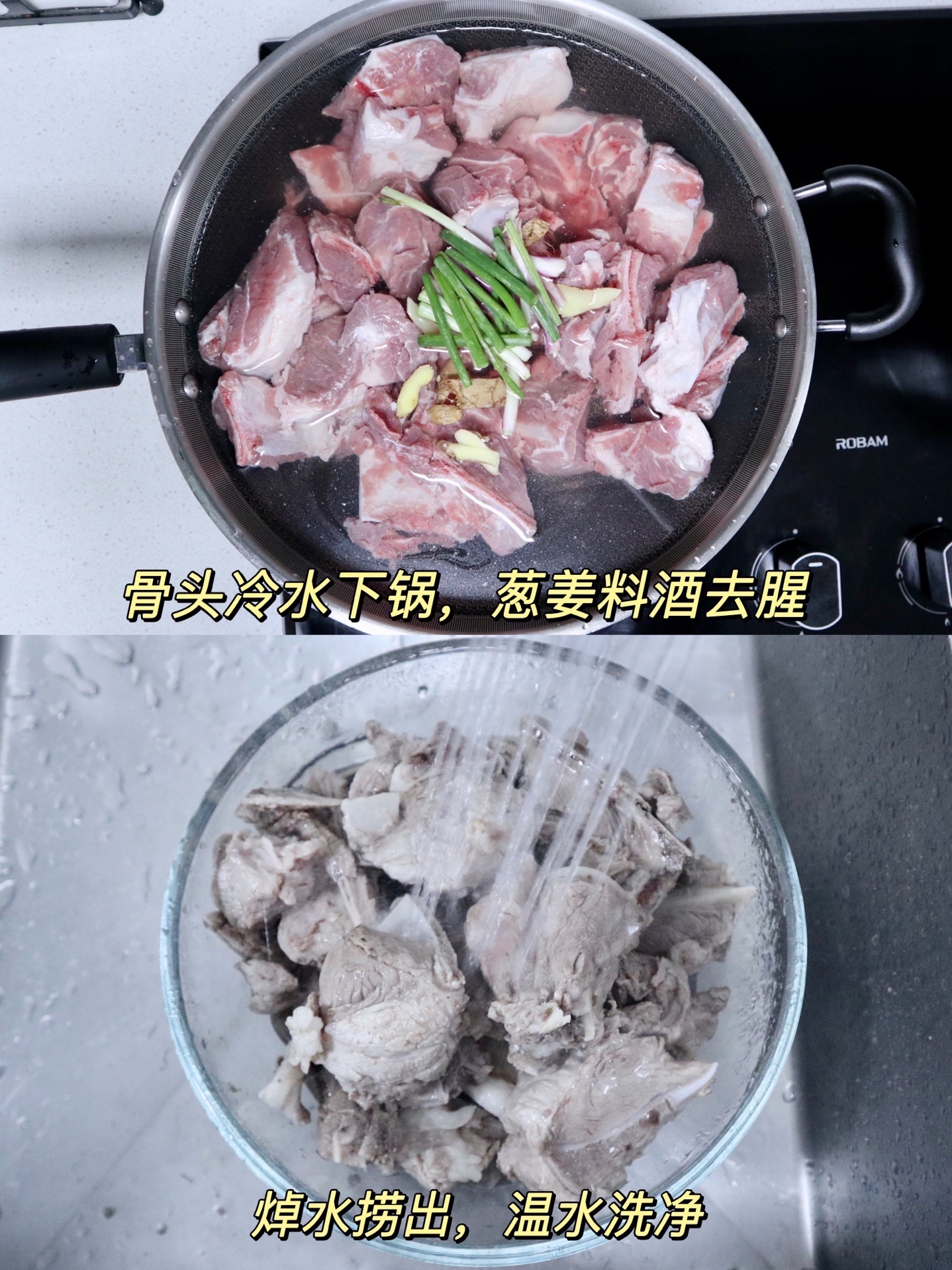 1⃣️、骨头冷水下锅,葱姜料酒去腥,焯水捞出,温水洗净。