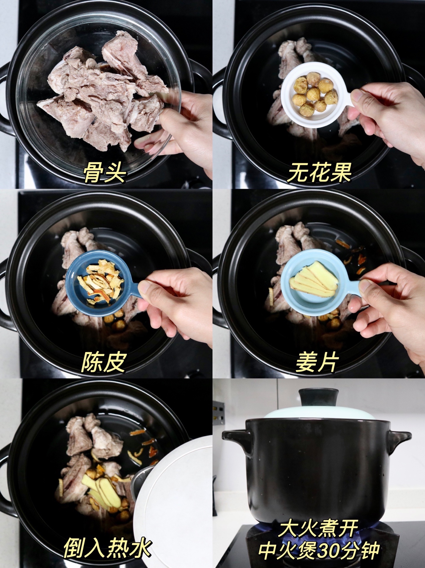 2⃣️、将骨头、无花果、陈皮、姜片放入砂锅里,倒入热水,大火煮开,中火煲30分钟。