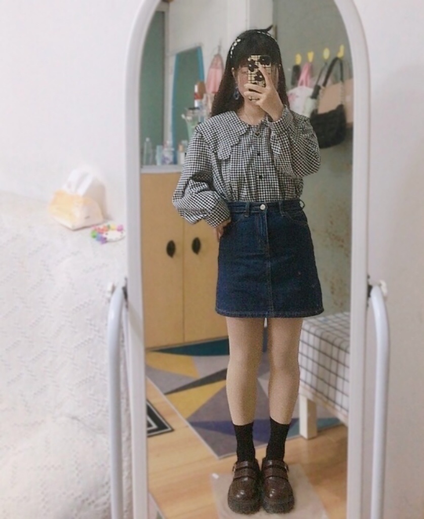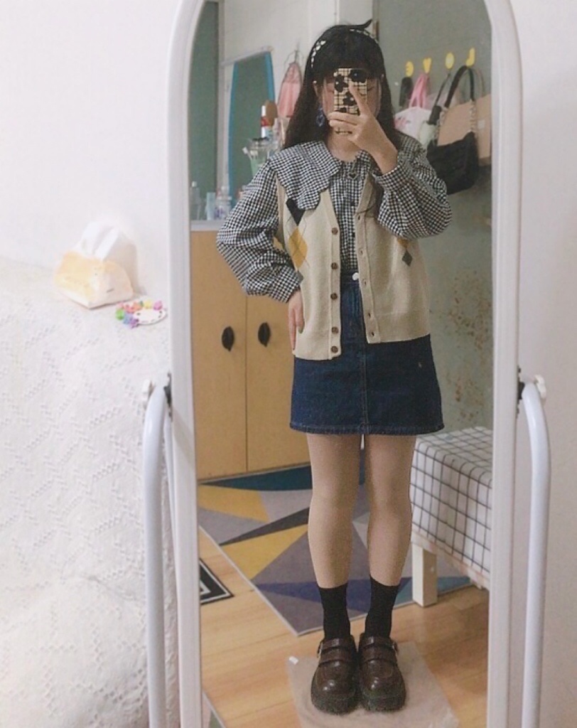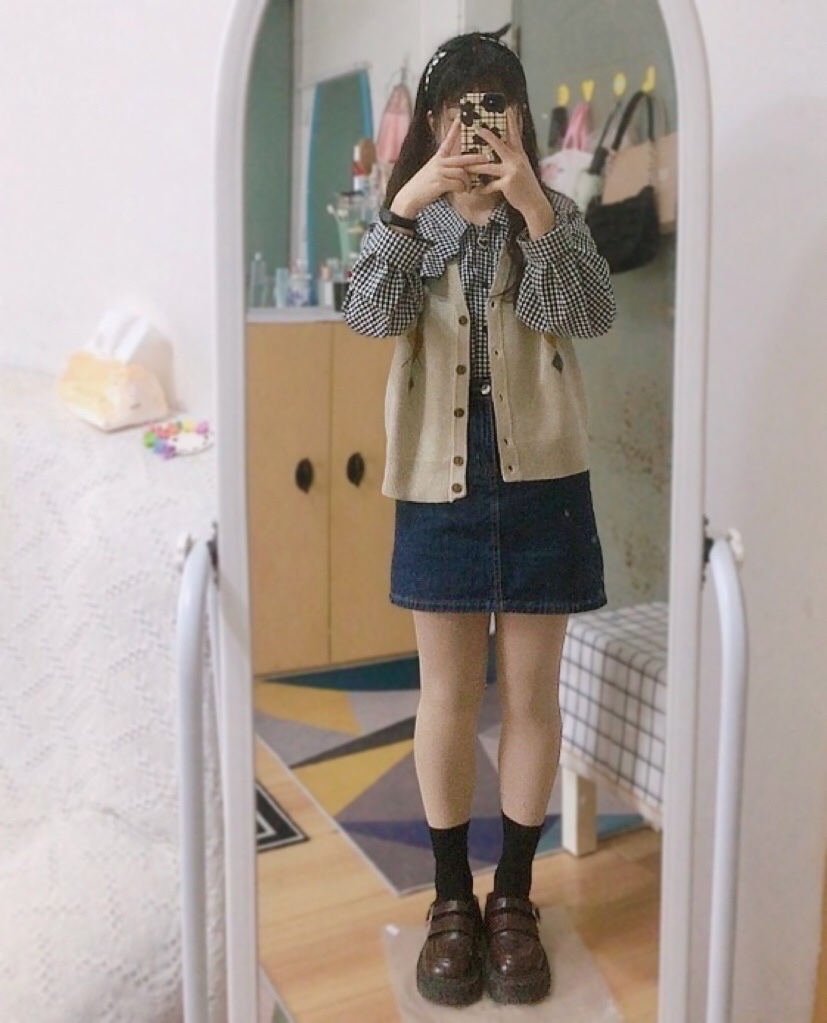 格子娃娃领衬衫+牛仔短裙+小皮鞋。有点冷,搭个针织开衫马甲。清新学院风~