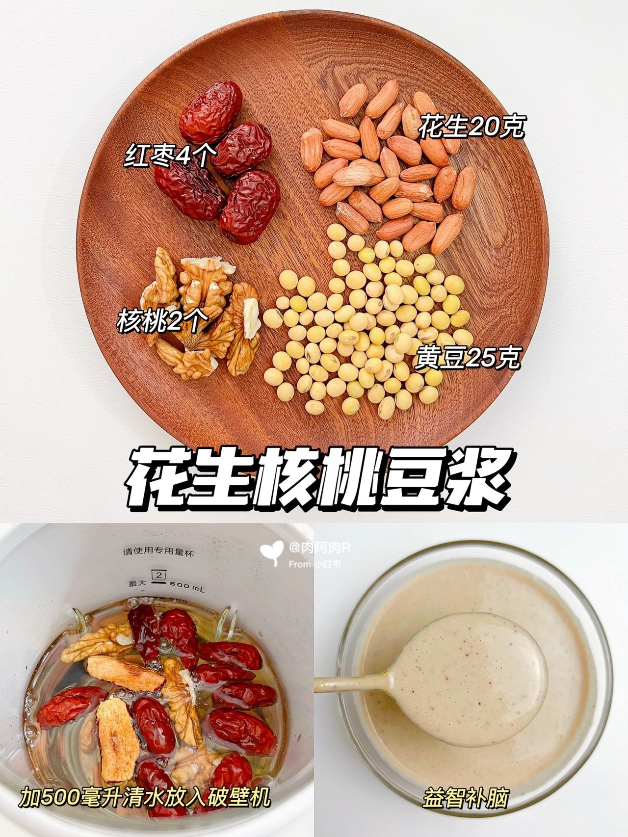 📝 花生20克,黄豆25克,核桃2个,红枣4个