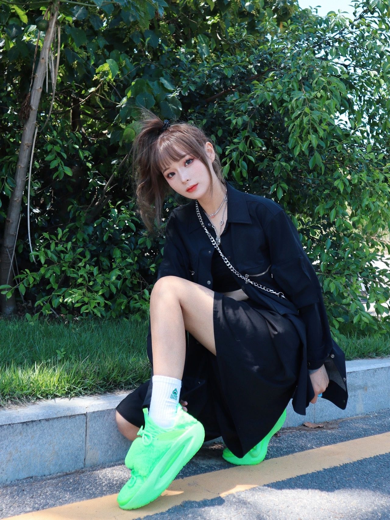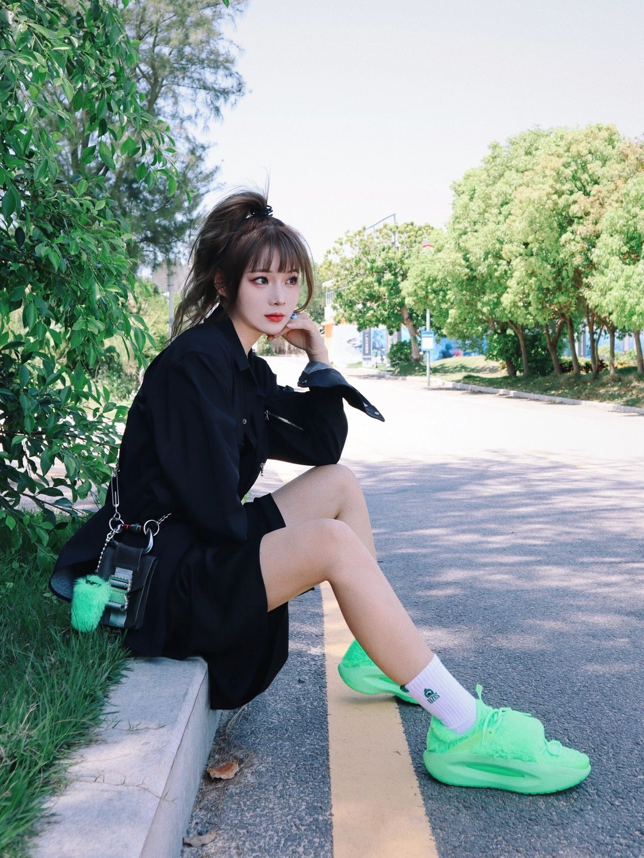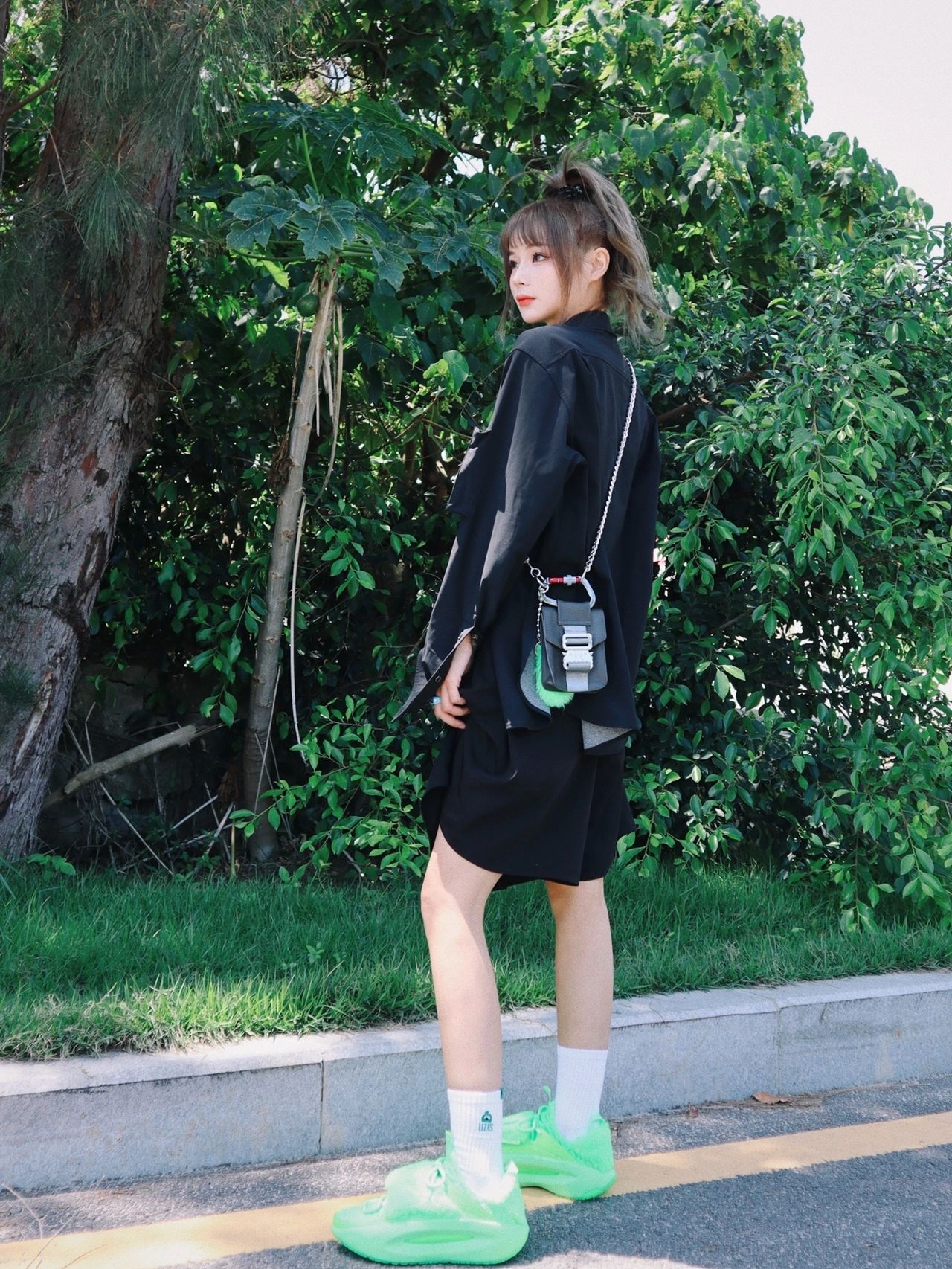 ▫️整体穿搭黑色,所以搭配吸睛的绿色单品啦,绿色鞋子在夏天也太吸睛了!