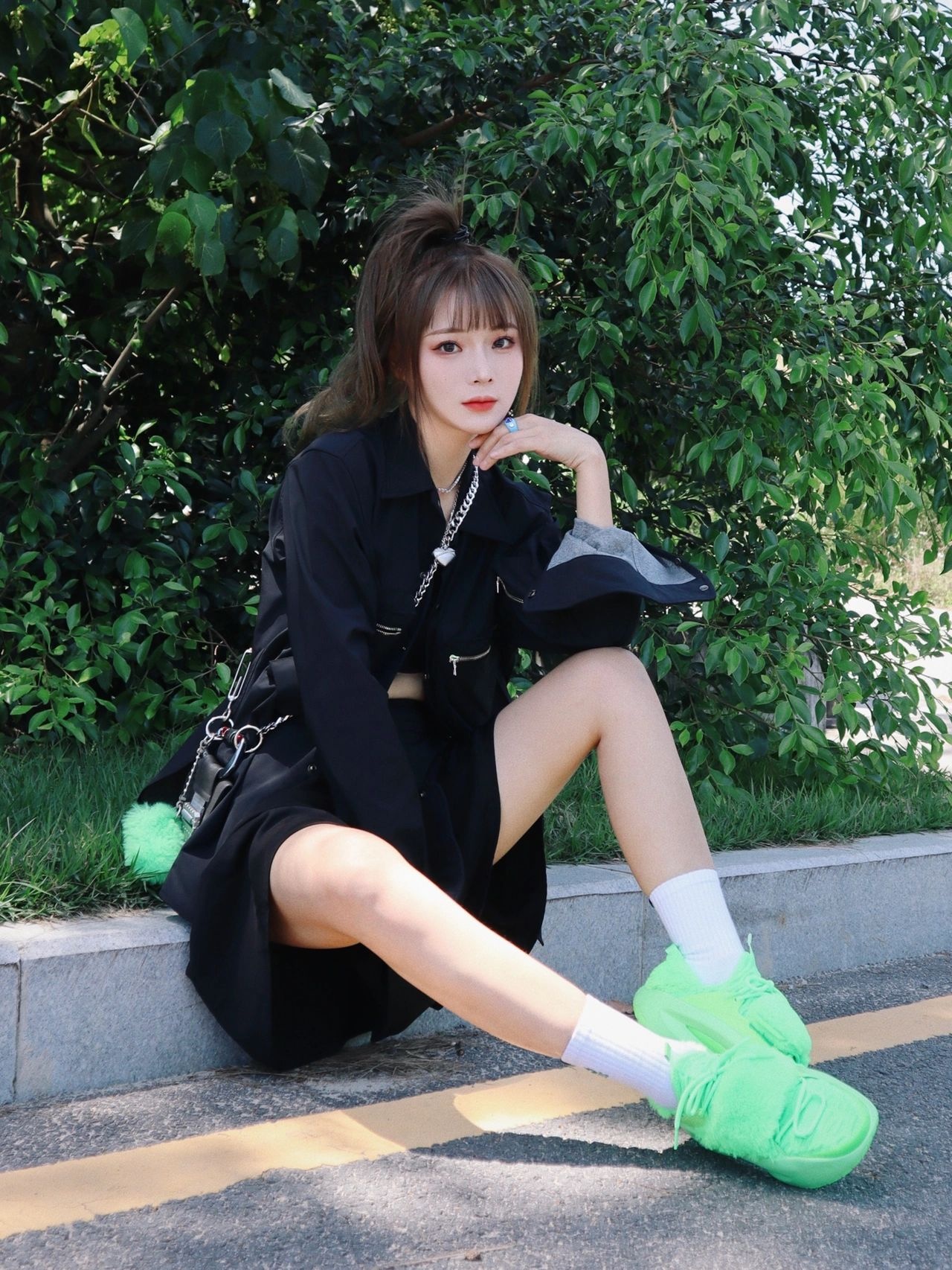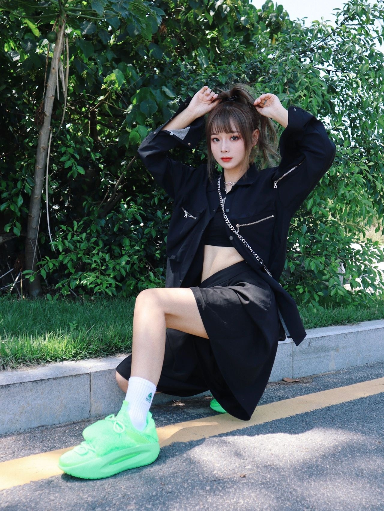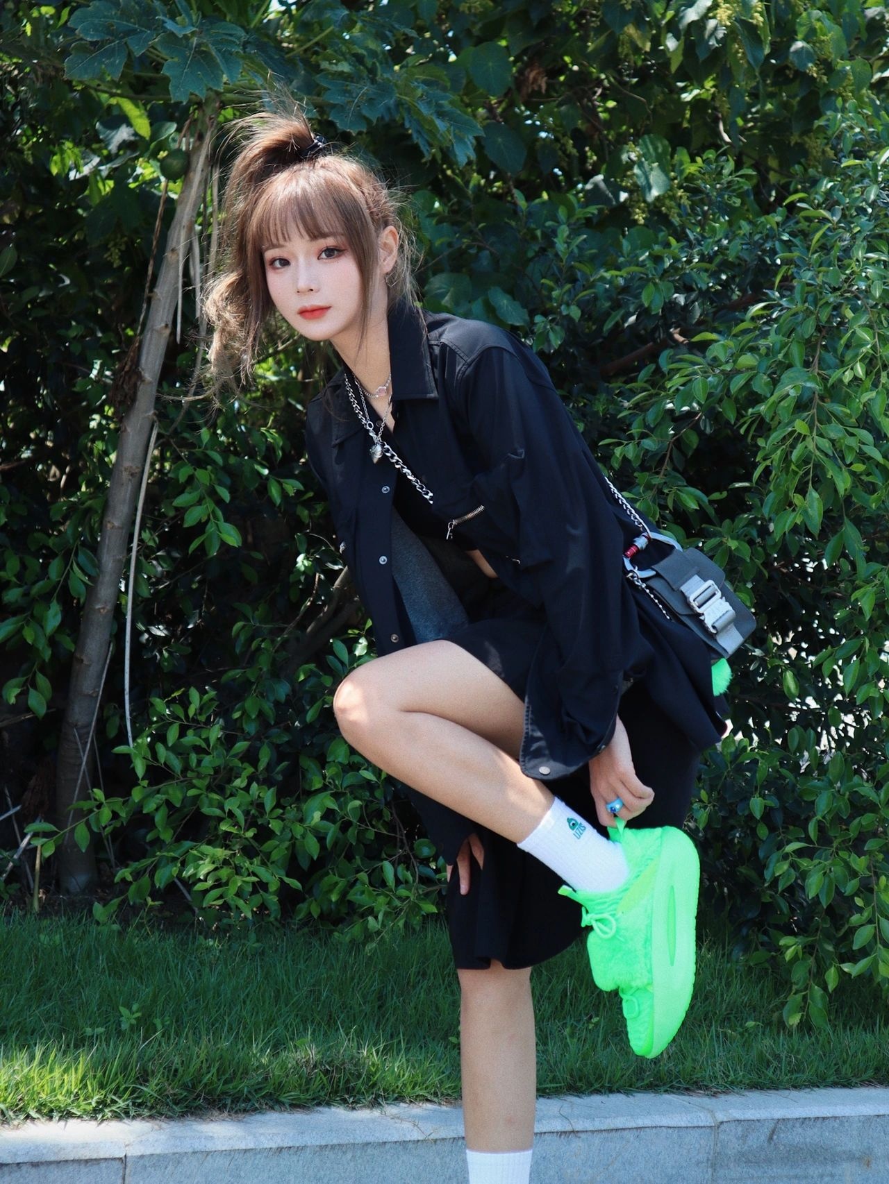 ▫️整体穿搭黑色,所以搭配吸睛的绿色单品啦,绿色鞋子在夏天也太吸睛了!