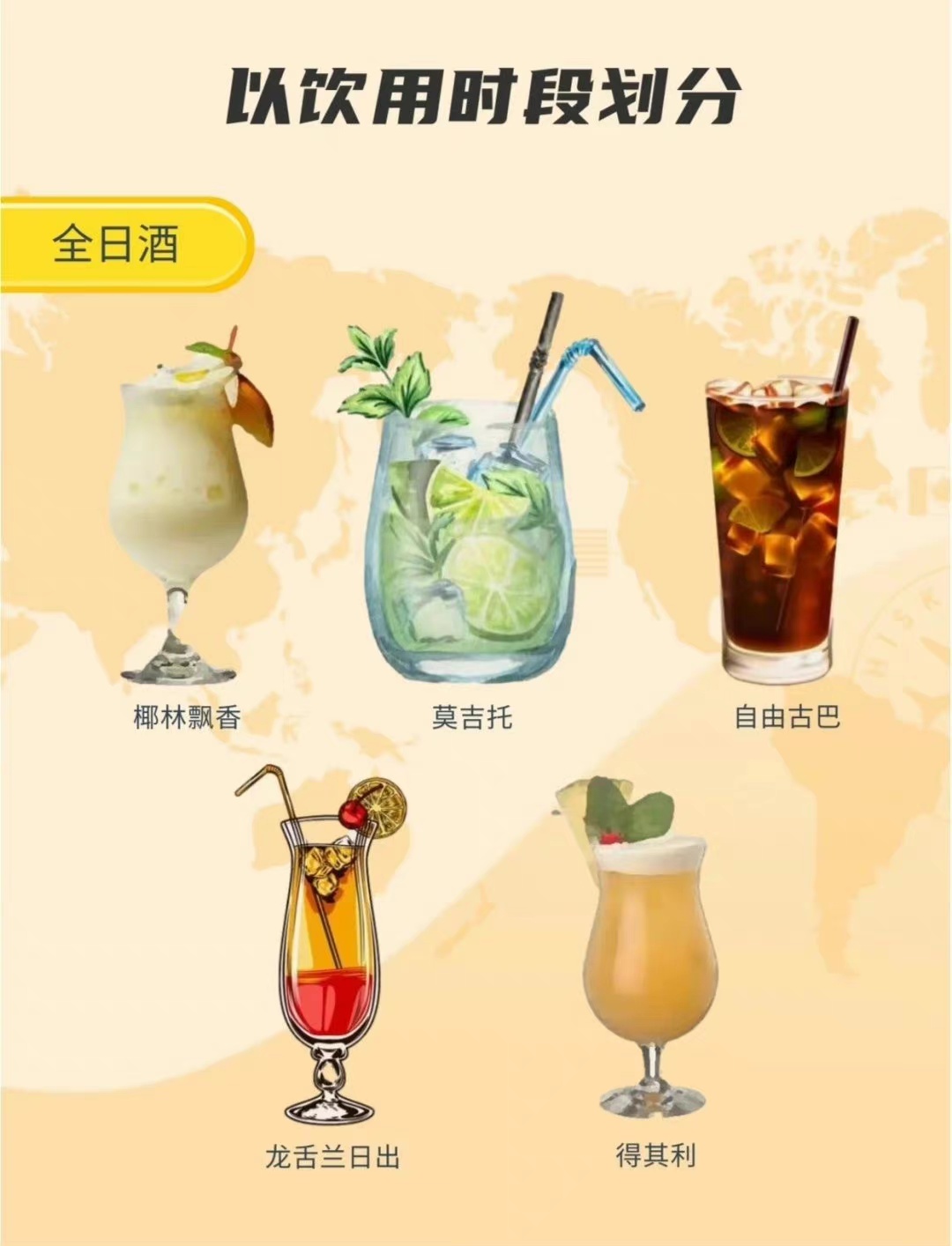 全日酒跟餐前餐后没有关系,是什么时间都可以引用的酒。如:自由古巴、得其利、莫吉托、椰林飘香、龙舌兰日出。