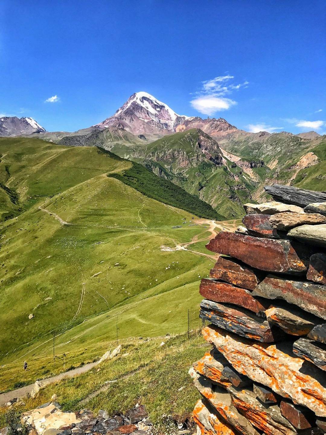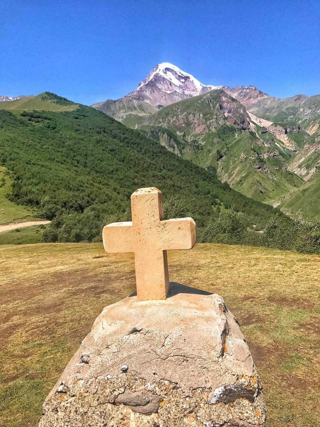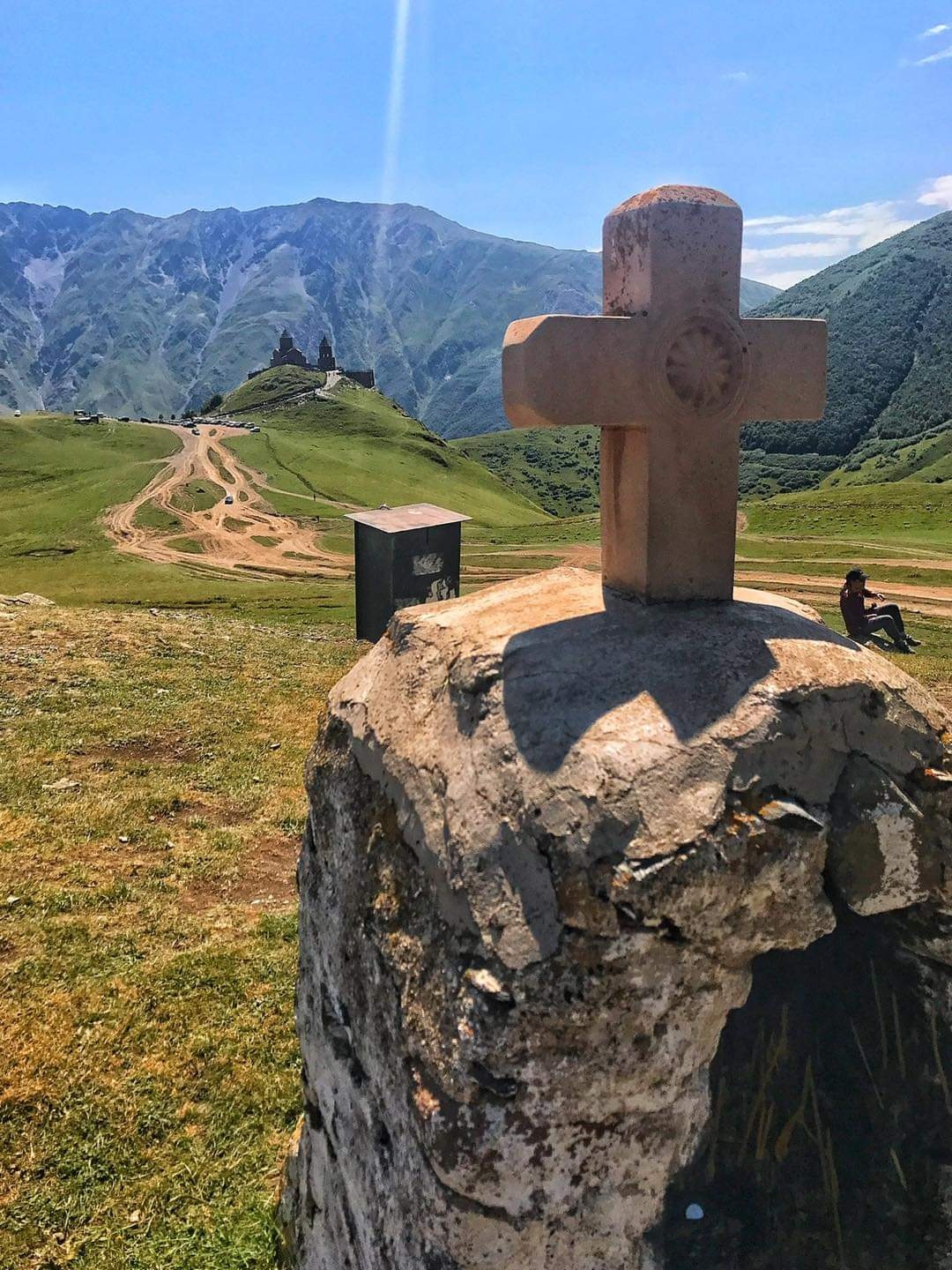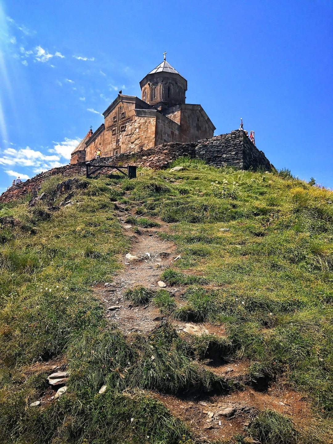 Gergeti Trinity,又被称为圣三一教堂,建于14世纪,矗立在卡兹别克山脉之中,被喻为最孤独和离天最近的教堂。正是他所处位置的偏僻和,才能远离战乱,至今基本上保存完整,很多重要的文物都被保存到现在。蹬卡兹别克山沿着公路徒步大约1小时到达圣三一教堂,不过相比公路,小路徒步上山更是美不胜收!也就1小时的路程。圣三一教堂就孤独地矗立在以海拔5000多米卡兹别克山为背景的,神秘圣洁而又荒凉。从斯特潘茨明达就可以远远看到山尖上矗立的教堂,巍峨。教堂所在之处,可以俯瞰卡兹别克全景,山脚下整个小镇都在自己脚下,从山上向下眺望,一览无余,享受着高山所带来的美景。这绝对是最值得打卡的格鲁吉亚景点了!