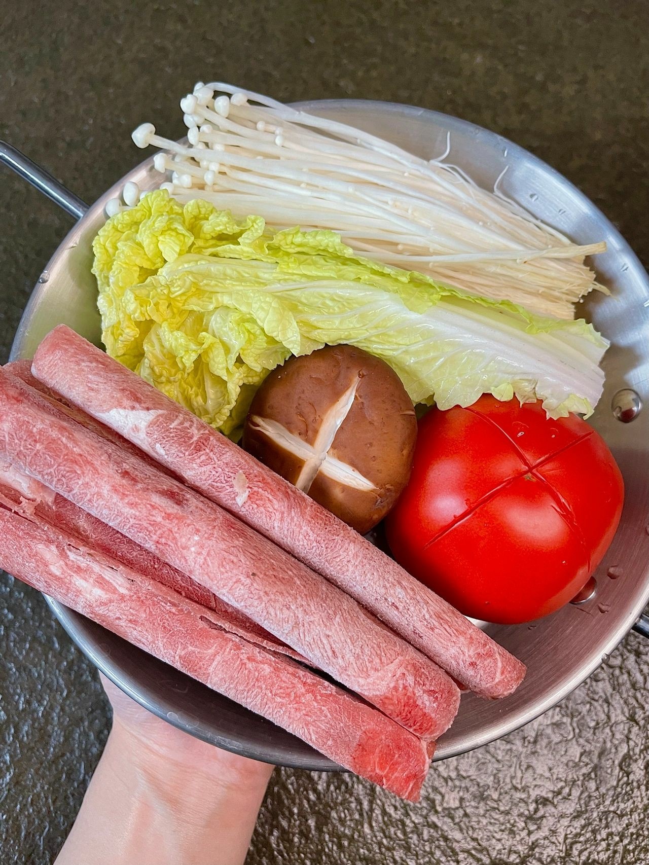 番茄、肥牛、香菇、娃娃菜、金针菇、葱花