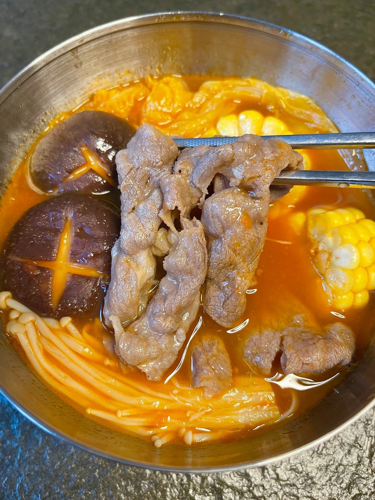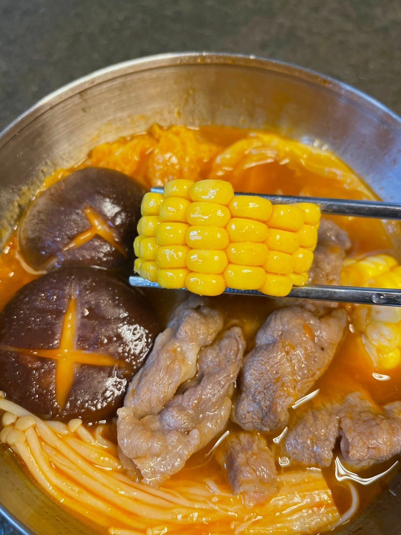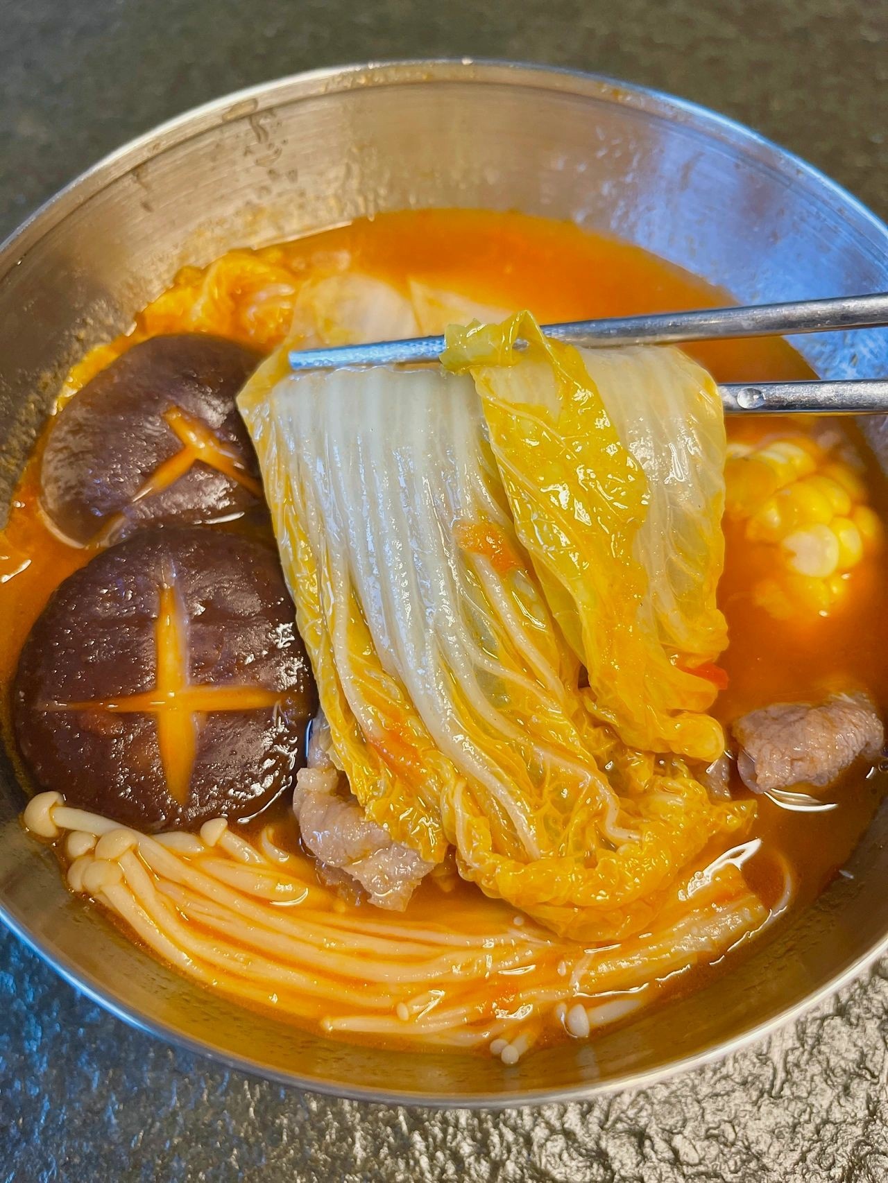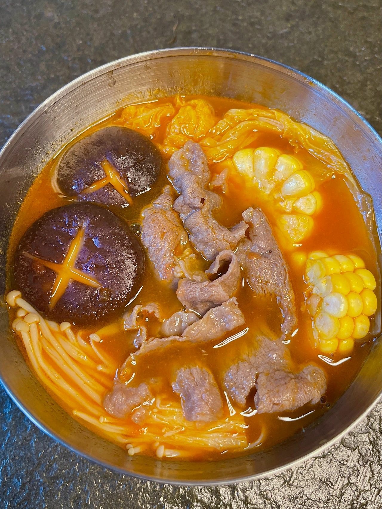 3⃣️水烧开后加入娃娃菜、金针菇和香菇,煮3分钟,加入1茶匙盐,加肥牛煮1分钟就差不多可以出锅啦