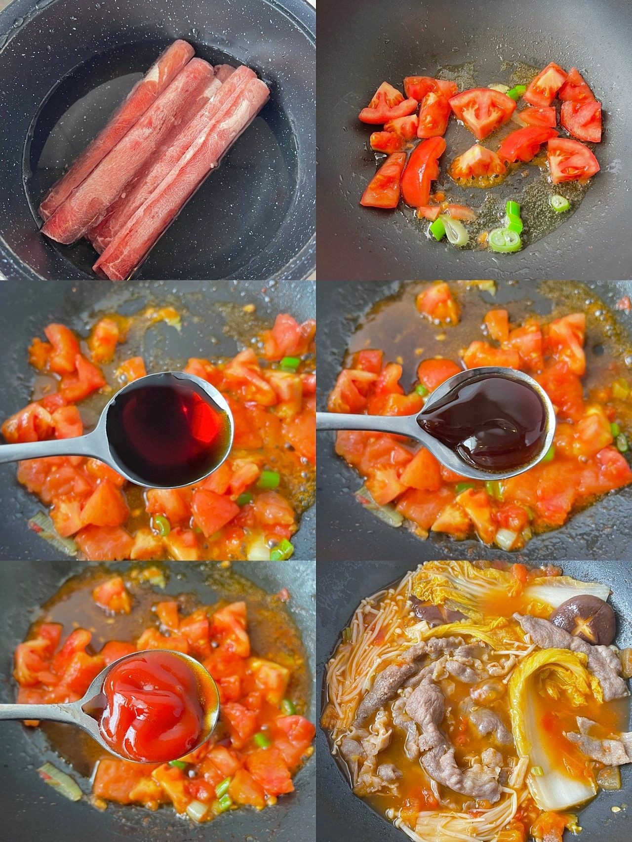 1⃣️番茄去皮切成块,娃娃菜掰开洗干净、金针菇洗干净去根,肥牛焯水去掉血沫捞出备用