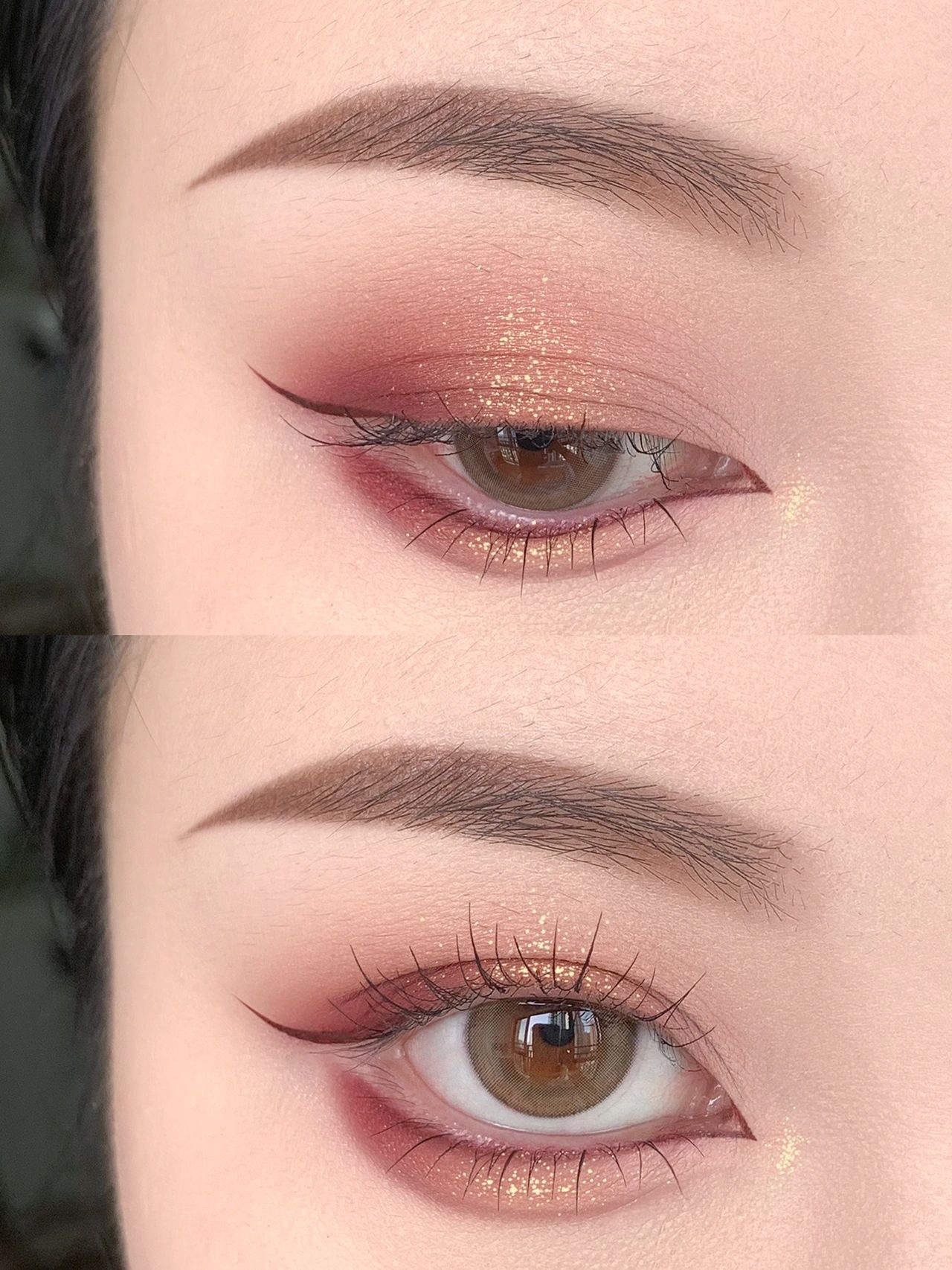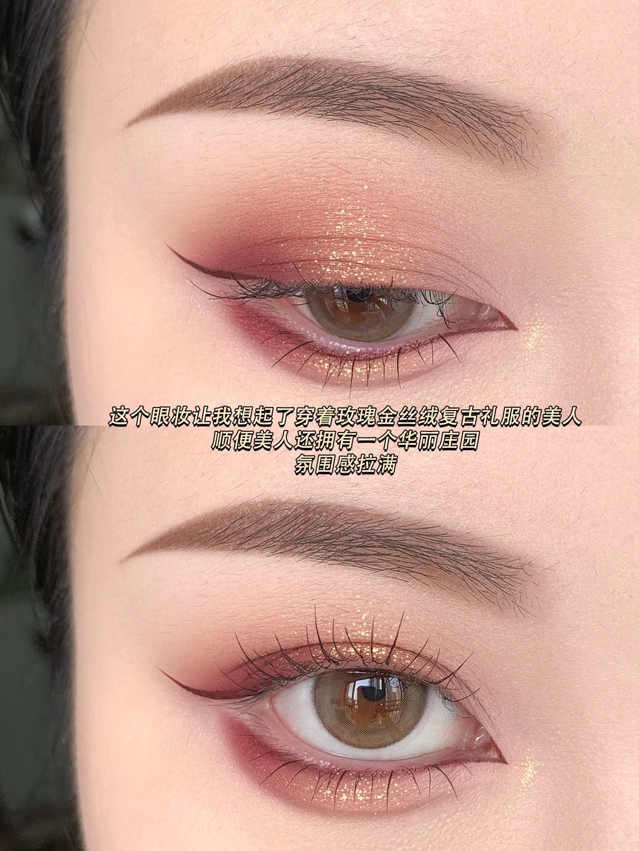 2️⃣眼妆用了多个颜色叠加,豆沙粉色作为底色,有玫瑰的娇嫩感。橘红色+酒红色的叠加增加了复古华丽感,最后用碎钻爆闪+金色爆闪叠加,让眼睛更有立体感的同时,增加了金丝绒的氛围,高贵感出来了‼️