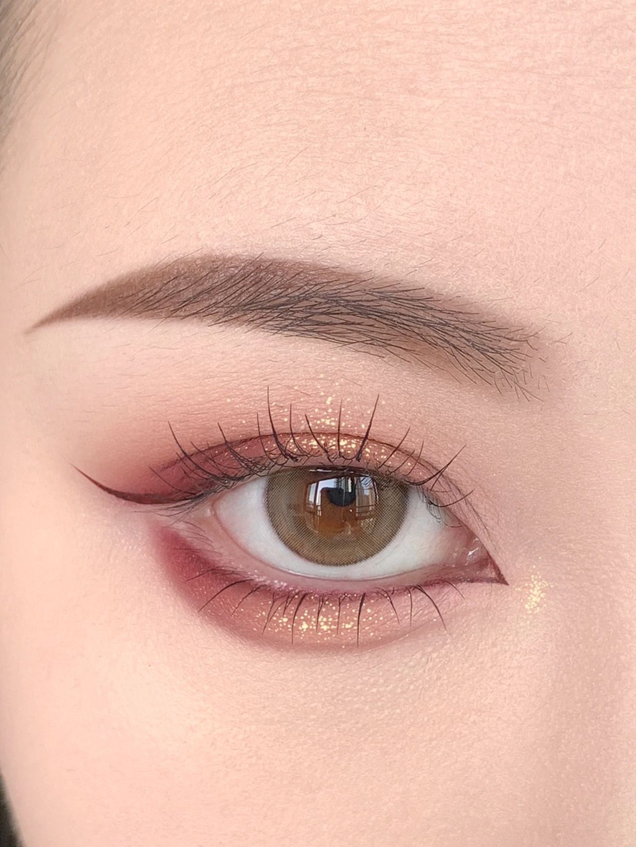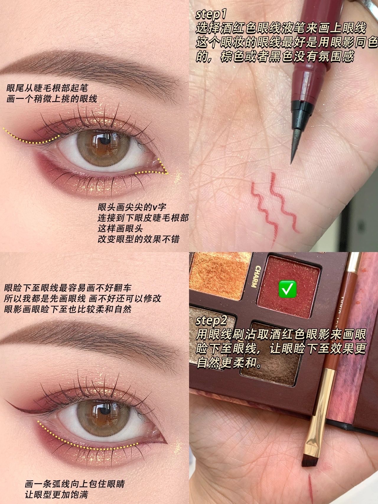 1️⃣先画眼线,眼线最好是跟眼影同色系的,这样眼妆整体氛围感更好。眼线液笔画上眼线以及开眼角眼线,眼影画眼睑下至眼线(如果这里用黑色或者棕色眼线,效果真的会差不少,还会显脏‼️