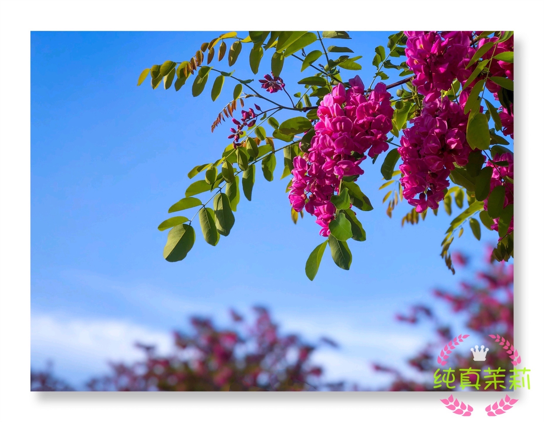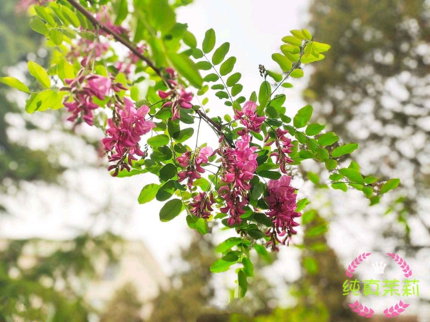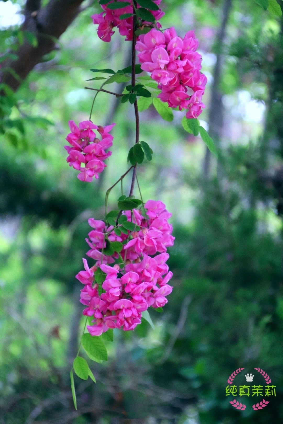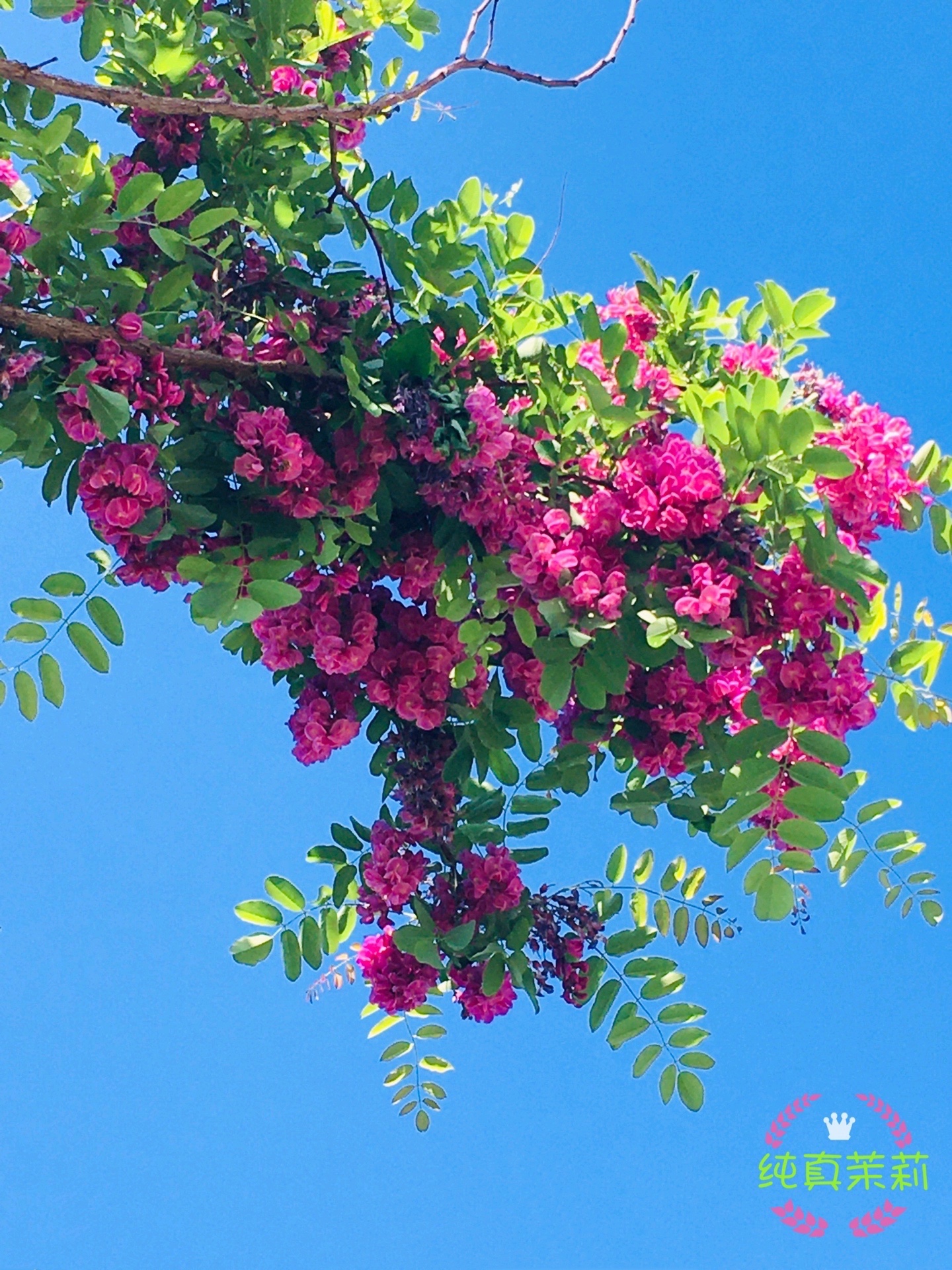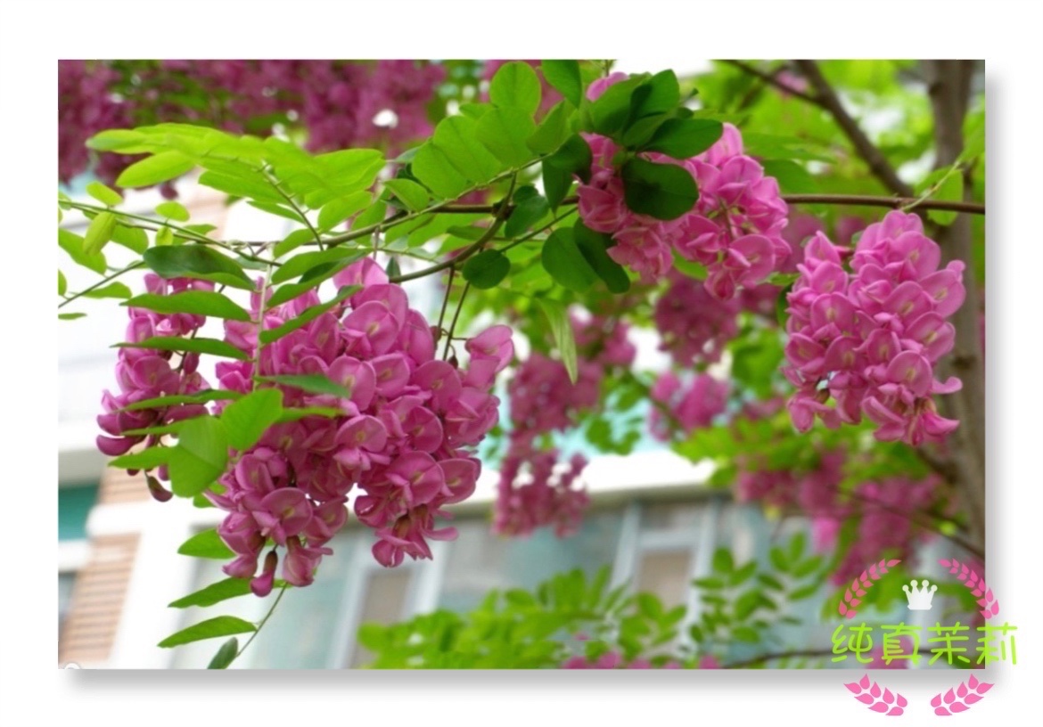 玫红色的槐花象娇艳的被风吹开的喇叭,把五月的浪漫故事一串串地高挂枝头,用艳丽色彩将五月浓重地渲染!