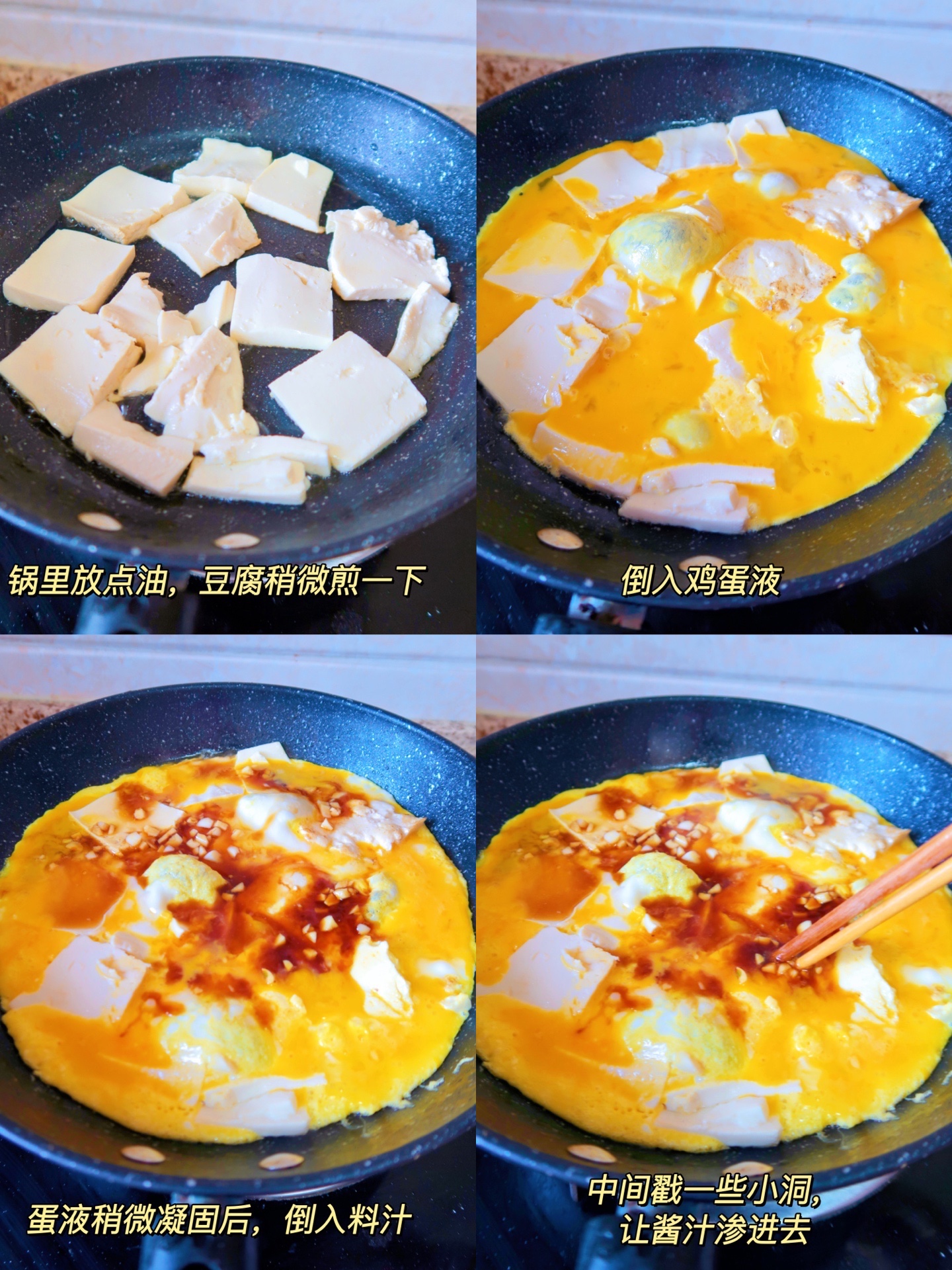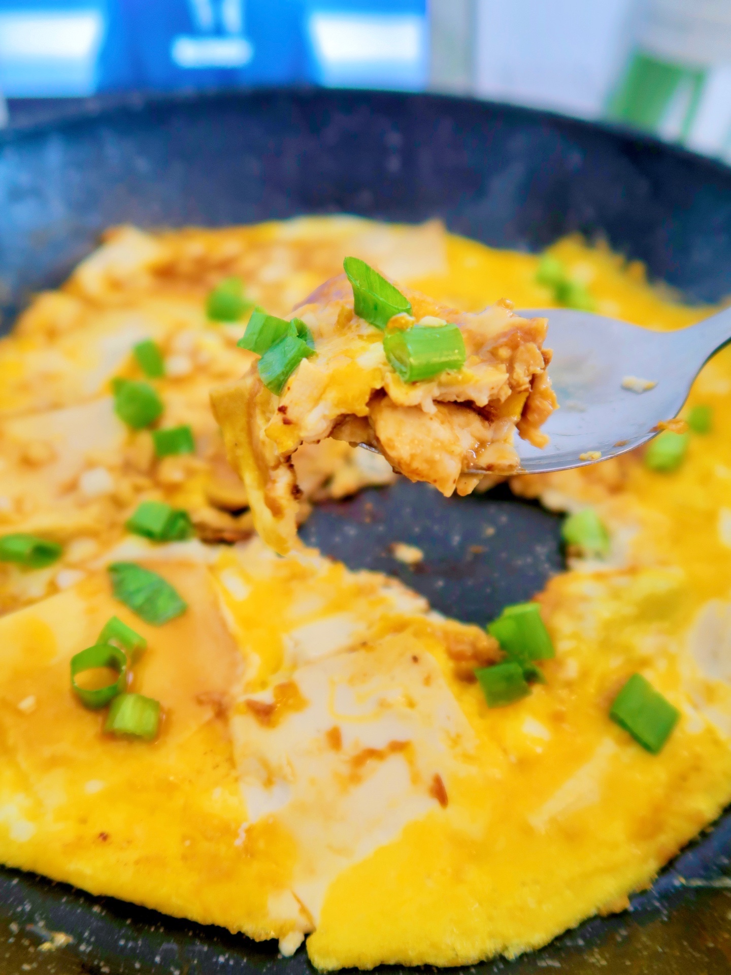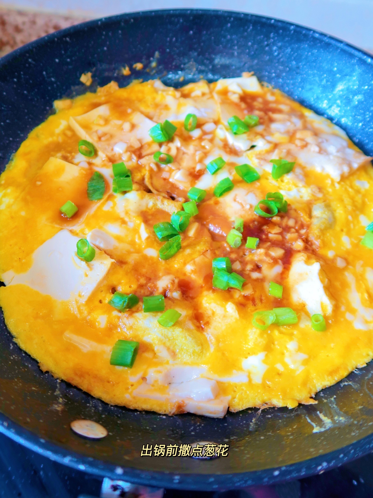 3⃣️倒入蛋液,等蛋液稍微凝固倒入料汁,中间戳一些小洞让料汁流进去,出锅前撒点葱花