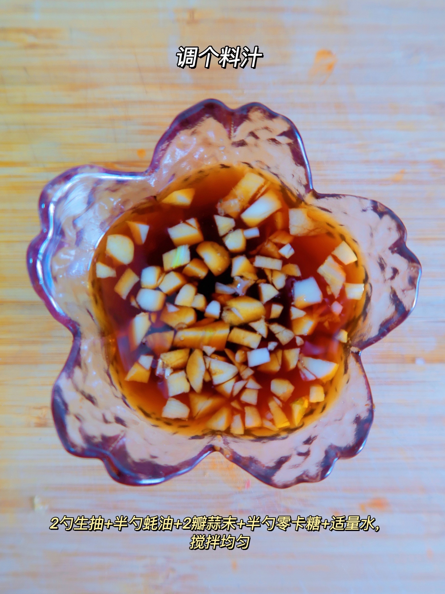 1⃣️调个料汁:2勺生抽+半勺蚝油+2瓣蒜末+半勺零卡糖+适量水,搅拌均匀