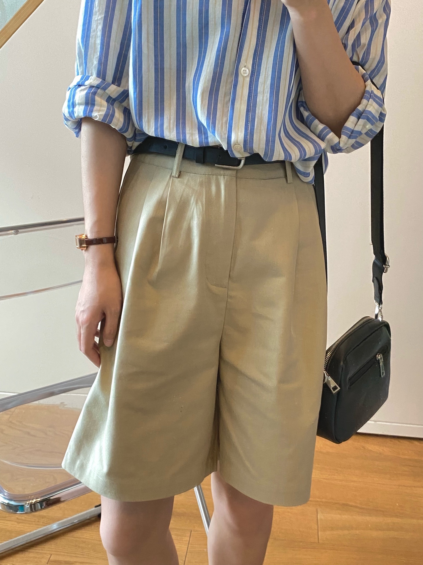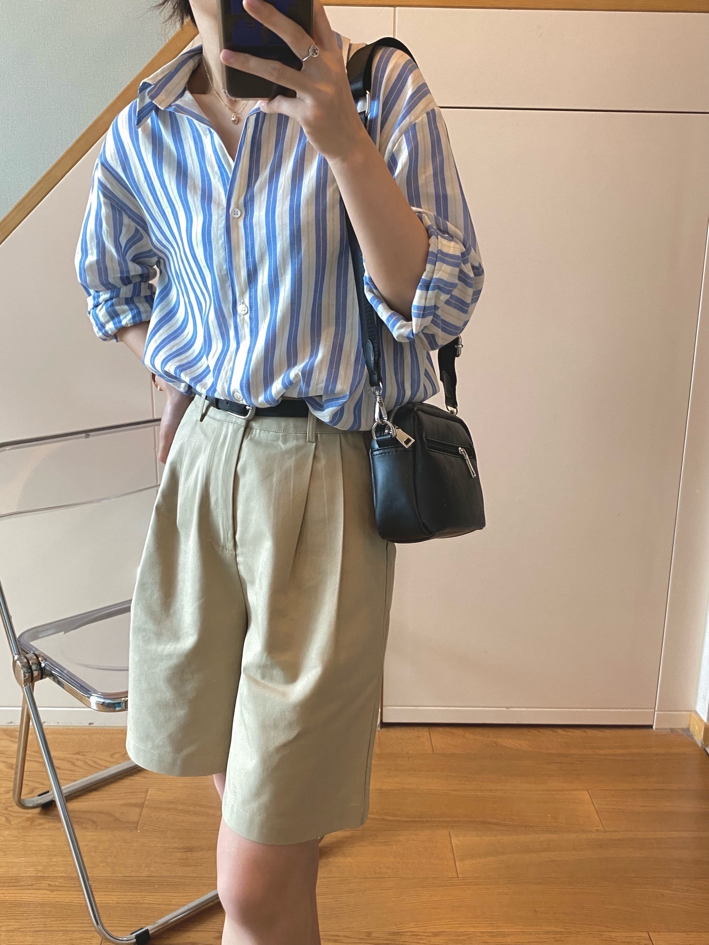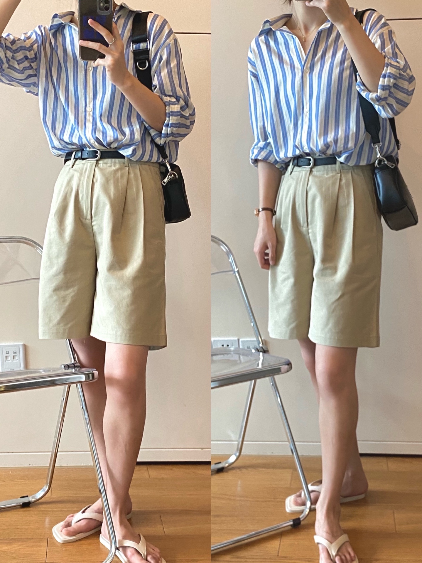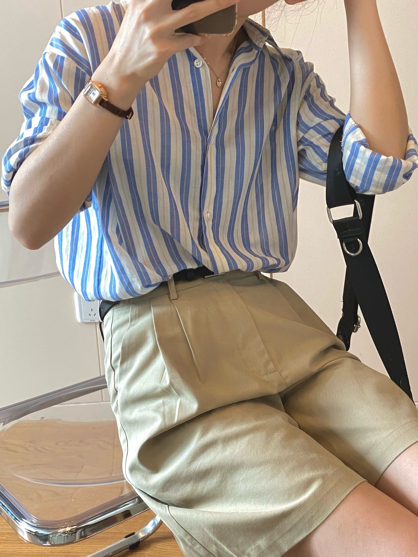 163cm女孩蓝色条纹防晒衬衫配卡其短裤,通勤风简约穿搭