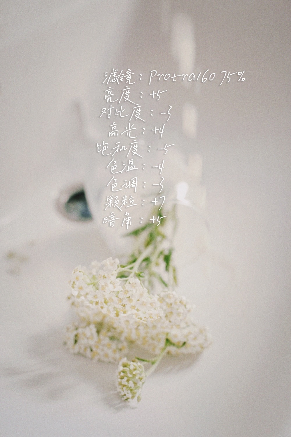 亮度+5、对比度-3、高光+4、饱和度-5、色温-4、色调-3、颗粒+7、暗角+5;