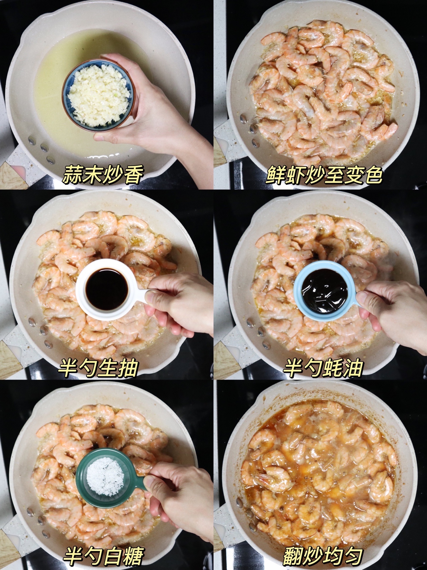 2⃣️、热油(多一点),蒜蓉炒香,放入鲜虾,炒至变色。