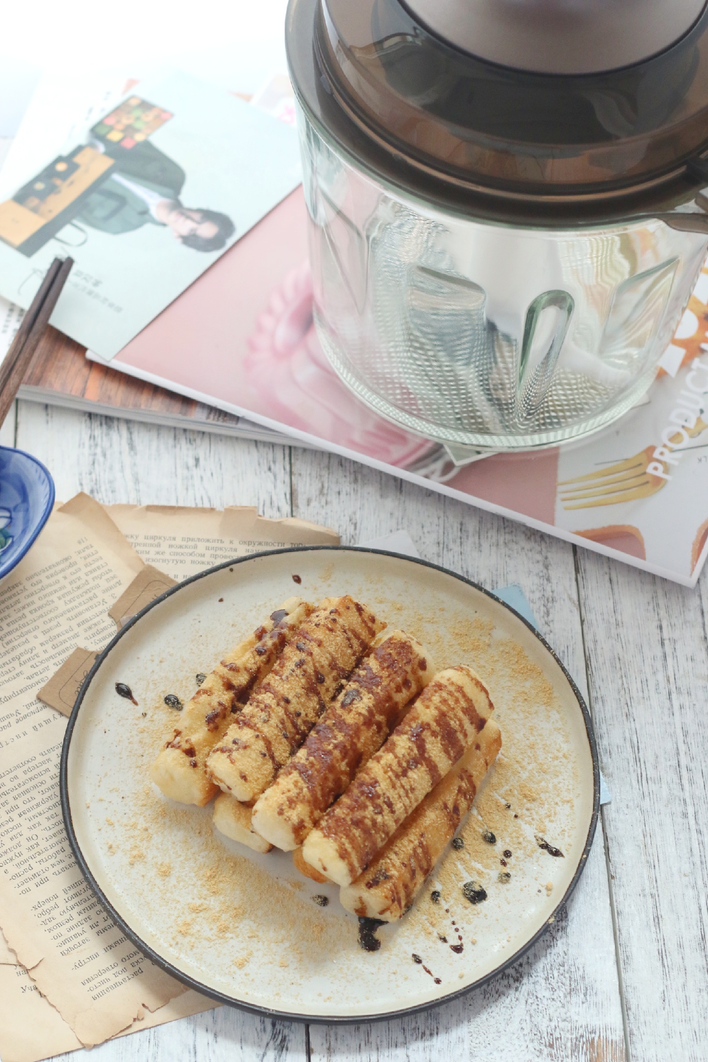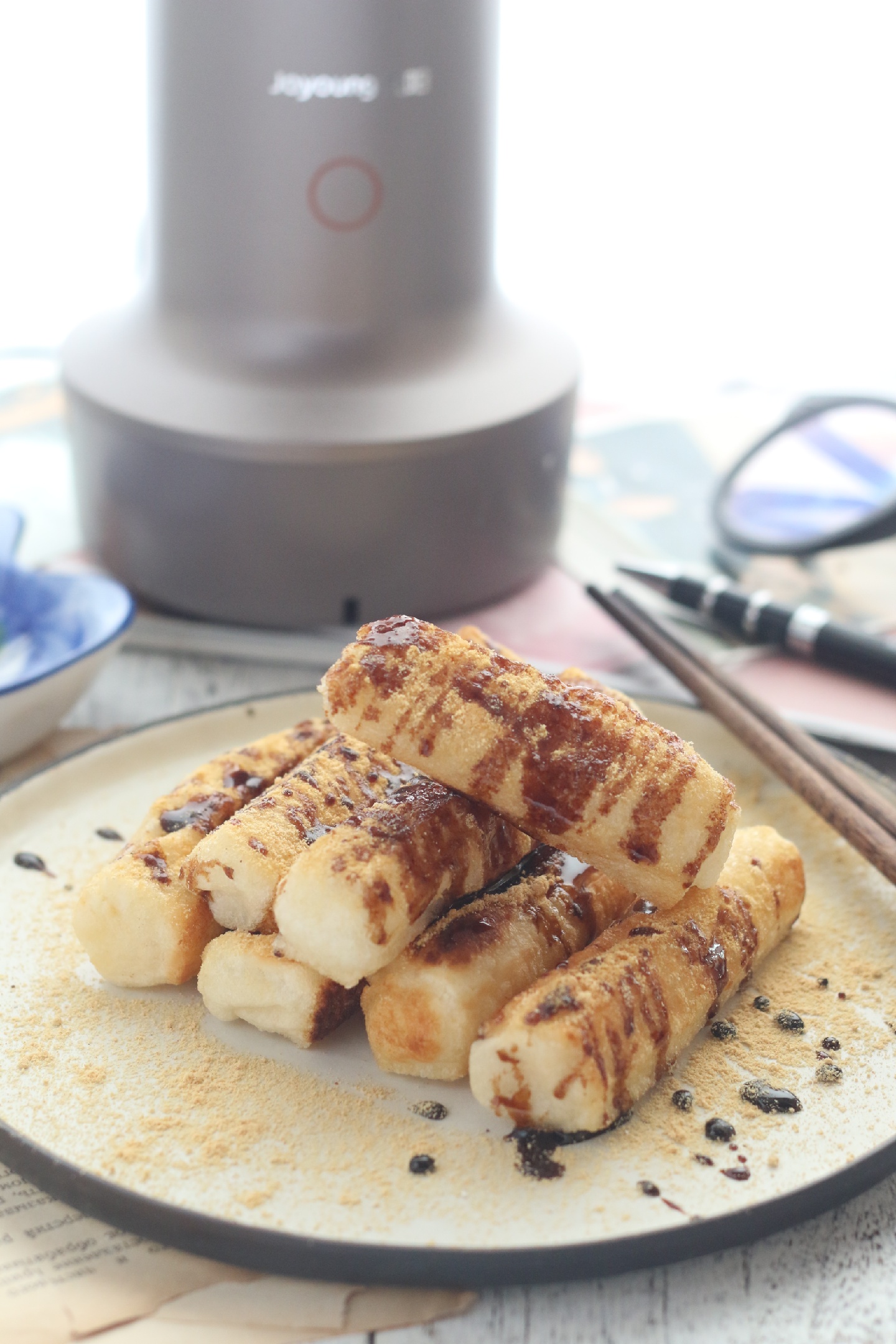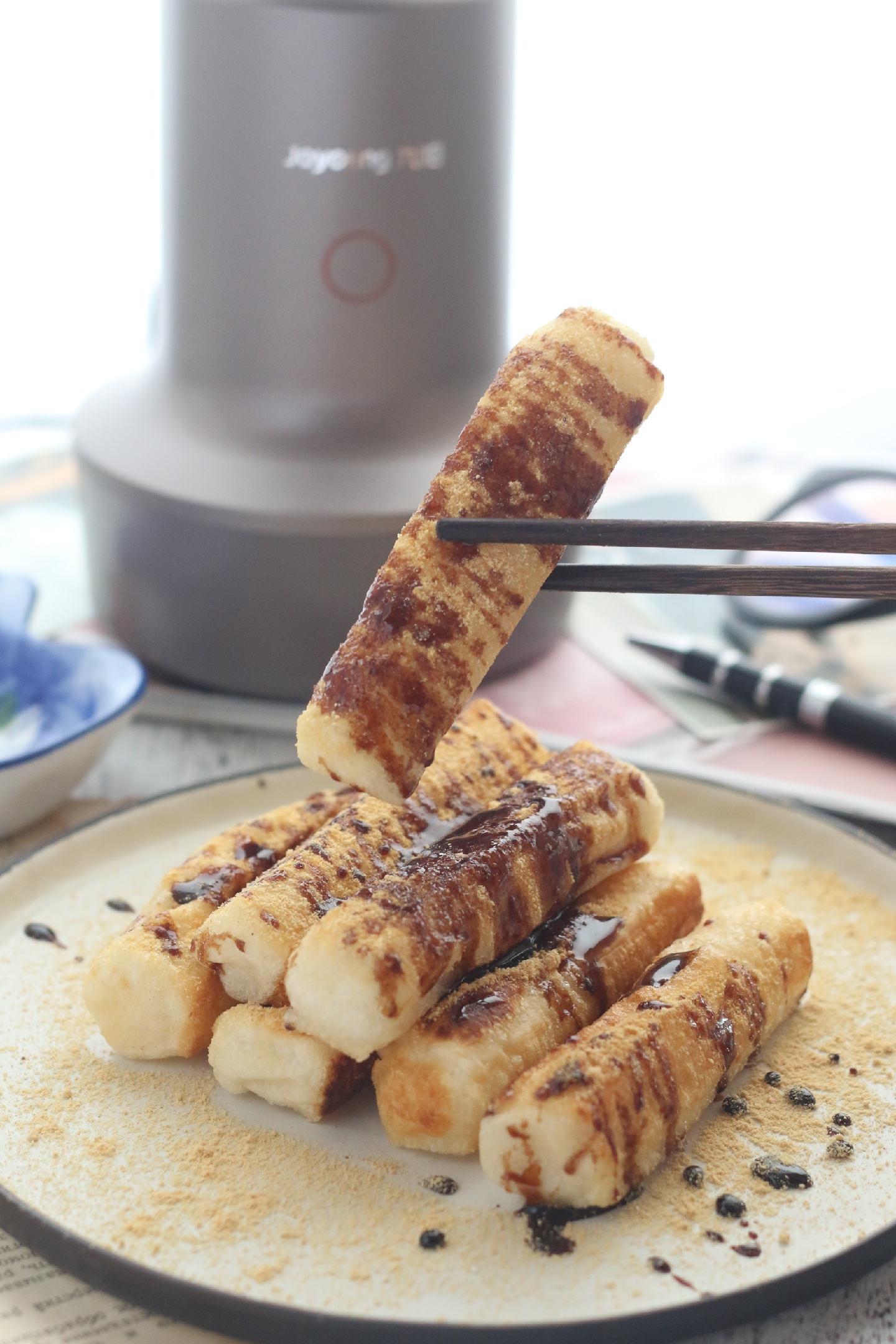 7,摆在盘内,撒适量黄豆粉,再将糖浆淋在表面即可!