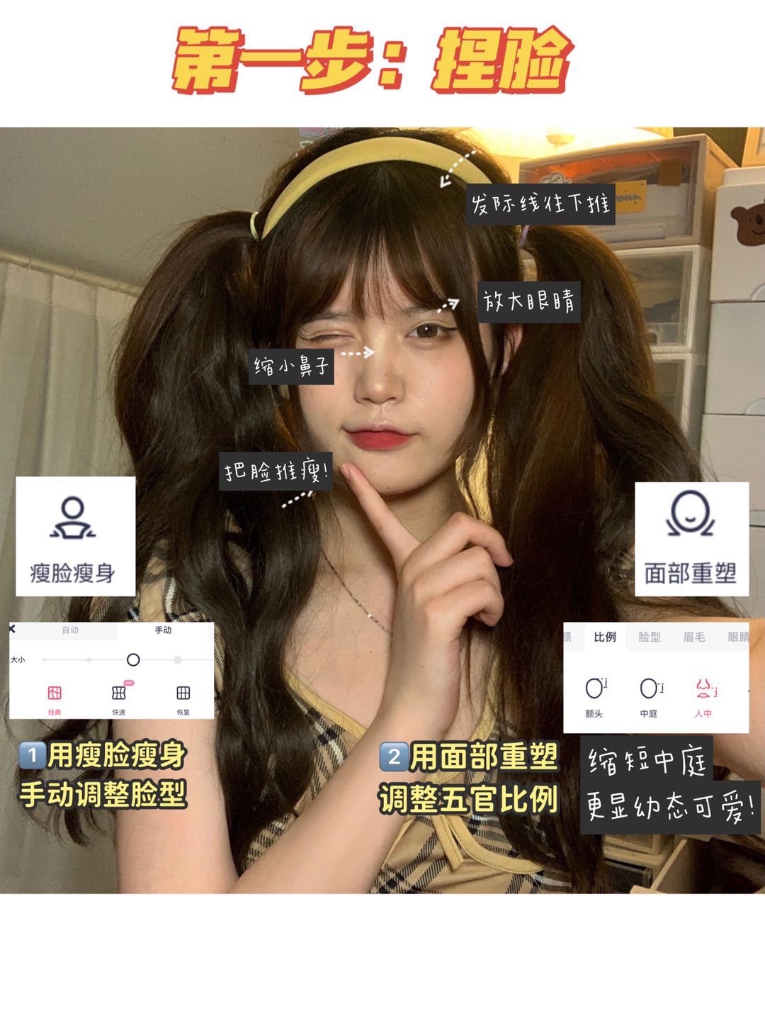 1️⃣捏脸:用瘦脸瘦身推一下脸型,让面部线条变得流畅!再用面部重塑调整五官比例