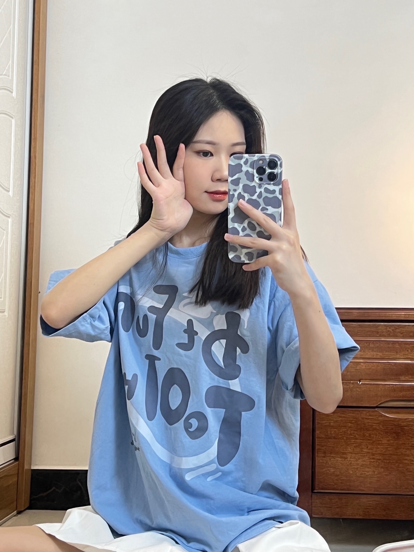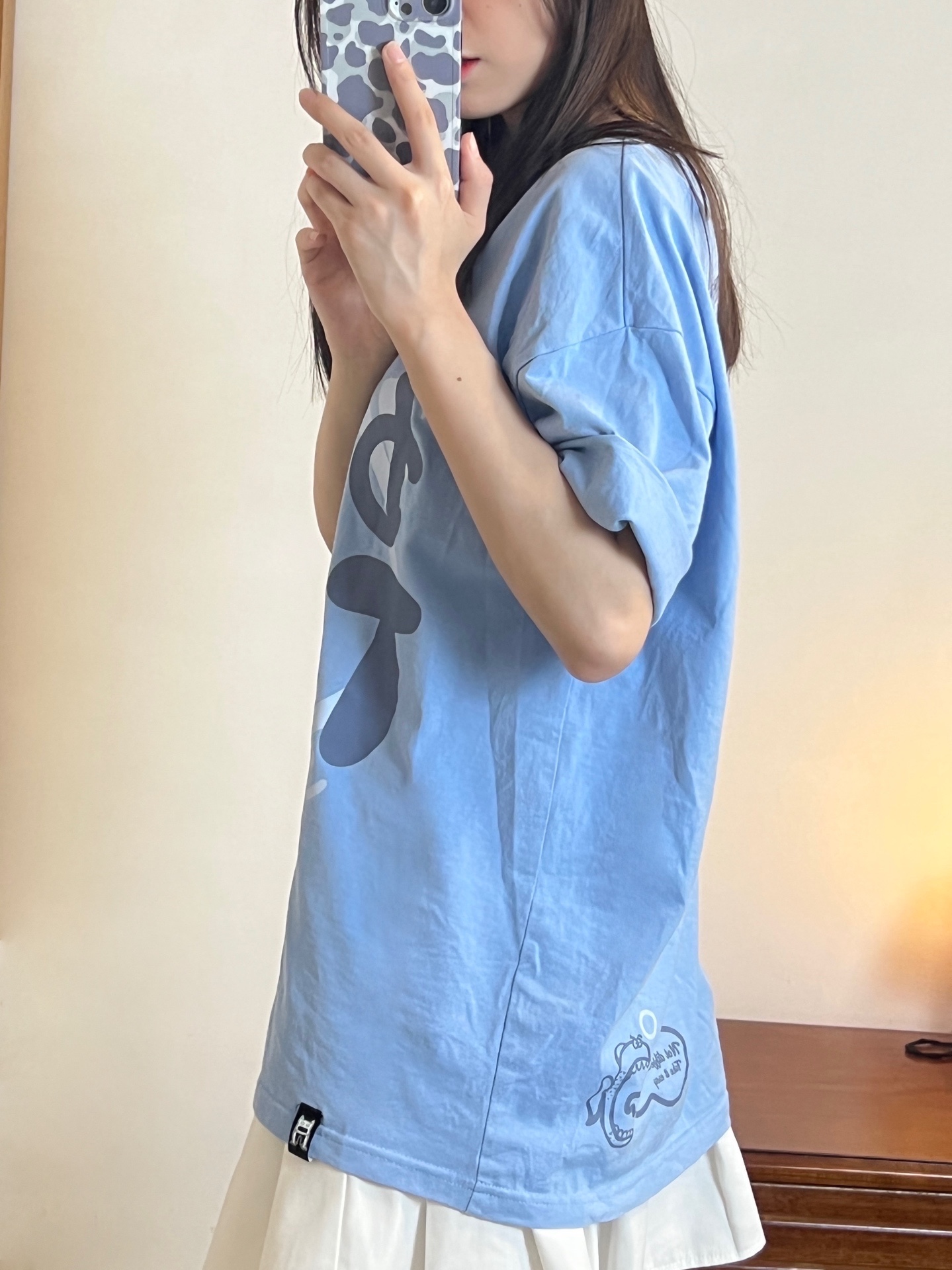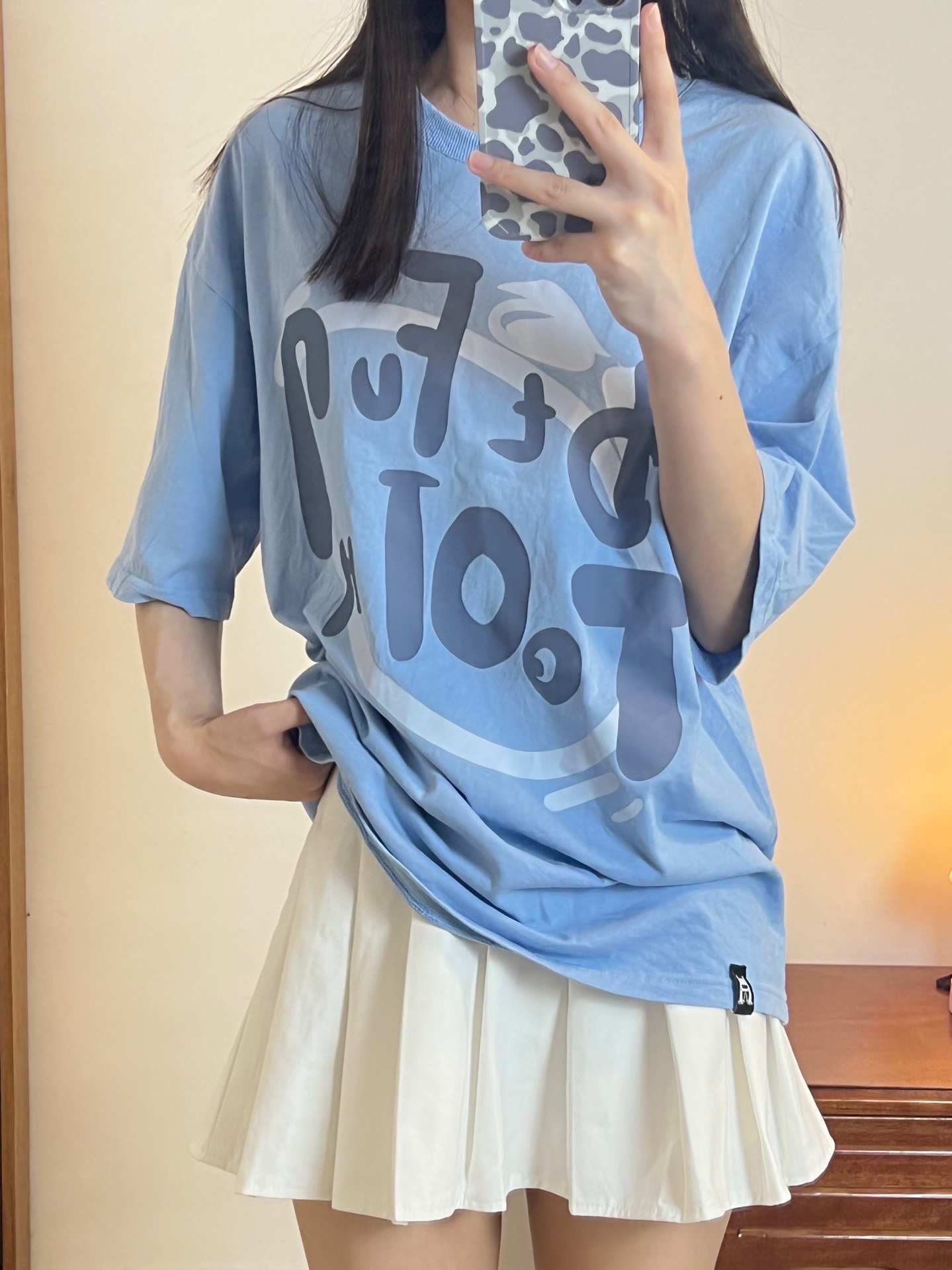 蓝色T恤夏天穿真的好清爽➕搭配白色短裙 元气少女感爆棚~