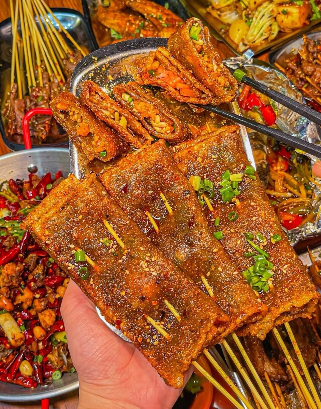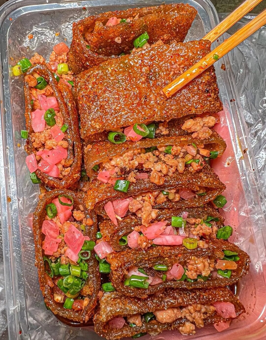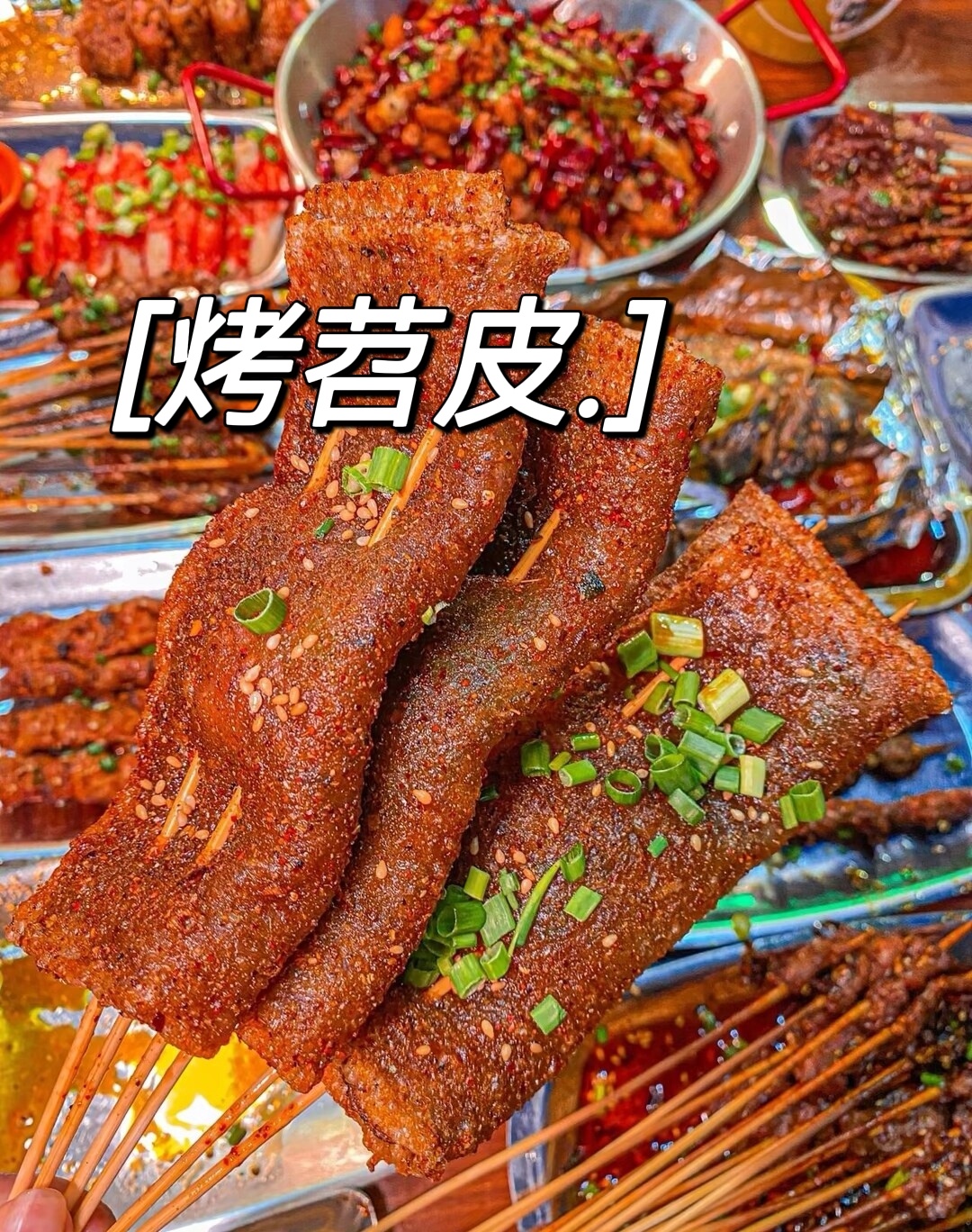 来重庆一定要吃的烤苕皮,糯叽叽的苕皮里包裹着葱花和酸萝卜😶