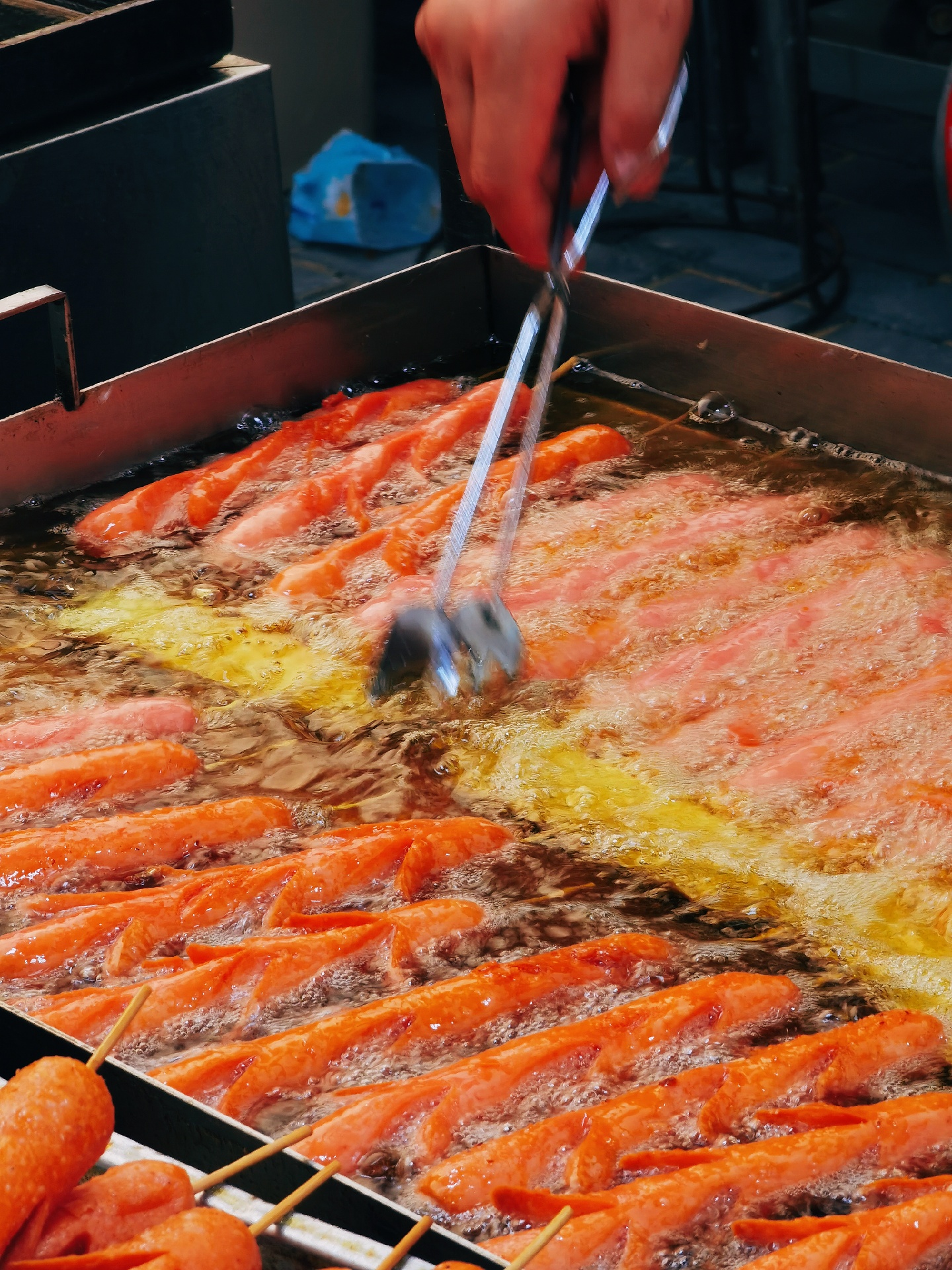 🍢炸香肠/炸年糕:炸出来又香又脆,撒上芝麻涂上酱,年糕糯叽叽的真香,但是很占肚子,建议最后吃