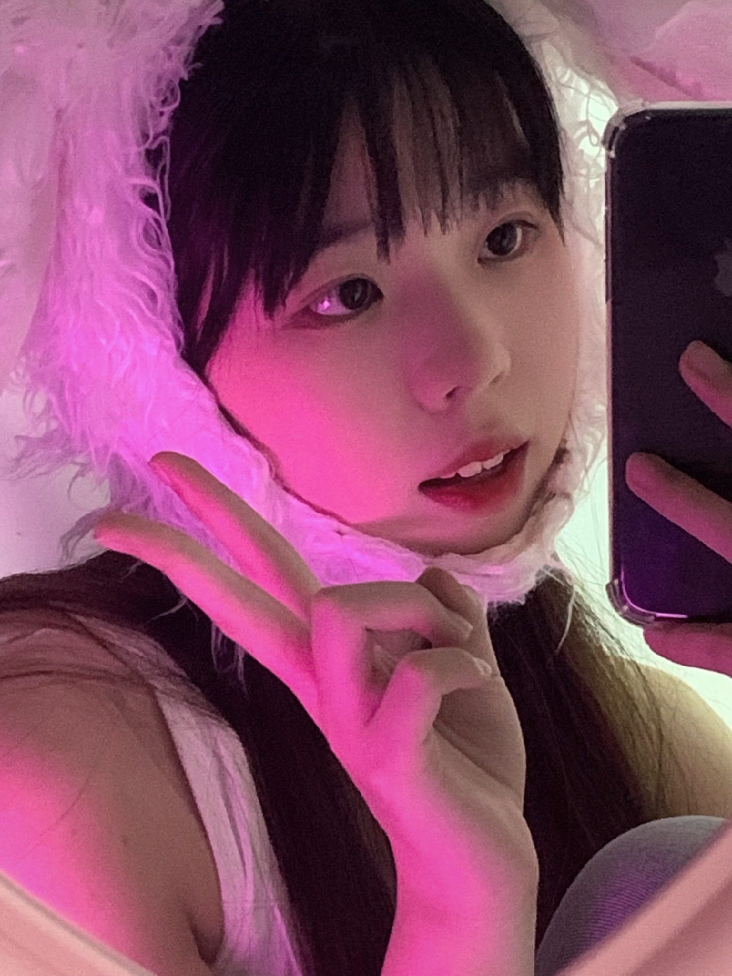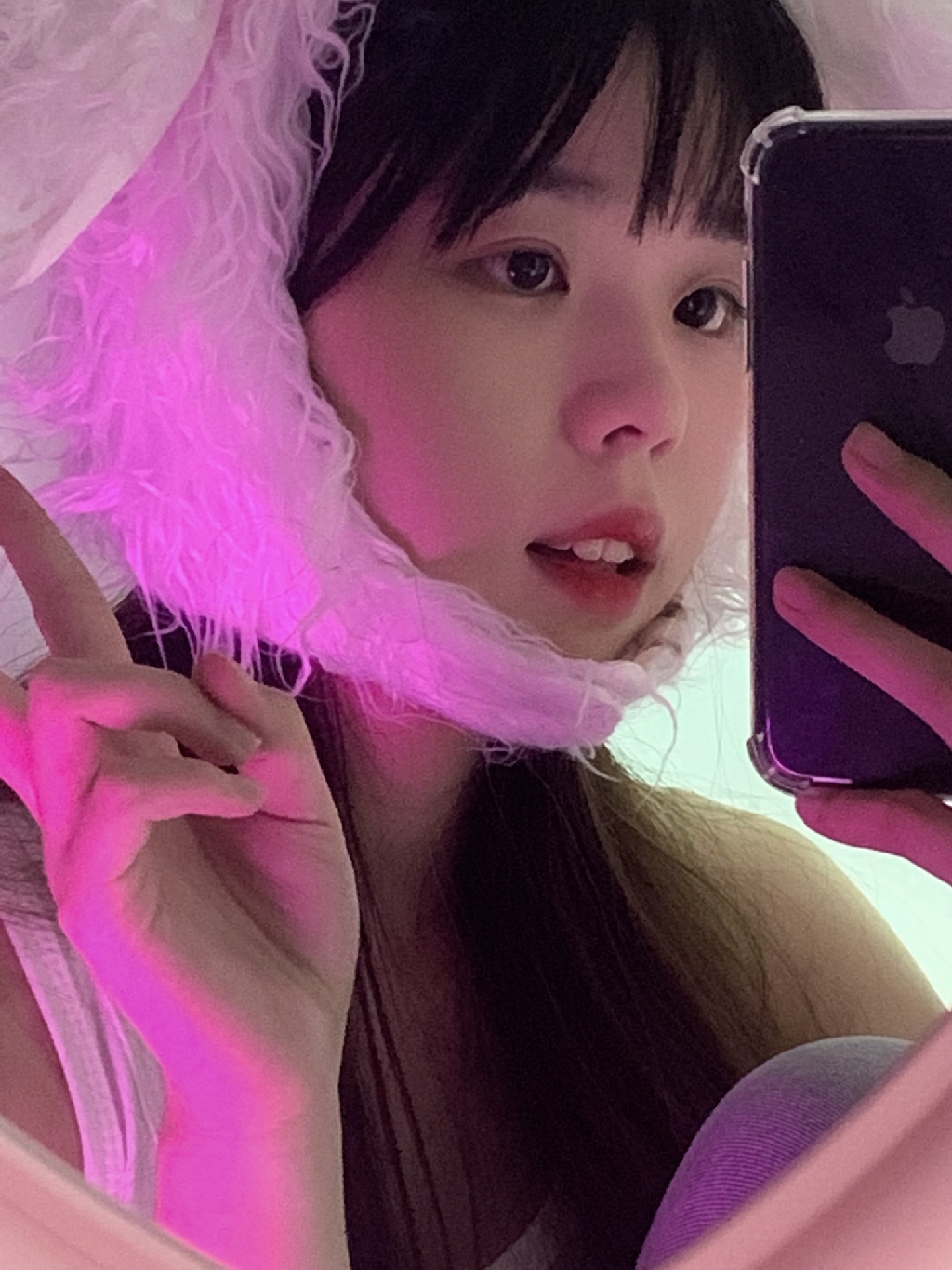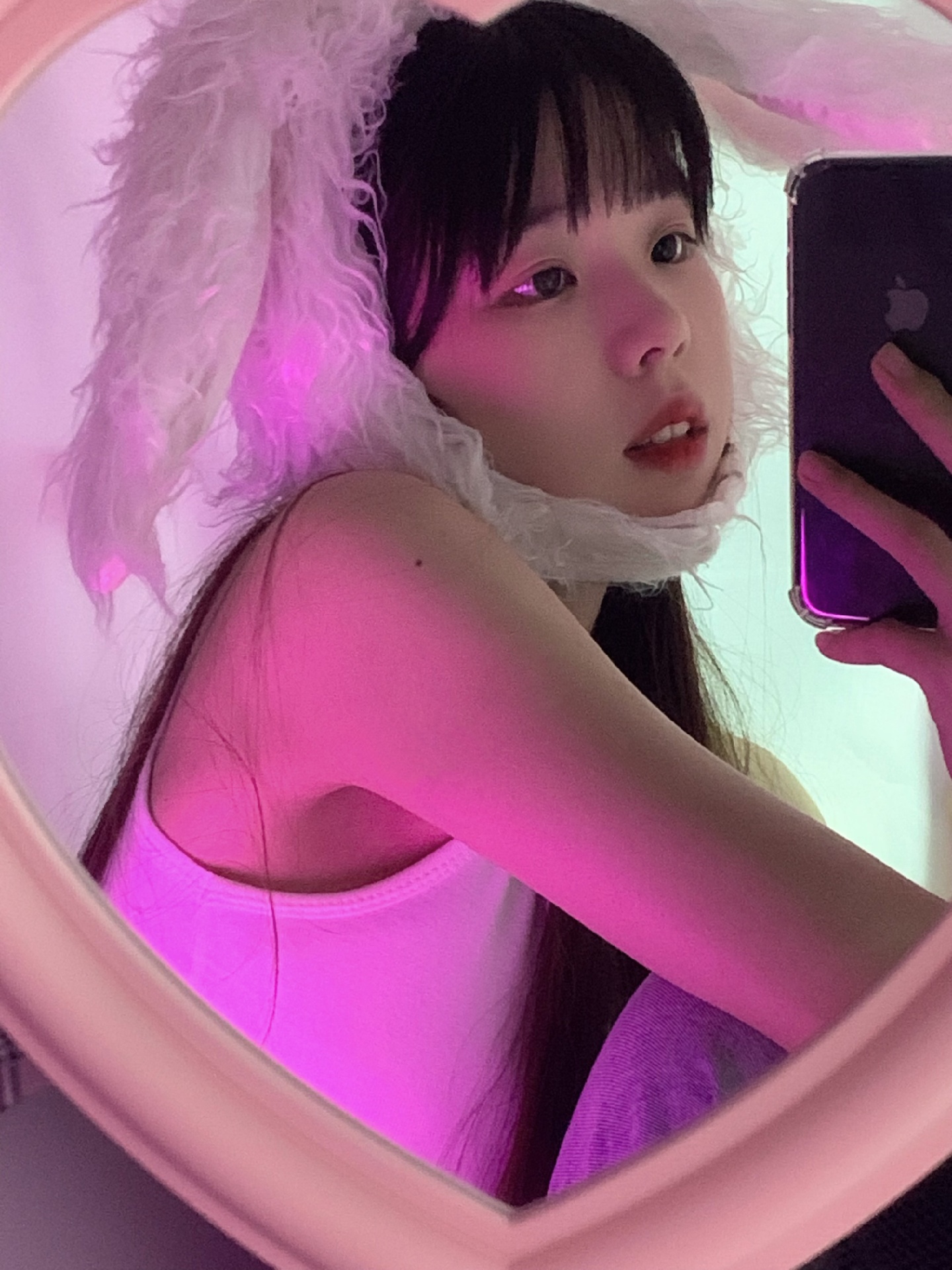 粉色氛围灯+兔子头套对镜自拍真的绝了