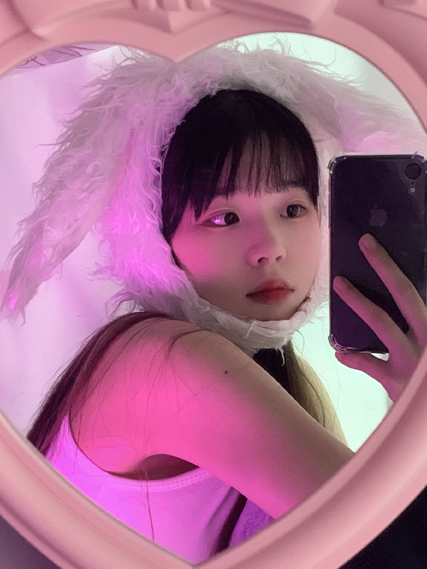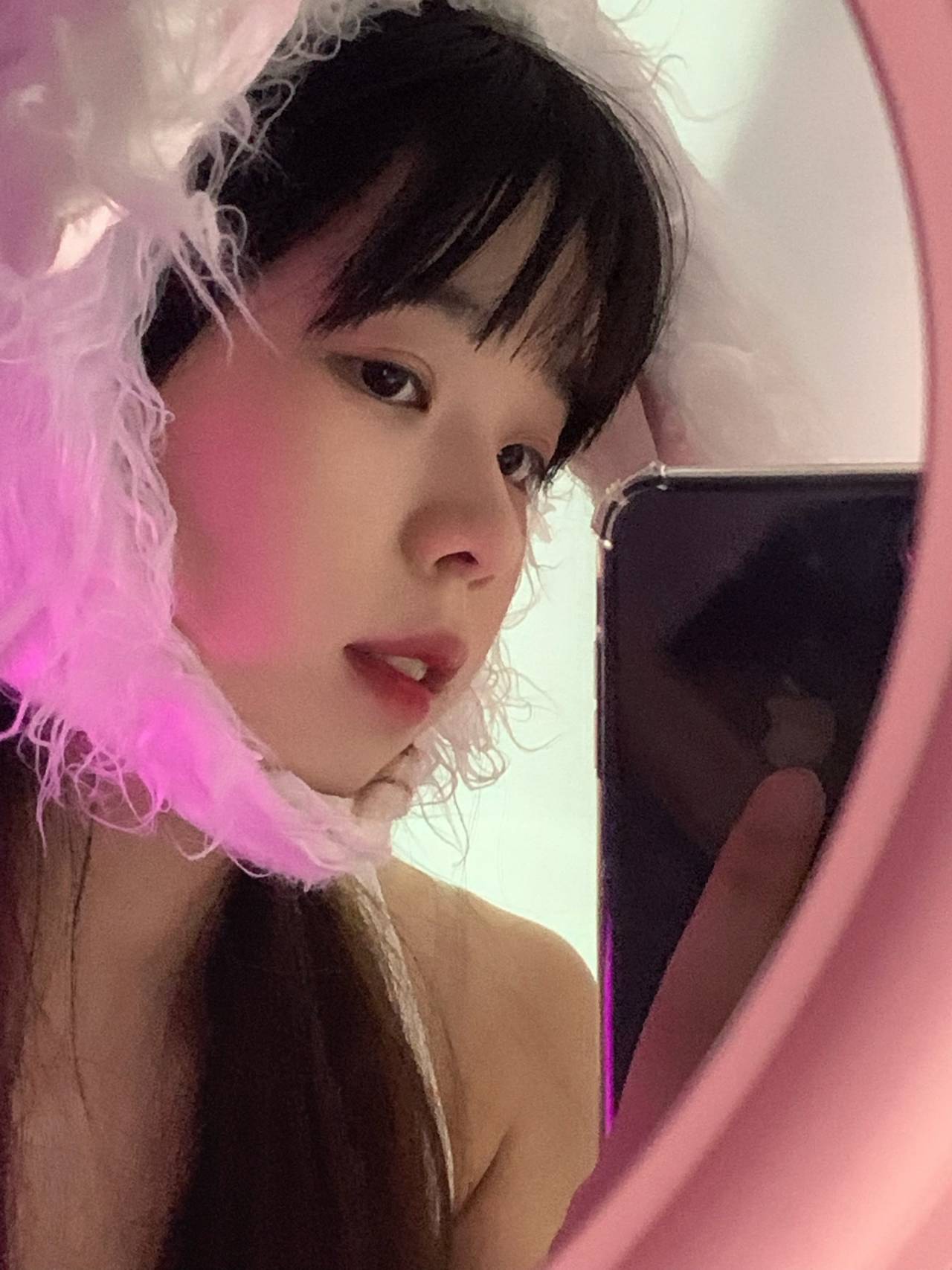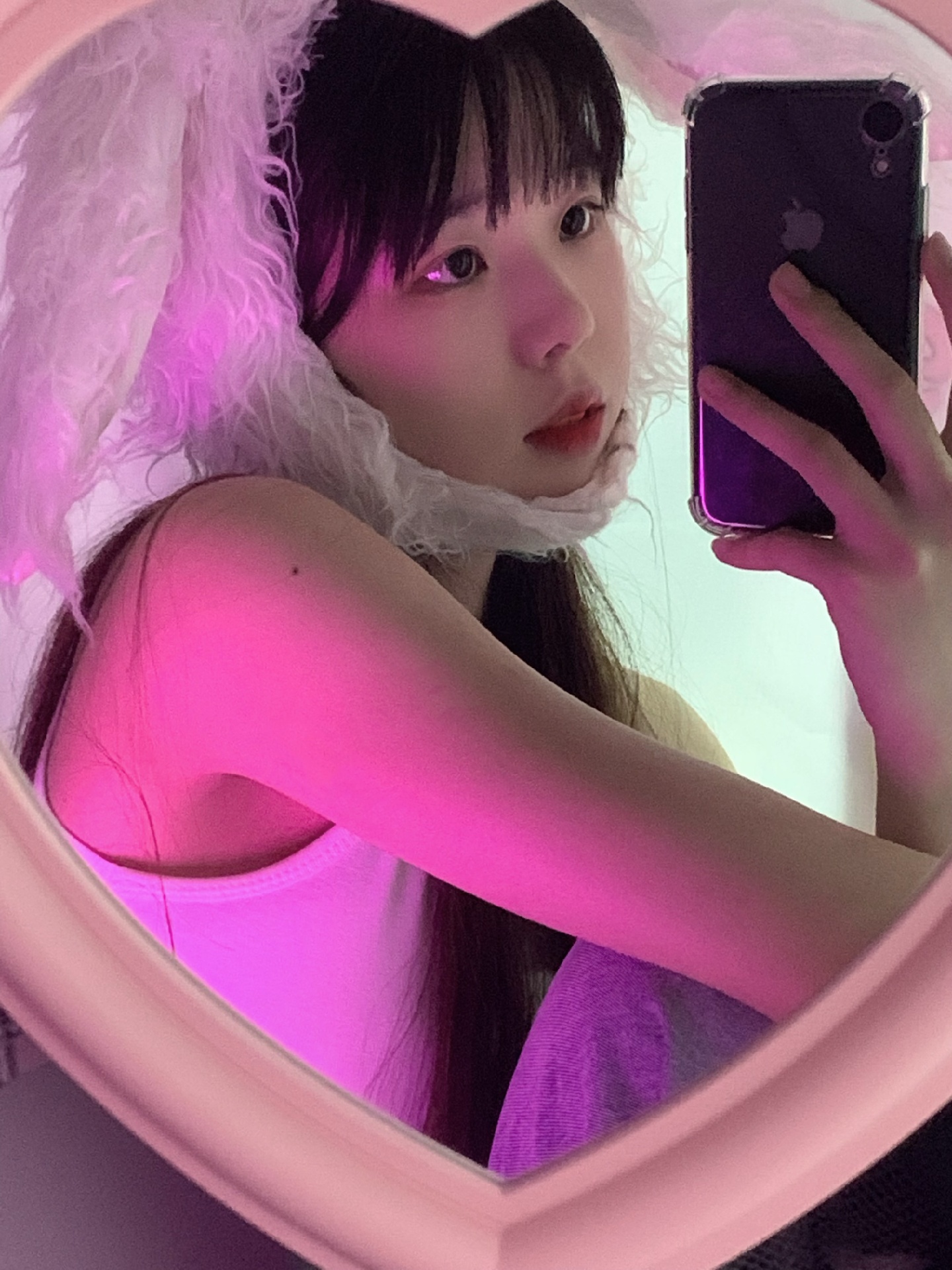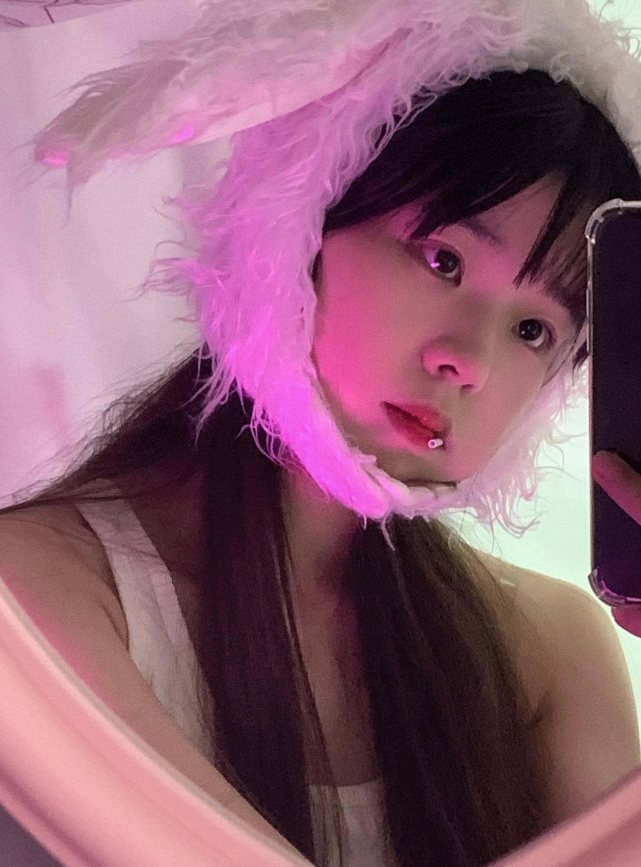 粉色氛围灯+兔子头套对镜自拍真的绝了