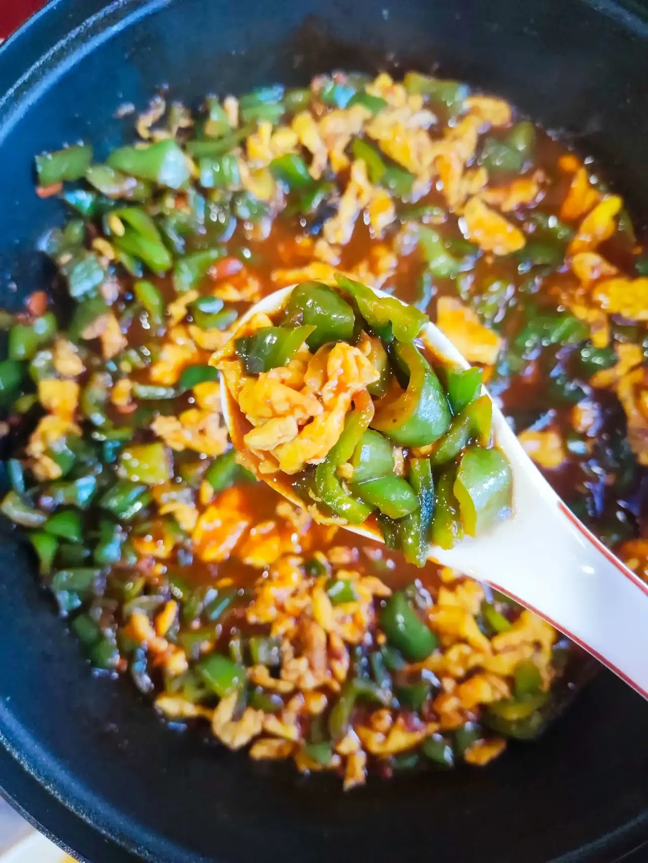 5、热锅冷油,倒入青椒炒香,倒入酱汁,煮开。