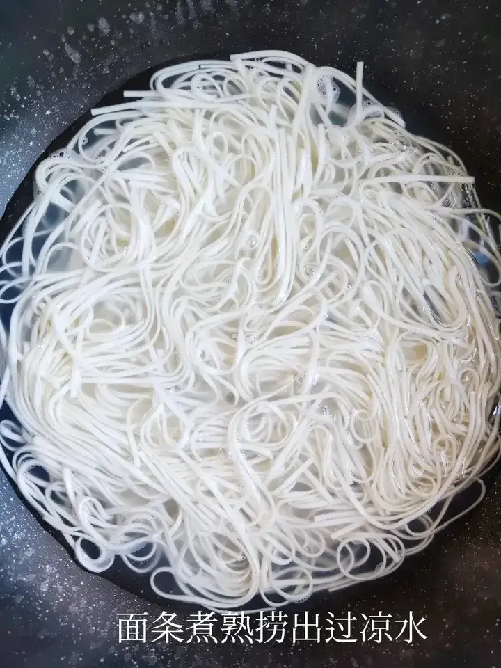 2、水开下面条,煮熟过凉水捞出。