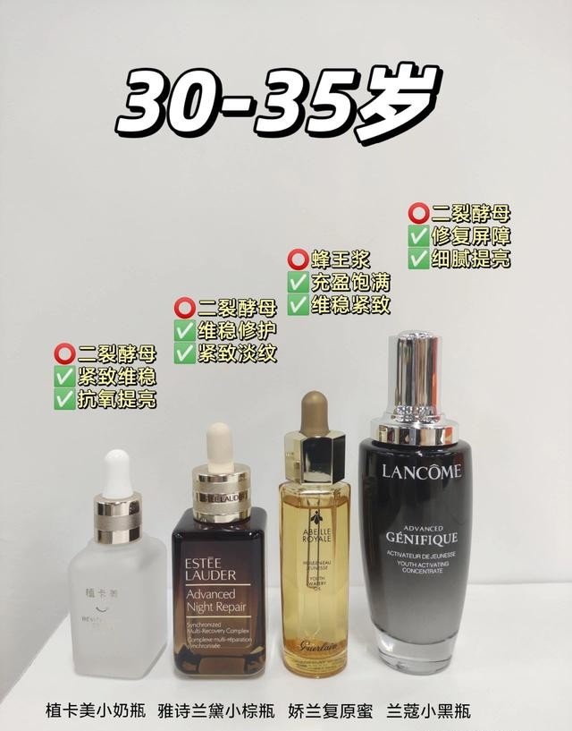 🔹抗老精华推荐:植卡美小奶瓶精华、雅诗兰黛小棕瓶、娇兰复原蜜、兰蔻小黑瓶
