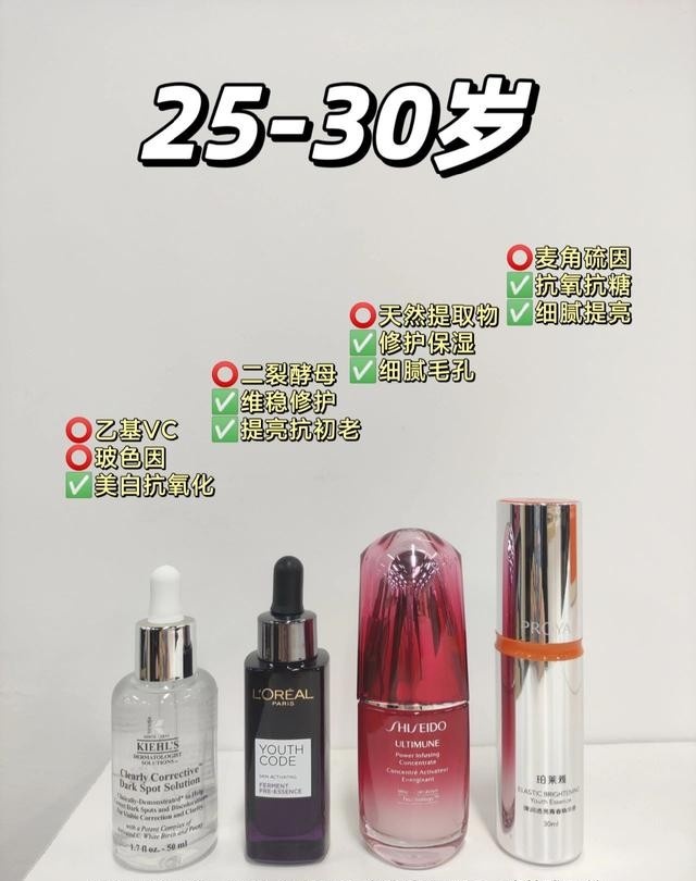 🔹抗老精华推荐:科颜氏安白瓶、欧莱雅黑精华、资生堂红腰子、珀莱雅双抗