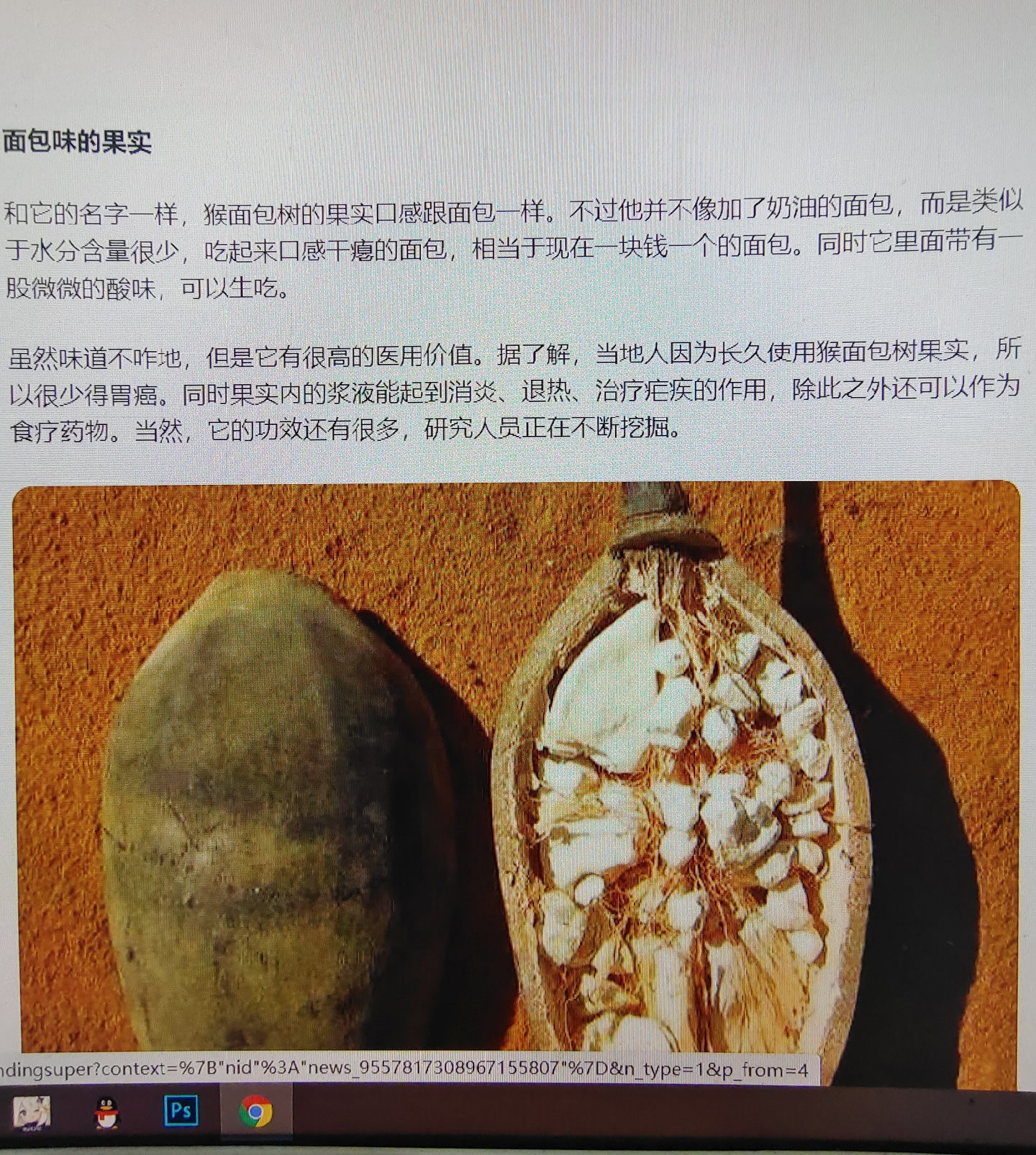 猴面包果口感像干瘪的面包,微酸,可生吃···