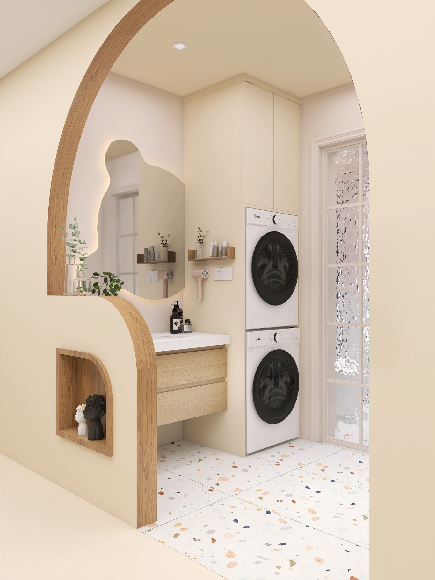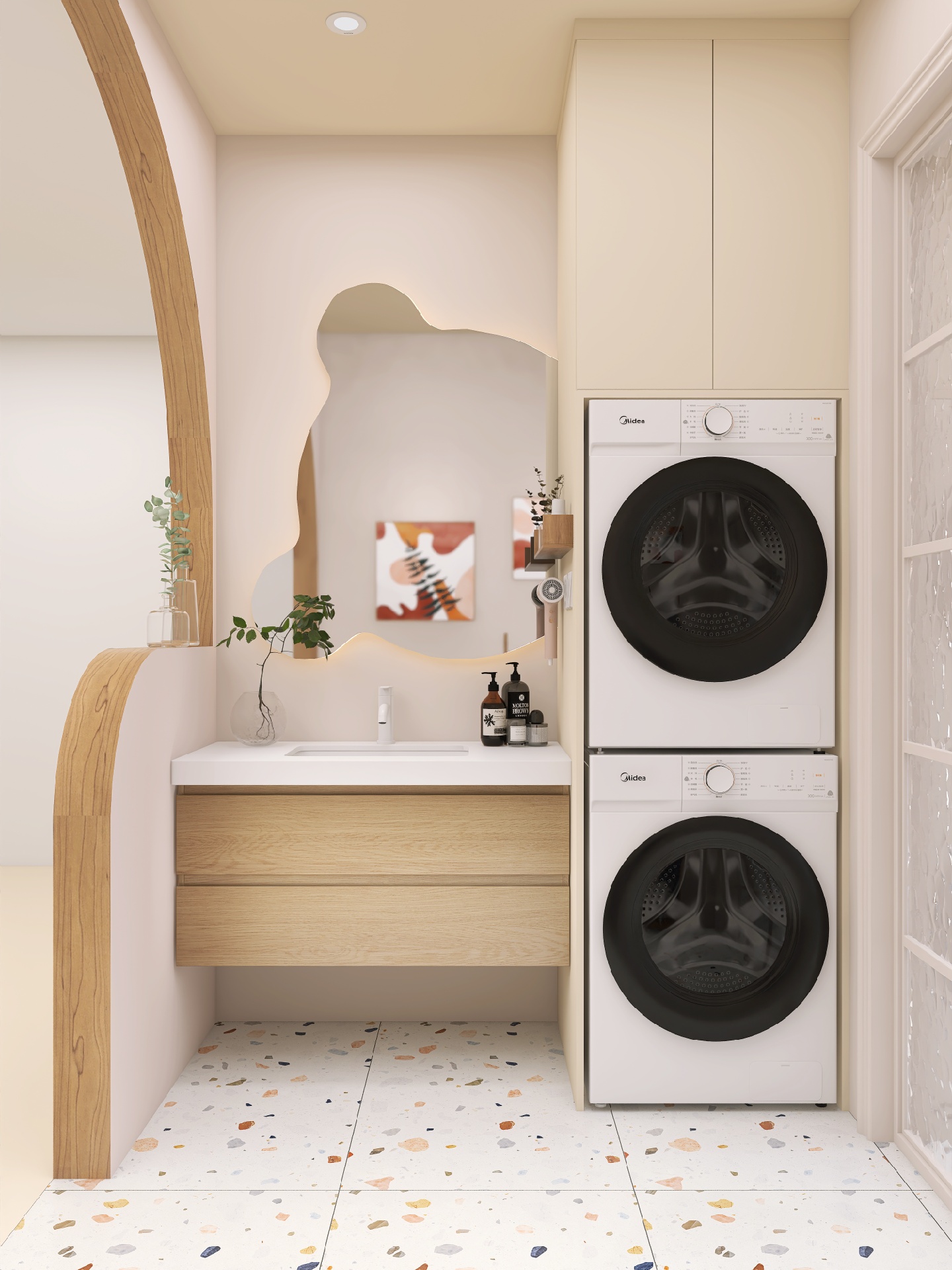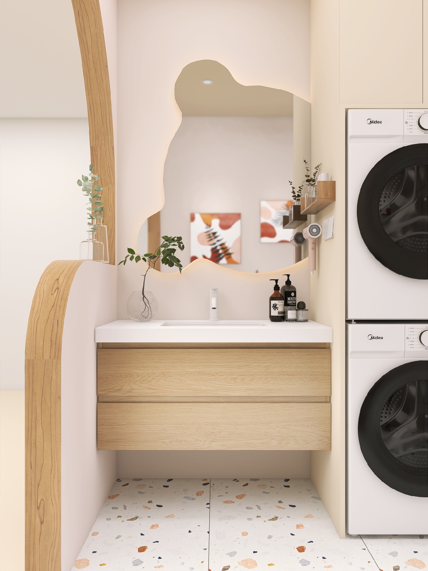 小熊浴室镜配上水磨石绝绝子,整体原木风的浴室看着就很舒服很阳光~