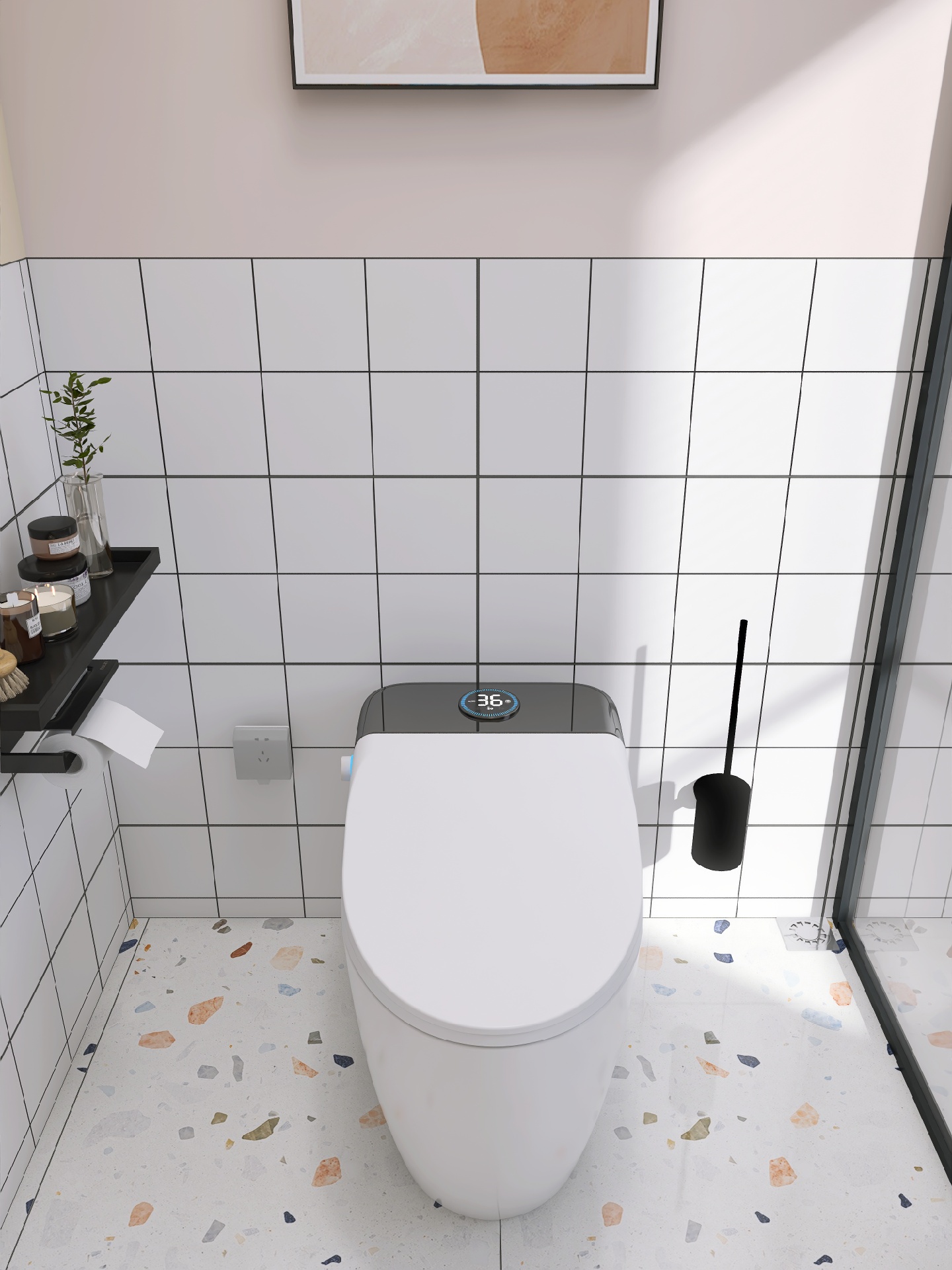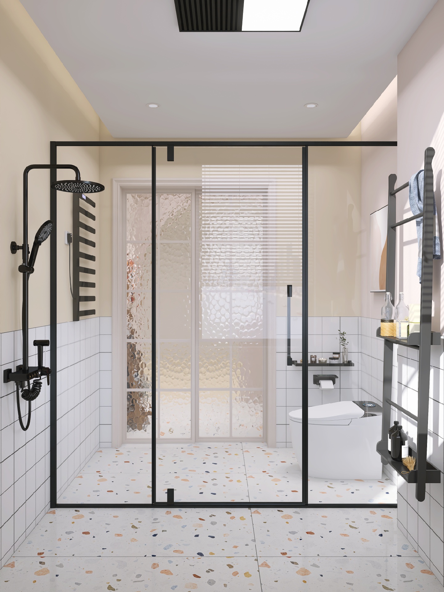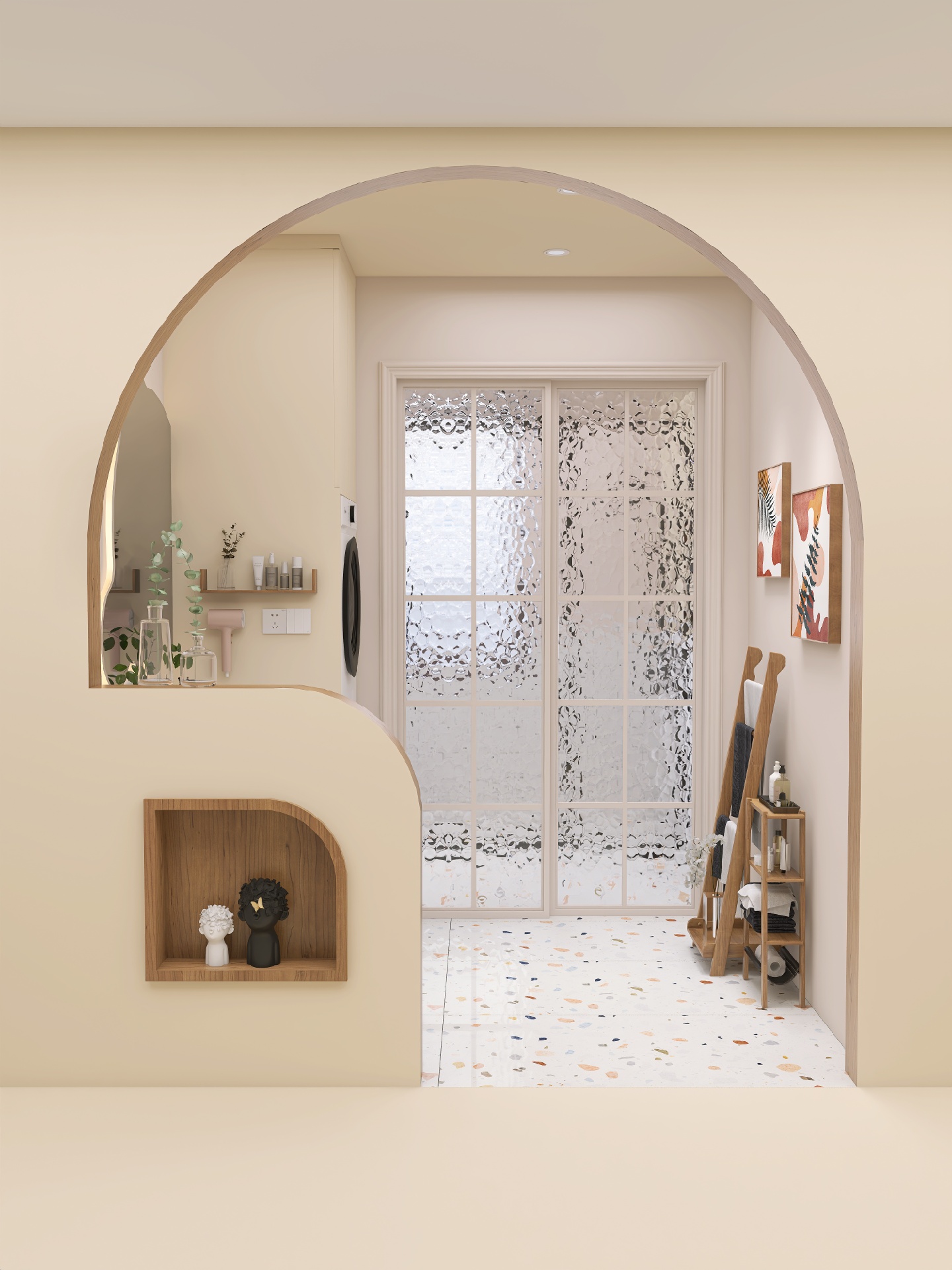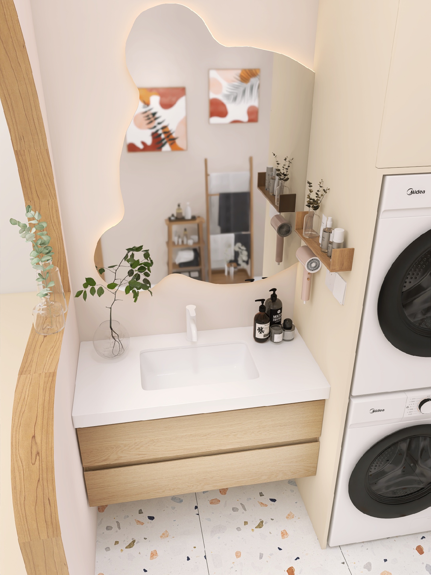 小熊浴室镜配上水磨石绝绝子,整体原木风的浴室看着就很舒服很阳光~