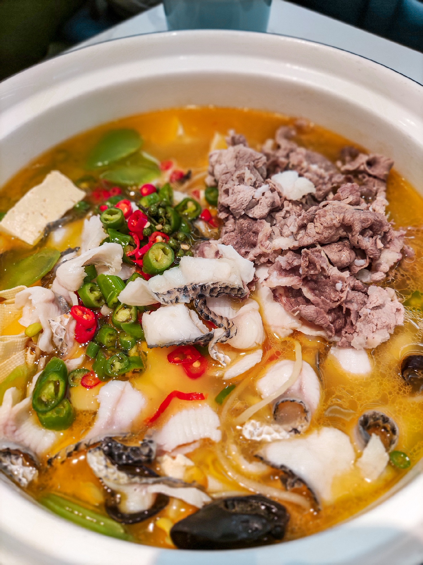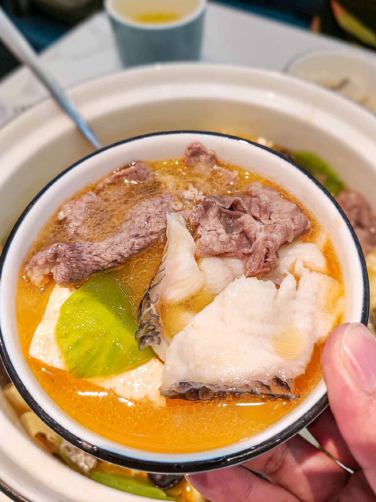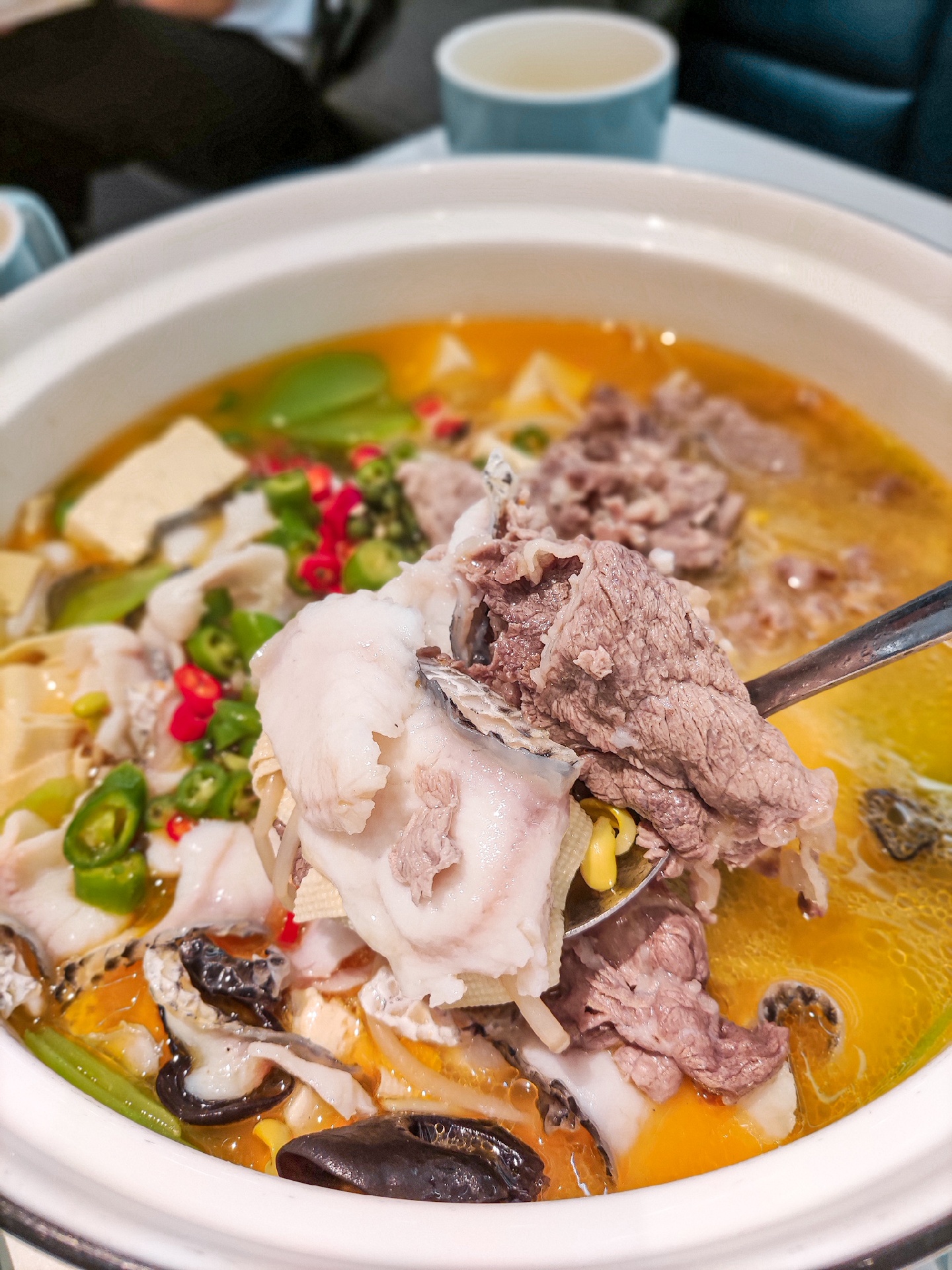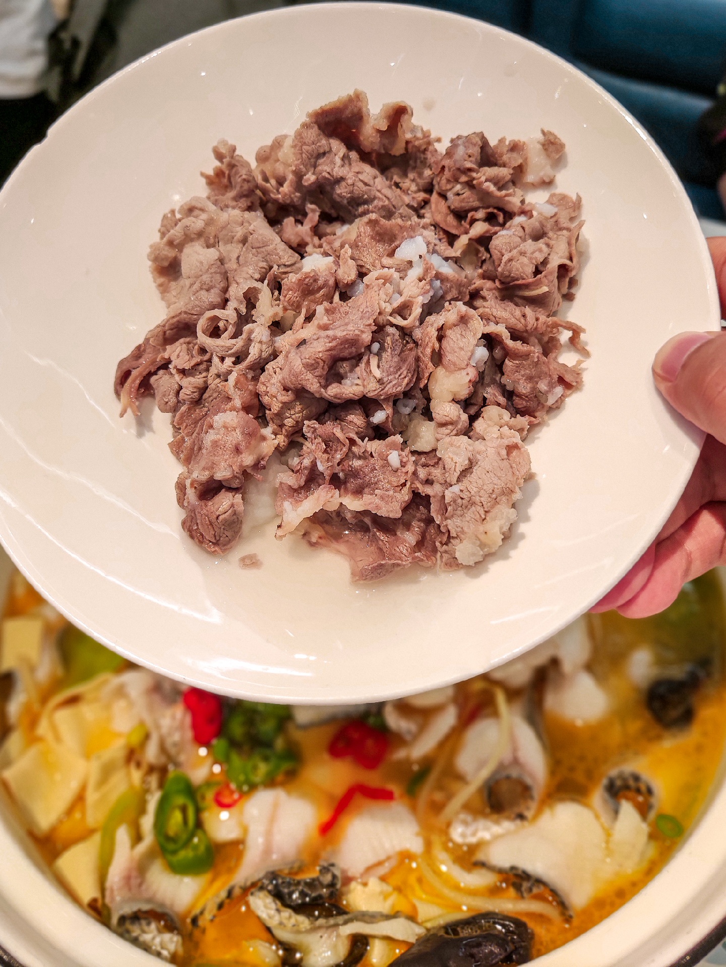原切肥牛:这是可以单独加进去的菜品,肥牛肥瘦相间,肉质鲜嫩,是煮好了直接上来的,加到鱼汤里就可以吃,跟鱼肉绝配。