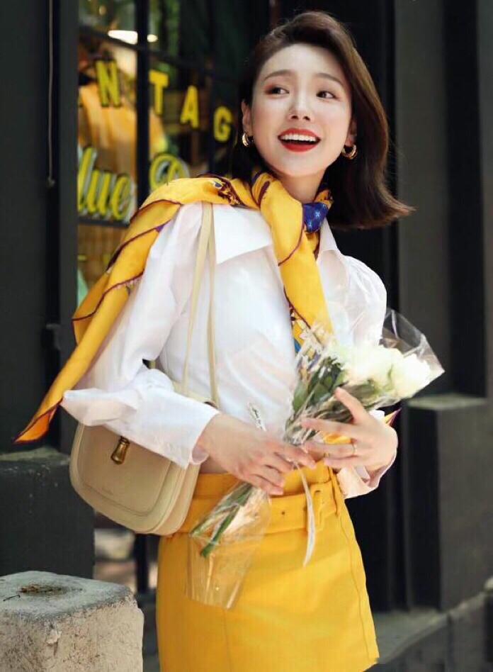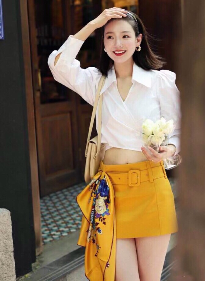 简约的白色衬衫搭配一条十分亮眼黄色短裙,减龄又显时尚的穿搭方式。给人感觉青春减龄同时又优雅女人魅力。