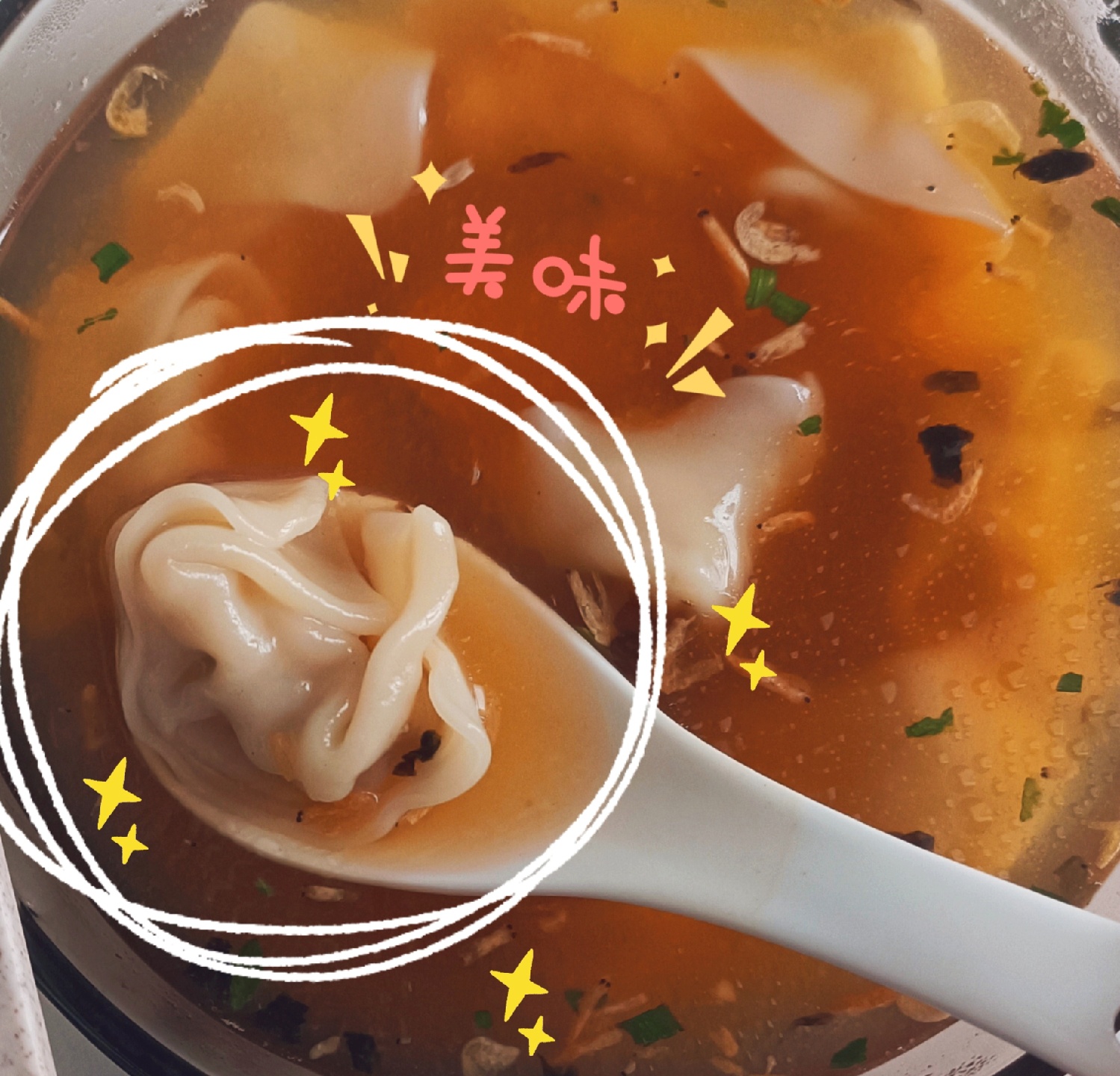 干紫菜,虾皮,一勺酱油、胡椒粉、白砂糖,两勺米醋,最后淋入煮馄饨的面汤,完成!