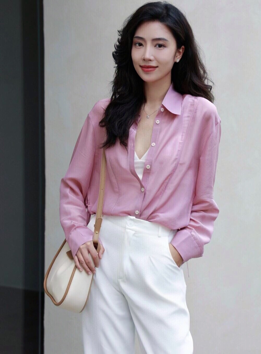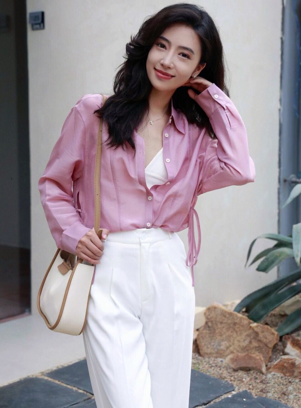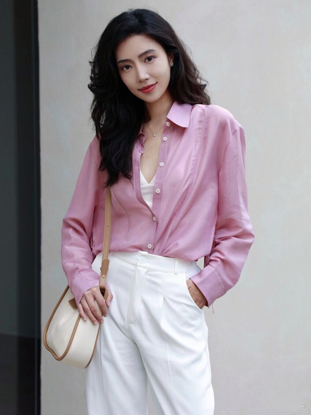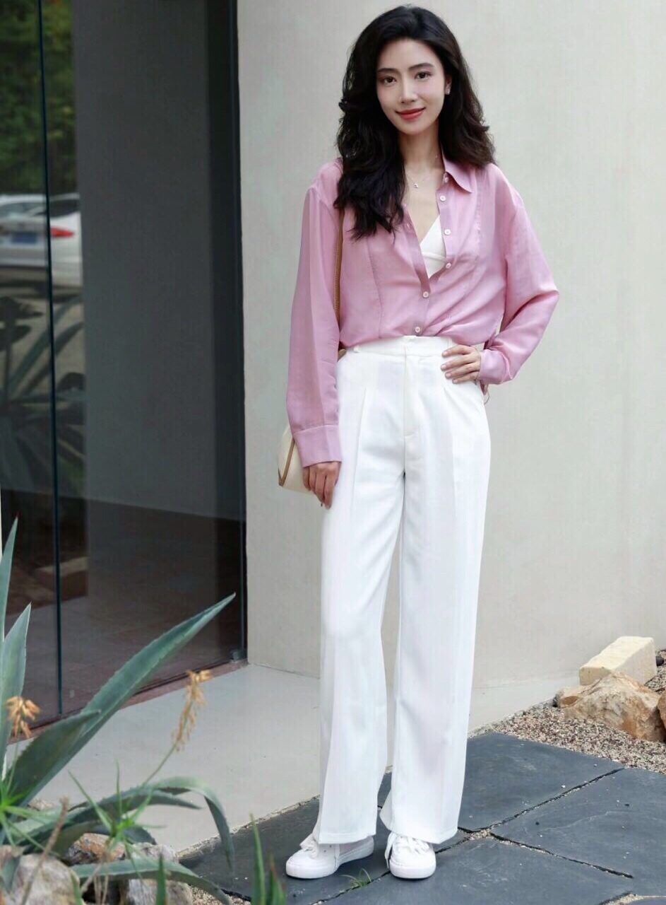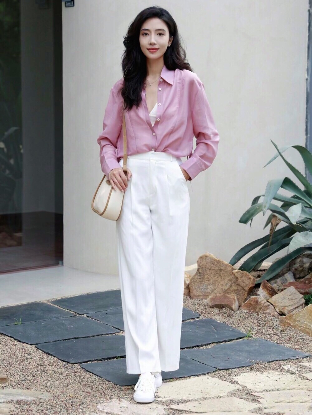 粉色衬衫搭配白色阔腿裤,温柔干练又清爽,显得格外精致。